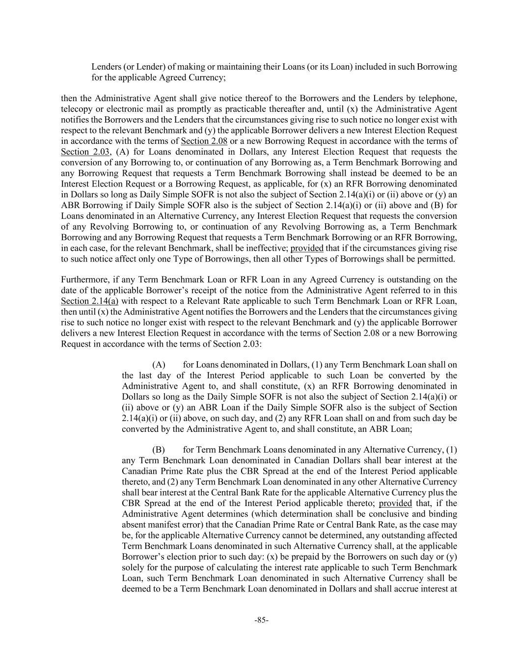 -85- Lenders (or Lender) of making or maintaining their Loans (or its Loan) included in such Borrowing for the applicable Agreed Currency; then the Administrative Agent shall give notice thereof to the Borrowers and the Lenders by telephone, telecopy or electronic mail as promptly as practicable thereafter and, until (x) the Administrative Agent notifies the Borrowers and the Lenders that the circumstances giving rise to such notice no longer exist with respect to the relevant Benchmark and (y) the applicable Borrower delivers a new Interest Election Request in accordance with the terms of Section 2.08 or a new Borrowing Request in accordance with the terms of Section 2.03, (A) for Loans denominated in Dollars, any Interest Election Request that requests the conversion of any Borrowing to, or continuation of any Borrowing as, a Term Benchmark Borrowing and any Borrowing Request that requests a Term Benchmark Borrowing shall instead be deemed to be an Interest Election Request or a Borrowing Request, as applicable, for (x) an RFR Borrowing denominated in Dollars so long as Daily Simple SOFR is not also the subject of Section 2.14(a)(i) or (ii) above or (y) an ABR Borrowing if Daily Simple SOFR also is the subject of Section 2.14(a)(i) or (ii) above and (B) for Loans denominated in an Alternative Currency, any Interest Election Request that requests the conversion of any Revolving Borrowing to, or continuation of any Revolving Borrowing as, a Term Benchmark Borrowing and any Borrowing Request that requests a Term Benchmark Borrowing or an RFR Borrowing, in each case, for the relevant Benchmark, shall be ineffective; provided that if the circumstances giving rise to such notice affect only one Type of Borrowings, then all other Types of Borrowings shall be permitted. Furthermore, if any Term Benchmark Loan or RFR Loan in any Agreed Currency is outstanding on the date of the applicable Borrower’s receipt of the notice from the Administrative Agent referred to in this Section 2.14(a) with respect to a Relevant Rate applicable to such Term Benchmark Loan or RFR Loan, then until (x) the Administrative Agent notifies the Borrowers and the Lenders that the circumstances giving rise to such notice no longer exist with respect to the relevant Benchmark and (y) the applicable Borrower delivers a new Interest Election Request in accordance with the terms of Section 2.08 or a new Borrowing Request in accordance with the terms of Section 2.03: (A) for Loans denominated in Dollars, (1) any Term Benchmark Loan shall on the last day of the Interest Period applicable to such Loan be converted by the Administrative Agent to, and shall constitute, (x) an RFR Borrowing denominated in Dollars so long as the Daily Simple SOFR is not also the subject of Section 2.14(a)(i) or (ii) above or (y) an ABR Loan if the Daily Simple SOFR also is the subject of Section 2.14(a)(i) or (ii) above, on such day, and (2) any RFR Loan shall on and from such day be converted by the Administrative Agent to, and shall constitute, an ABR Loan; (B) for Term Benchmark Loans denominated in any Alternative Currency, (1) any Term Benchmark Loan denominated in Canadian Dollars shall bear interest at the Canadian Prime Rate plus the CBR Spread at the end of the Interest Period applicable thereto, and (2) any Term Benchmark Loan denominated in any other Alternative Currency shall bear interest at the Central Bank Rate for the applicable Alternative Currency plus the CBR Spread at the end of the Interest Period applicable thereto; provided that, if the Administrative Agent determines (which determination shall be conclusive and binding absent manifest error) that the Canadian Prime Rate or Central Bank Rate, as the case may be, for the applicable Alternative Currency cannot be determined, any outstanding affected Term Benchmark Loans denominated in such Alternative Currency shall, at the applicable Borrower’s election prior to such day: (x) be prepaid by the Borrowers on such day or (y) solely for the purpose of calculating the interest rate applicable to such Term Benchmark Loan, such Term Benchmark Loan denominated in such Alternative Currency shall be deemed to be a Term Benchmark Loan denominated in Dollars and shall accrue interest at