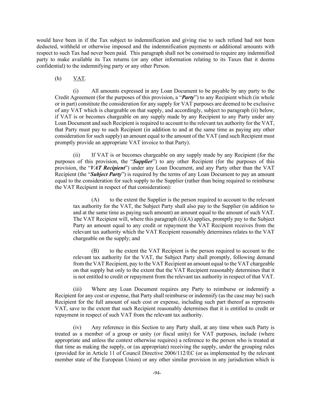 -94- would have been in if the Tax subject to indemnification and giving rise to such refund had not been deducted, withheld or otherwise imposed and the indemnification payments or additional amounts with respect to such Tax had never been paid. This paragraph shall not be construed to require any indemnified party to make available its Tax returns (or any other information relating to its Taxes that it deems confidential) to the indemnifying party or any other Person. (h) VAT. (i) All amounts expressed in any Loan Document to be payable by any party to the Credit Agreement (for the purposes of this provision, a “Party”) to any Recipient which (in whole or in part) constitute the consideration for any supply for VAT purposes are deemed to be exclusive of any VAT which is chargeable on that supply, and accordingly, subject to paragraph (ii) below, if VAT is or becomes chargeable on any supply made by any Recipient to any Party under any Loan Document and such Recipient is required to account to the relevant tax authority for the VAT, that Party must pay to such Recipient (in addition to and at the same time as paying any other consideration for such supply) an amount equal to the amount of the VAT (and such Recipient must promptly provide an appropriate VAT invoice to that Party). (ii) If VAT is or becomes chargeable on any supply made by any Recipient (for the purposes of this provision, the “Supplier”) to any other Recipient (for the purposes of this provision, the “VAT Recipient”) under any Loan Document, and any Party other than the VAT Recipient (the “Subject Party”) is required by the terms of any Loan Document to pay an amount equal to the consideration for such supply to the Supplier (rather than being required to reimburse the VAT Recipient in respect of that consideration): (A) to the extent the Supplier is the person required to account to the relevant tax authority for the VAT, the Subject Party shall also pay to the Supplier (in addition to and at the same time as paying such amount) an amount equal to the amount of such VAT. The VAT Recipient will, where this paragraph (ii)(A) applies, promptly pay to the Subject Party an amount equal to any credit or repayment the VAT Recipient receives from the relevant tax authority which the VAT Recipient reasonably determines relates to the VAT chargeable on the supply; and (B) to the extent the VAT Recipient is the person required to account to the relevant tax authority for the VAT, the Subject Party shall promptly, following demand from the VAT Recipient, pay to the VAT Recipient an amount equal to the VAT chargeable on that supply but only to the extent that the VAT Recipient reasonably determines that it is not entitled to credit or repayment from the relevant tax authority in respect of that VAT. (iii) Where any Loan Document requires any Party to reimburse or indemnify a Recipient for any cost or expense, that Party shall reimburse or indemnify (as the case may be) such Recipient for the full amount of such cost or expense, including such part thereof as represents VAT, save to the extent that such Recipient reasonably determines that it is entitled to credit or repayment in respect of such VAT from the relevant tax authority. (iv) Any reference in this Section to any Party shall, at any time when such Party is treated as a member of a group or unity (or fiscal unity) for VAT purposes, include (where appropriate and unless the context otherwise requires) a reference to the person who is treated at that time as making the supply, or (as appropriate) receiving the supply, under the grouping rules (provided for in Article 11 of Council Directive 2006/112/EC (or as implemented by the relevant member state of the European Union) or any other similar provision in any jurisdiction which is
