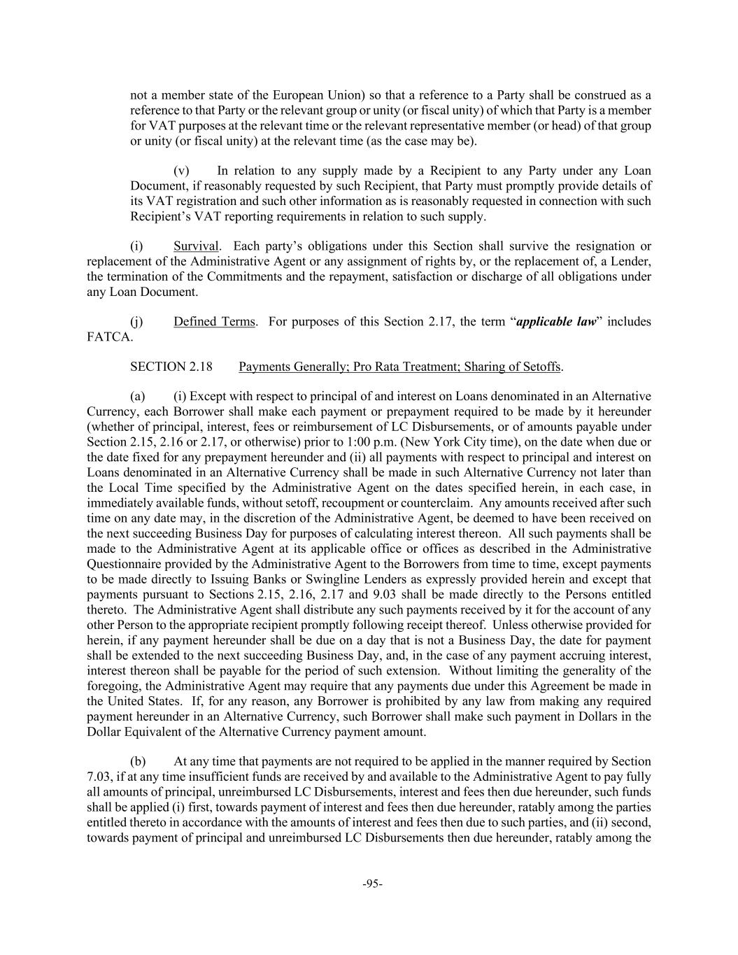-95- not a member state of the European Union) so that a reference to a Party shall be construed as a reference to that Party or the relevant group or unity (or fiscal unity) of which that Party is a member for VAT purposes at the relevant time or the relevant representative member (or head) of that group or unity (or fiscal unity) at the relevant time (as the case may be). (v) In relation to any supply made by a Recipient to any Party under any Loan Document, if reasonably requested by such Recipient, that Party must promptly provide details of its VAT registration and such other information as is reasonably requested in connection with such Recipient’s VAT reporting requirements in relation to such supply. (i) Survival. Each party’s obligations under this Section shall survive the resignation or replacement of the Administrative Agent or any assignment of rights by, or the replacement of, a Lender, the termination of the Commitments and the repayment, satisfaction or discharge of all obligations under any Loan Document. (j) Defined Terms. For purposes of this Section 2.17, the term “applicable law” includes FATCA. SECTION 2.18 Payments Generally; Pro Rata Treatment; Sharing of Setoffs. (a) (i) Except with respect to principal of and interest on Loans denominated in an Alternative Currency, each Borrower shall make each payment or prepayment required to be made by it hereunder (whether of principal, interest, fees or reimbursement of LC Disbursements, or of amounts payable under Section 2.15, 2.16 or 2.17, or otherwise) prior to 1:00 p.m. (New York City time), on the date when due or the date fixed for any prepayment hereunder and (ii) all payments with respect to principal and interest on Loans denominated in an Alternative Currency shall be made in such Alternative Currency not later than the Local Time specified by the Administrative Agent on the dates specified herein, in each case, in immediately available funds, without setoff, recoupment or counterclaim. Any amounts received after such time on any date may, in the discretion of the Administrative Agent, be deemed to have been received on the next succeeding Business Day for purposes of calculating interest thereon. All such payments shall be made to the Administrative Agent at its applicable office or offices as described in the Administrative Questionnaire provided by the Administrative Agent to the Borrowers from time to time, except payments to be made directly to Issuing Banks or Swingline Lenders as expressly provided herein and except that payments pursuant to Sections 2.15, 2.16, 2.17 and 9.03 shall be made directly to the Persons entitled thereto. The Administrative Agent shall distribute any such payments received by it for the account of any other Person to the appropriate recipient promptly following receipt thereof. Unless otherwise provided for herein, if any payment hereunder shall be due on a day that is not a Business Day, the date for payment shall be extended to the next succeeding Business Day, and, in the case of any payment accruing interest, interest thereon shall be payable for the period of such extension. Without limiting the generality of the foregoing, the Administrative Agent may require that any payments due under this Agreement be made in the United States. If, for any reason, any Borrower is prohibited by any law from making any required payment hereunder in an Alternative Currency, such Borrower shall make such payment in Dollars in the Dollar Equivalent of the Alternative Currency payment amount. (b) At any time that payments are not required to be applied in the manner required by Section 7.03, if at any time insufficient funds are received by and available to the Administrative Agent to pay fully all amounts of principal, unreimbursed LC Disbursements, interest and fees then due hereunder, such funds shall be applied (i) first, towards payment of interest and fees then due hereunder, ratably among the parties entitled thereto in accordance with the amounts of interest and fees then due to such parties, and (ii) second, towards payment of principal and unreimbursed LC Disbursements then due hereunder, ratably among the