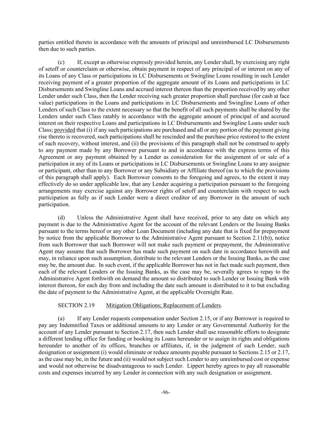 -96- parties entitled thereto in accordance with the amounts of principal and unreimbursed LC Disbursements then due to such parties. (c) If, except as otherwise expressly provided herein, any Lender shall, by exercising any right of setoff or counterclaim or otherwise, obtain payment in respect of any principal of or interest on any of its Loans of any Class or participations in LC Disbursements or Swingline Loans resulting in such Lender receiving payment of a greater proportion of the aggregate amount of its Loans and participations in LC Disbursements and Swingline Loans and accrued interest thereon than the proportion received by any other Lender under such Class, then the Lender receiving such greater proportion shall purchase (for cash at face value) participations in the Loans and participations in LC Disbursements and Swingline Loans of other Lenders of such Class to the extent necessary so that the benefit of all such payments shall be shared by the Lenders under such Class ratably in accordance with the aggregate amount of principal of and accrued interest on their respective Loans and participations in LC Disbursements and Swingline Loans under such Class; provided that (i) if any such participations are purchased and all or any portion of the payment giving rise thereto is recovered, such participations shall be rescinded and the purchase price restored to the extent of such recovery, without interest, and (ii) the provisions of this paragraph shall not be construed to apply to any payment made by any Borrower pursuant to and in accordance with the express terms of this Agreement or any payment obtained by a Lender as consideration for the assignment of or sale of a participation in any of its Loans or participations in LC Disbursements or Swingline Loans to any assignee or participant, other than to any Borrower or any Subsidiary or Affiliate thereof (as to which the provisions of this paragraph shall apply). Each Borrower consents to the foregoing and agrees, to the extent it may effectively do so under applicable law, that any Lender acquiring a participation pursuant to the foregoing arrangements may exercise against any Borrower rights of setoff and counterclaim with respect to such participation as fully as if such Lender were a direct creditor of any Borrower in the amount of such participation. (d) Unless the Administrative Agent shall have received, prior to any date on which any payment is due to the Administrative Agent for the account of the relevant Lenders or the Issuing Banks pursuant to the terms hereof or any other Loan Document (including any date that is fixed for prepayment by notice from the applicable Borrower to the Administrative Agent pursuant to Section 2.11(b)), notice from such Borrower that such Borrower will not make such payment or prepayment, the Administrative Agent may assume that such Borrower has made such payment on such date in accordance herewith and may, in reliance upon such assumption, distribute to the relevant Lenders or the Issuing Banks, as the case may be, the amount due. In such event, if the applicable Borrower has not in fact made such payment, then each of the relevant Lenders or the Issuing Banks, as the case may be, severally agrees to repay to the Administrative Agent forthwith on demand the amount so distributed to such Lender or Issuing Bank with interest thereon, for each day from and including the date such amount is distributed to it to but excluding the date of payment to the Administrative Agent, at the applicable Overnight Rate. SECTION 2.19 Mitigation Obligations; Replacement of Lenders. (a) If any Lender requests compensation under Section 2.15, or if any Borrower is required to pay any Indemnified Taxes or additional amounts to any Lender or any Governmental Authority for the account of any Lender pursuant to Section 2.17, then such Lender shall use reasonable efforts to designate a different lending office for funding or booking its Loans hereunder or to assign its rights and obligations hereunder to another of its offices, branches or affiliates, if, in the judgment of such Lender, such designation or assignment (i) would eliminate or reduce amounts payable pursuant to Sections 2.15 or 2.17, as the case may be, in the future and (ii) would not subject such Lender to any unreimbursed cost or expense and would not otherwise be disadvantageous to such Lender. Lippert hereby agrees to pay all reasonable costs and expenses incurred by any Lender in connection with any such designation or assignment.