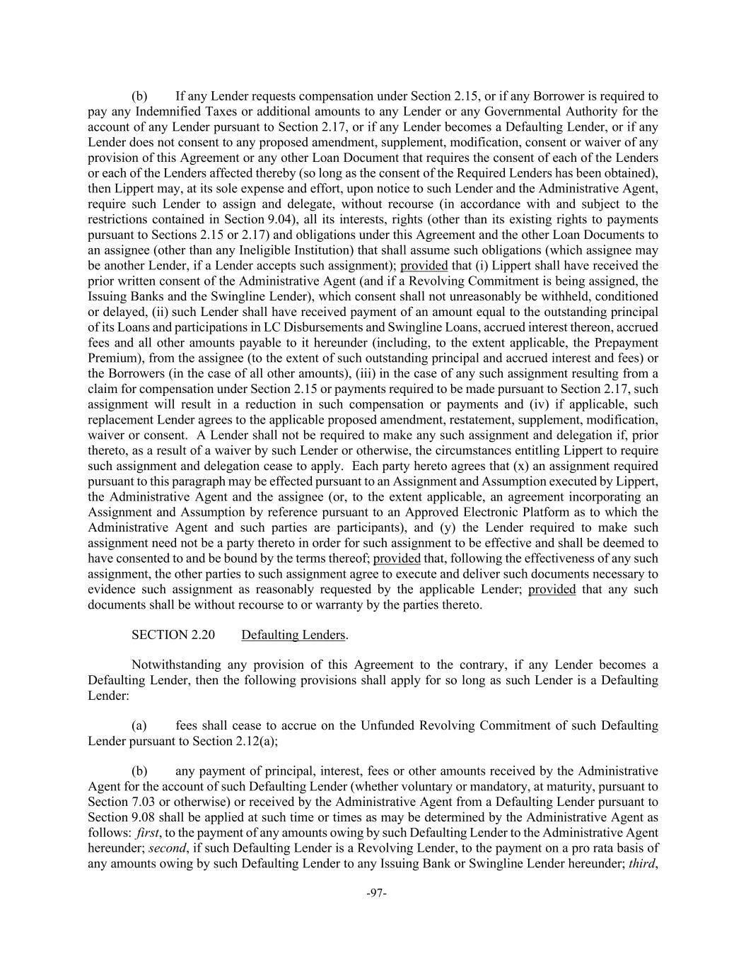 -97- (b) If any Lender requests compensation under Section 2.15, or if any Borrower is required to pay any Indemnified Taxes or additional amounts to any Lender or any Governmental Authority for the account of any Lender pursuant to Section 2.17, or if any Lender becomes a Defaulting Lender, or if any Lender does not consent to any proposed amendment, supplement, modification, consent or waiver of any provision of this Agreement or any other Loan Document that requires the consent of each of the Lenders or each of the Lenders affected thereby (so long as the consent of the Required Lenders has been obtained), then Lippert may, at its sole expense and effort, upon notice to such Lender and the Administrative Agent, require such Lender to assign and delegate, without recourse (in accordance with and subject to the restrictions contained in Section 9.04), all its interests, rights (other than its existing rights to payments pursuant to Sections 2.15 or 2.17) and obligations under this Agreement and the other Loan Documents to an assignee (other than any Ineligible Institution) that shall assume such obligations (which assignee may be another Lender, if a Lender accepts such assignment); provided that (i) Lippert shall have received the prior written consent of the Administrative Agent (and if a Revolving Commitment is being assigned, the Issuing Banks and the Swingline Lender), which consent shall not unreasonably be withheld, conditioned or delayed, (ii) such Lender shall have received payment of an amount equal to the outstanding principal of its Loans and participations in LC Disbursements and Swingline Loans, accrued interest thereon, accrued fees and all other amounts payable to it hereunder (including, to the extent applicable, the Prepayment Premium), from the assignee (to the extent of such outstanding principal and accrued interest and fees) or the Borrowers (in the case of all other amounts), (iii) in the case of any such assignment resulting from a claim for compensation under Section 2.15 or payments required to be made pursuant to Section 2.17, such assignment will result in a reduction in such compensation or payments and (iv) if applicable, such replacement Lender agrees to the applicable proposed amendment, restatement, supplement, modification, waiver or consent. A Lender shall not be required to make any such assignment and delegation if, prior thereto, as a result of a waiver by such Lender or otherwise, the circumstances entitling Lippert to require such assignment and delegation cease to apply. Each party hereto agrees that (x) an assignment required pursuant to this paragraph may be effected pursuant to an Assignment and Assumption executed by Lippert, the Administrative Agent and the assignee (or, to the extent applicable, an agreement incorporating an Assignment and Assumption by reference pursuant to an Approved Electronic Platform as to which the Administrative Agent and such parties are participants), and (y) the Lender required to make such assignment need not be a party thereto in order for such assignment to be effective and shall be deemed to have consented to and be bound by the terms thereof; provided that, following the effectiveness of any such assignment, the other parties to such assignment agree to execute and deliver such documents necessary to evidence such assignment as reasonably requested by the applicable Lender; provided that any such documents shall be without recourse to or warranty by the parties thereto. SECTION 2.20 Defaulting Lenders. Notwithstanding any provision of this Agreement to the contrary, if any Lender becomes a Defaulting Lender, then the following provisions shall apply for so long as such Lender is a Defaulting Lender: (a) fees shall cease to accrue on the Unfunded Revolving Commitment of such Defaulting Lender pursuant to Section 2.12(a); (b) any payment of principal, interest, fees or other amounts received by the Administrative Agent for the account of such Defaulting Lender (whether voluntary or mandatory, at maturity, pursuant to Section 7.03 or otherwise) or received by the Administrative Agent from a Defaulting Lender pursuant to Section 9.08 shall be applied at such time or times as may be determined by the Administrative Agent as follows: first, to the payment of any amounts owing by such Defaulting Lender to the Administrative Agent hereunder; second, if such Defaulting Lender is a Revolving Lender, to the payment on a pro rata basis of any amounts owing by such Defaulting Lender to any Issuing Bank or Swingline Lender hereunder; third,