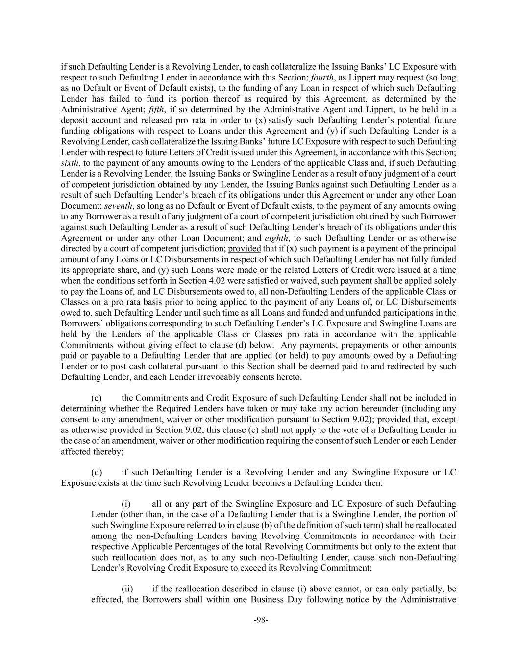 -98- if such Defaulting Lender is a Revolving Lender, to cash collateralize the Issuing Banks’ LC Exposure with respect to such Defaulting Lender in accordance with this Section; fourth, as Lippert may request (so long as no Default or Event of Default exists), to the funding of any Loan in respect of which such Defaulting Lender has failed to fund its portion thereof as required by this Agreement, as determined by the Administrative Agent; fifth, if so determined by the Administrative Agent and Lippert, to be held in a deposit account and released pro rata in order to (x) satisfy such Defaulting Lender’s potential future funding obligations with respect to Loans under this Agreement and (y) if such Defaulting Lender is a Revolving Lender, cash collateralize the Issuing Banks’ future LC Exposure with respect to such Defaulting Lender with respect to future Letters of Credit issued under this Agreement, in accordance with this Section; sixth, to the payment of any amounts owing to the Lenders of the applicable Class and, if such Defaulting Lender is a Revolving Lender, the Issuing Banks or Swingline Lender as a result of any judgment of a court of competent jurisdiction obtained by any Lender, the Issuing Banks against such Defaulting Lender as a result of such Defaulting Lender’s breach of its obligations under this Agreement or under any other Loan Document; seventh, so long as no Default or Event of Default exists, to the payment of any amounts owing to any Borrower as a result of any judgment of a court of competent jurisdiction obtained by such Borrower against such Defaulting Lender as a result of such Defaulting Lender’s breach of its obligations under this Agreement or under any other Loan Document; and eighth, to such Defaulting Lender or as otherwise directed by a court of competent jurisdiction; provided that if (x) such payment is a payment of the principal amount of any Loans or LC Disbursements in respect of which such Defaulting Lender has not fully funded its appropriate share, and (y) such Loans were made or the related Letters of Credit were issued at a time when the conditions set forth in Section 4.02 were satisfied or waived, such payment shall be applied solely to pay the Loans of, and LC Disbursements owed to, all non-Defaulting Lenders of the applicable Class or Classes on a pro rata basis prior to being applied to the payment of any Loans of, or LC Disbursements owed to, such Defaulting Lender until such time as all Loans and funded and unfunded participations in the Borrowers’ obligations corresponding to such Defaulting Lender’s LC Exposure and Swingline Loans are held by the Lenders of the applicable Class or Classes pro rata in accordance with the applicable Commitments without giving effect to clause (d) below. Any payments, prepayments or other amounts paid or payable to a Defaulting Lender that are applied (or held) to pay amounts owed by a Defaulting Lender or to post cash collateral pursuant to this Section shall be deemed paid to and redirected by such Defaulting Lender, and each Lender irrevocably consents hereto. (c) the Commitments and Credit Exposure of such Defaulting Lender shall not be included in determining whether the Required Lenders have taken or may take any action hereunder (including any consent to any amendment, waiver or other modification pursuant to Section 9.02); provided that, except as otherwise provided in Section 9.02, this clause (c) shall not apply to the vote of a Defaulting Lender in the case of an amendment, waiver or other modification requiring the consent of such Lender or each Lender affected thereby; (d) if such Defaulting Lender is a Revolving Lender and any Swingline Exposure or LC Exposure exists at the time such Revolving Lender becomes a Defaulting Lender then: (i) all or any part of the Swingline Exposure and LC Exposure of such Defaulting Lender (other than, in the case of a Defaulting Lender that is a Swingline Lender, the portion of such Swingline Exposure referred to in clause (b) of the definition of such term) shall be reallocated among the non-Defaulting Lenders having Revolving Commitments in accordance with their respective Applicable Percentages of the total Revolving Commitments but only to the extent that such reallocation does not, as to any such non-Defaulting Lender, cause such non-Defaulting Lender’s Revolving Credit Exposure to exceed its Revolving Commitment; (ii) if the reallocation described in clause (i) above cannot, or can only partially, be effected, the Borrowers shall within one Business Day following notice by the Administrative