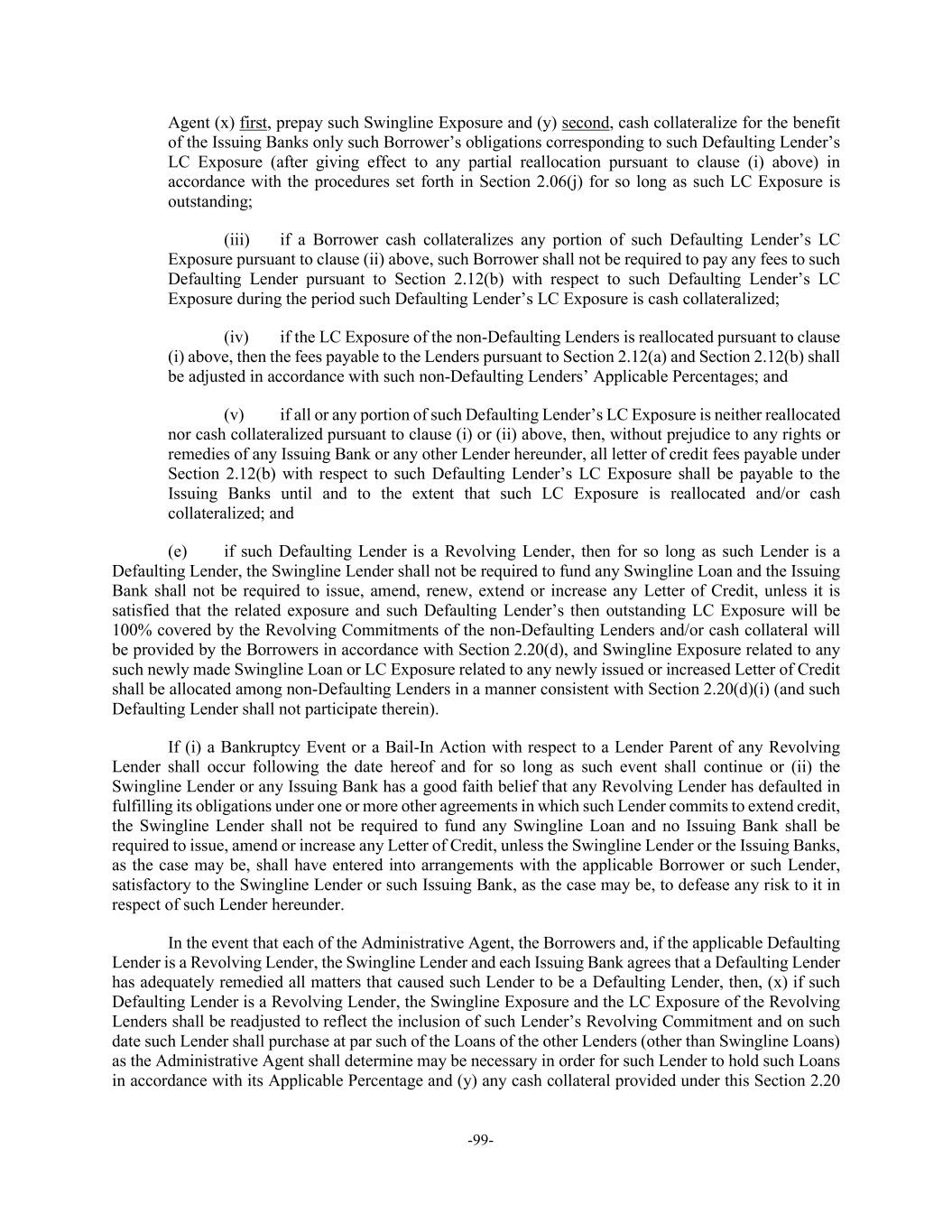 -99- Agent (x) first, prepay such Swingline Exposure and (y) second, cash collateralize for the benefit of the Issuing Banks only such Borrower’s obligations corresponding to such Defaulting Lender’s LC Exposure (after giving effect to any partial reallocation pursuant to clause (i) above) in accordance with the procedures set forth in Section 2.06(j) for so long as such LC Exposure is outstanding; (iii) if a Borrower cash collateralizes any portion of such Defaulting Lender’s LC Exposure pursuant to clause (ii) above, such Borrower shall not be required to pay any fees to such Defaulting Lender pursuant to Section 2.12(b) with respect to such Defaulting Lender’s LC Exposure during the period such Defaulting Lender’s LC Exposure is cash collateralized; (iv) if the LC Exposure of the non-Defaulting Lenders is reallocated pursuant to clause (i) above, then the fees payable to the Lenders pursuant to Section 2.12(a) and Section 2.12(b) shall be adjusted in accordance with such non-Defaulting Lenders’ Applicable Percentages; and (v) if all or any portion of such Defaulting Lender’s LC Exposure is neither reallocated nor cash collateralized pursuant to clause (i) or (ii) above, then, without prejudice to any rights or remedies of any Issuing Bank or any other Lender hereunder, all letter of credit fees payable under Section 2.12(b) with respect to such Defaulting Lender’s LC Exposure shall be payable to the Issuing Banks until and to the extent that such LC Exposure is reallocated and/or cash collateralized; and (e) if such Defaulting Lender is a Revolving Lender, then for so long as such Lender is a Defaulting Lender, the Swingline Lender shall not be required to fund any Swingline Loan and the Issuing Bank shall not be required to issue, amend, renew, extend or increase any Letter of Credit, unless it is satisfied that the related exposure and such Defaulting Lender’s then outstanding LC Exposure will be 100% covered by the Revolving Commitments of the non-Defaulting Lenders and/or cash collateral will be provided by the Borrowers in accordance with Section 2.20(d), and Swingline Exposure related to any such newly made Swingline Loan or LC Exposure related to any newly issued or increased Letter of Credit shall be allocated among non-Defaulting Lenders in a manner consistent with Section 2.20(d)(i) (and such Defaulting Lender shall not participate therein). If (i) a Bankruptcy Event or a Bail-In Action with respect to a Lender Parent of any Revolving Lender shall occur following the date hereof and for so long as such event shall continue or (ii) the Swingline Lender or any Issuing Bank has a good faith belief that any Revolving Lender has defaulted in fulfilling its obligations under one or more other agreements in which such Lender commits to extend credit, the Swingline Lender shall not be required to fund any Swingline Loan and no Issuing Bank shall be required to issue, amend or increase any Letter of Credit, unless the Swingline Lender or the Issuing Banks, as the case may be, shall have entered into arrangements with the applicable Borrower or such Lender, satisfactory to the Swingline Lender or such Issuing Bank, as the case may be, to defease any risk to it in respect of such Lender hereunder. In the event that each of the Administrative Agent, the Borrowers and, if the applicable Defaulting Lender is a Revolving Lender, the Swingline Lender and each Issuing Bank agrees that a Defaulting Lender has adequately remedied all matters that caused such Lender to be a Defaulting Lender, then, (x) if such Defaulting Lender is a Revolving Lender, the Swingline Exposure and the LC Exposure of the Revolving Lenders shall be readjusted to reflect the inclusion of such Lender’s Revolving Commitment and on such date such Lender shall purchase at par such of the Loans of the other Lenders (other than Swingline Loans) as the Administrative Agent shall determine may be necessary in order for such Lender to hold such Loans in accordance with its Applicable Percentage and (y) any cash collateral provided under this Section 2.20