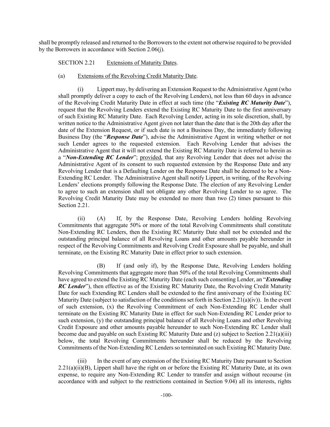 -100- shall be promptly released and returned to the Borrowers to the extent not otherwise required to be provided by the Borrowers in accordance with Section 2.06(j). SECTION 2.21 Extensions of Maturity Dates. (a) Extensions of the Revolving Credit Maturity Date. (i) Lippert may, by delivering an Extension Request to the Administrative Agent (who shall promptly deliver a copy to each of the Revolving Lenders), not less than 60 days in advance of the Revolving Credit Maturity Date in effect at such time (the “Existing RC Maturity Date”), request that the Revolving Lenders extend the Existing RC Maturity Date to the first anniversary of such Existing RC Maturity Date. Each Revolving Lender, acting in its sole discretion, shall, by written notice to the Administrative Agent given not later than the date that is the 20th day after the date of the Extension Request, or if such date is not a Business Day, the immediately following Business Day (the “Response Date”), advise the Administrative Agent in writing whether or not such Lender agrees to the requested extension. Each Revolving Lender that advises the Administrative Agent that it will not extend the Existing RC Maturity Date is referred to herein as a “Non-Extending RC Lender”; provided, that any Revolving Lender that does not advise the Administrative Agent of its consent to such requested extension by the Response Date and any Revolving Lender that is a Defaulting Lender on the Response Date shall be deemed to be a Non- Extending RC Lender. The Administrative Agent shall notify Lippert, in writing, of the Revolving Lenders’ elections promptly following the Response Date. The election of any Revolving Lender to agree to such an extension shall not obligate any other Revolving Lender to so agree. The Revolving Credit Maturity Date may be extended no more than two (2) times pursuant to this Section 2.21. (ii) (A) If, by the Response Date, Revolving Lenders holding Revolving Commitments that aggregate 50% or more of the total Revolving Commitments shall constitute Non-Extending RC Lenders, then the Existing RC Maturity Date shall not be extended and the outstanding principal balance of all Revolving Loans and other amounts payable hereunder in respect of the Revolving Commitments and Revolving Credit Exposure shall be payable, and shall terminate, on the Existing RC Maturity Date in effect prior to such extension. (B) If (and only if), by the Response Date, Revolving Lenders holding Revolving Commitments that aggregate more than 50% of the total Revolving Commitments shall have agreed to extend the Existing RC Maturity Date (each such consenting Lender, an “Extending RC Lender”), then effective as of the Existing RC Maturity Date, the Revolving Credit Maturity Date for such Extending RC Lenders shall be extended to the first anniversary of the Existing EC Maturity Date (subject to satisfaction of the conditions set forth in Section 2.21(a)(iv)). In the event of such extension, (x) the Revolving Commitment of each Non-Extending RC Lender shall terminate on the Existing RC Maturity Date in effect for such Non-Extending RC Lender prior to such extension, (y) the outstanding principal balance of all Revolving Loans and other Revolving Credit Exposure and other amounts payable hereunder to such Non-Extending RC Lender shall become due and payable on such Existing RC Maturity Date and (z) subject to Section 2.21(a)(iii) below, the total Revolving Commitments hereunder shall be reduced by the Revolving Commitments of the Non-Extending RC Lenders so terminated on such Existing RC Maturity Date. (iii) In the event of any extension of the Existing RC Maturity Date pursuant to Section 2.21(a)(ii)(B), Lippert shall have the right on or before the Existing RC Maturity Date, at its own expense, to require any Non-Extending RC Lender to transfer and assign without recourse (in accordance with and subject to the restrictions contained in Section 9.04) all its interests, rights