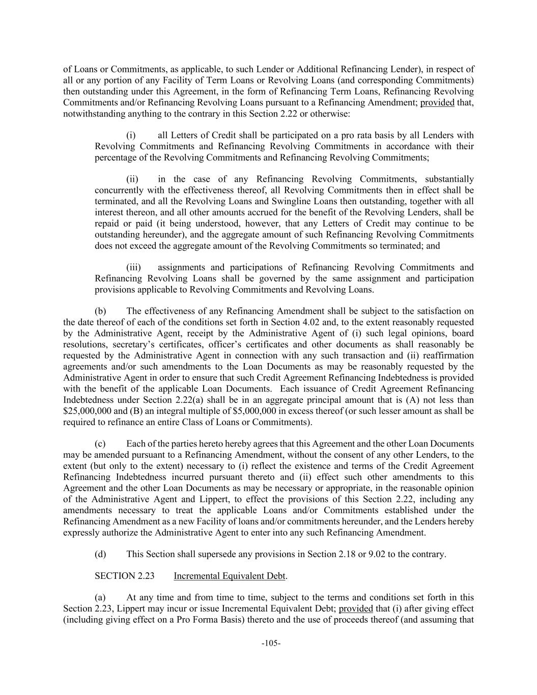 -105- of Loans or Commitments, as applicable, to such Lender or Additional Refinancing Lender), in respect of all or any portion of any Facility of Term Loans or Revolving Loans (and corresponding Commitments) then outstanding under this Agreement, in the form of Refinancing Term Loans, Refinancing Revolving Commitments and/or Refinancing Revolving Loans pursuant to a Refinancing Amendment; provided that, notwithstanding anything to the contrary in this Section 2.22 or otherwise: (i) all Letters of Credit shall be participated on a pro rata basis by all Lenders with Revolving Commitments and Refinancing Revolving Commitments in accordance with their percentage of the Revolving Commitments and Refinancing Revolving Commitments; (ii) in the case of any Refinancing Revolving Commitments, substantially concurrently with the effectiveness thereof, all Revolving Commitments then in effect shall be terminated, and all the Revolving Loans and Swingline Loans then outstanding, together with all interest thereon, and all other amounts accrued for the benefit of the Revolving Lenders, shall be repaid or paid (it being understood, however, that any Letters of Credit may continue to be outstanding hereunder), and the aggregate amount of such Refinancing Revolving Commitments does not exceed the aggregate amount of the Revolving Commitments so terminated; and (iii) assignments and participations of Refinancing Revolving Commitments and Refinancing Revolving Loans shall be governed by the same assignment and participation provisions applicable to Revolving Commitments and Revolving Loans. (b) The effectiveness of any Refinancing Amendment shall be subject to the satisfaction on the date thereof of each of the conditions set forth in Section 4.02 and, to the extent reasonably requested by the Administrative Agent, receipt by the Administrative Agent of (i) such legal opinions, board resolutions, secretary’s certificates, officer’s certificates and other documents as shall reasonably be requested by the Administrative Agent in connection with any such transaction and (ii) reaffirmation agreements and/or such amendments to the Loan Documents as may be reasonably requested by the Administrative Agent in order to ensure that such Credit Agreement Refinancing Indebtedness is provided with the benefit of the applicable Loan Documents. Each issuance of Credit Agreement Refinancing Indebtedness under Section 2.22(a) shall be in an aggregate principal amount that is (A) not less than $25,000,000 and (B) an integral multiple of $5,000,000 in excess thereof (or such lesser amount as shall be required to refinance an entire Class of Loans or Commitments). (c) Each of the parties hereto hereby agrees that this Agreement and the other Loan Documents may be amended pursuant to a Refinancing Amendment, without the consent of any other Lenders, to the extent (but only to the extent) necessary to (i) reflect the existence and terms of the Credit Agreement Refinancing Indebtedness incurred pursuant thereto and (ii) effect such other amendments to this Agreement and the other Loan Documents as may be necessary or appropriate, in the reasonable opinion of the Administrative Agent and Lippert, to effect the provisions of this Section 2.22, including any amendments necessary to treat the applicable Loans and/or Commitments established under the Refinancing Amendment as a new Facility of loans and/or commitments hereunder, and the Lenders hereby expressly authorize the Administrative Agent to enter into any such Refinancing Amendment. (d) This Section shall supersede any provisions in Section 2.18 or 9.02 to the contrary. SECTION 2.23 Incremental Equivalent Debt. (a) At any time and from time to time, subject to the terms and conditions set forth in this Section 2.23, Lippert may incur or issue Incremental Equivalent Debt; provided that (i) after giving effect (including giving effect on a Pro Forma Basis) thereto and the use of proceeds thereof (and assuming that