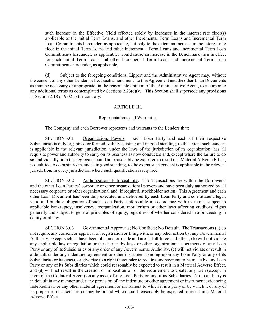 -108- such increase in the Effective Yield effected solely by increases in the interest rate floor(s) applicable to the initial Term Loans, and other Incremental Term Loans and Incremental Term Loan Commitments hereunder, as applicable, but only to the extent an increase in the interest rate floor in the initial Term Loans and other Incremental Term Loans and Incremental Term Loan Commitments hereunder, as applicable, would cause an increase in the Benchmark then in effect for such initial Term Loans and other Incremental Term Loans and Incremental Term Loan Commitments hereunder, as applicable. (d) Subject to the foregoing conditions, Lippert and the Administrative Agent may, without the consent of any other Lenders, effect such amendments to this Agreement and the other Loan Documents as may be necessary or appropriate, in the reasonable opinion of the Administrative Agent, to incorporate any additional terms as contemplated by Sections 2.23(c)(v). This Section shall supersede any provisions in Section 2.18 or 9.02 to the contrary. ARTICLE III. Representations and Warranties The Company and each Borrower represents and warrants to the Lenders that: SECTION 3.01 Organization; Powers. Each Loan Party and each of their respective Subsidiaries is duly organized or formed, validly existing and in good standing, to the extent such concept is applicable in the relevant jurisdiction, under the laws of the jurisdiction of its organization, has all requisite power and authority to carry on its business as now conducted and, except where the failure to do so, individually or in the aggregate, could not reasonably be expected to result in a Material Adverse Effect, is qualified to do business in, and is in good standing, to the extent such concept is applicable in the relevant jurisdiction, in every jurisdiction where such qualification is required. SECTION 3.02 Authorization; Enforceability. The Transactions are within the Borrowers’ and the other Loan Parties’ corporate or other organizational powers and have been duly authorized by all necessary corporate or other organizational and, if required, stockholder action. This Agreement and each other Loan Document has been duly executed and delivered by each Loan Party and constitutes a legal, valid and binding obligation of such Loan Party, enforceable in accordance with its terms, subject to applicable bankruptcy, insolvency, reorganization, moratorium or other laws affecting creditors’ rights generally and subject to general principles of equity, regardless of whether considered in a proceeding in equity or at law. SECTION 3.03 Governmental Approvals; No Conflicts; No Default. The Transactions (a) do not require any consent or approval of, registration or filing with, or any other action by, any Governmental Authority, except such as have been obtained or made and are in full force and effect, (b) will not violate any applicable law or regulation or the charter, by-laws or other organizational documents of any Loan Party or any of its Subsidiaries or any order of any Governmental Authority, (c) will not violate or result in a default under any indenture, agreement or other instrument binding upon any Loan Party or any of its Subsidiaries or its assets, or give rise to a right thereunder to require any payment to be made by any Loan Party or any of its Subsidiaries which could reasonably be expected to result in a Material Adverse Effect, and (d) will not result in the creation or imposition of, or the requirement to create, any Lien (except in favor of the Collateral Agent) on any asset of any Loan Party or any of its Subsidiaries. No Loan Party is in default in any manner under any provision of any indenture or other agreement or instrument evidencing Indebtedness, or any other material agreement or instrument to which it is a party or by which it or any of its properties or assets are or may be bound which could reasonably be expected to result in a Material Adverse Effect.