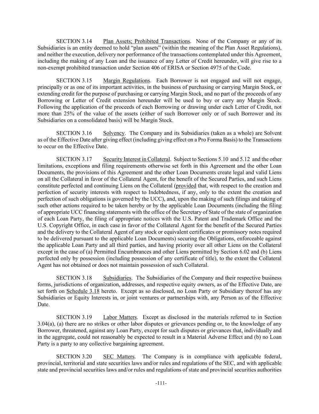 -111- SECTION 3.14 Plan Assets; Prohibited Transactions. None of the Company or any of its Subsidiaries is an entity deemed to hold “plan assets” (within the meaning of the Plan Asset Regulations), and neither the execution, delivery nor performance of the transactions contemplated under this Agreement, including the making of any Loan and the issuance of any Letter of Credit hereunder, will give rise to a non-exempt prohibited transaction under Section 406 of ERISA or Section 4975 of the Code. SECTION 3.15 Margin Regulations. Each Borrower is not engaged and will not engage, principally or as one of its important activities, in the business of purchasing or carrying Margin Stock, or extending credit for the purpose of purchasing or carrying Margin Stock, and no part of the proceeds of any Borrowing or Letter of Credit extension hereunder will be used to buy or carry any Margin Stock. Following the application of the proceeds of each Borrowing or drawing under each Letter of Credit, not more than 25% of the value of the assets (either of such Borrower only or of such Borrower and its Subsidiaries on a consolidated basis) will be Margin Stock. SECTION 3.16 Solvency. The Company and its Subsidiaries (taken as a whole) are Solvent as of the Effective Date after giving effect (including giving effect on a Pro Forma Basis) to the Transactions to occur on the Effective Date. SECTION 3.17 Security Interest in Collateral. Subject to Sections 5.10 and 5.12 and the other limitations, exceptions and filing requirements otherwise set forth in this Agreement and the other Loan Documents, the provisions of this Agreement and the other Loan Documents create legal and valid Liens on all the Collateral in favor of the Collateral Agent, for the benefit of the Secured Parties, and such Liens constitute perfected and continuing Liens on the Collateral (provided that, with respect to the creation and perfection of security interests with respect to Indebtedness, if any, only to the extent the creation and perfection of such obligations is governed by the UCC), and, upon the making of such filings and taking of such other actions required to be taken hereby or by the applicable Loan Documents (including the filing of appropriate UCC financing statements with the office of the Secretary of State of the state of organization of each Loan Party, the filing of appropriate notices with the U.S. Patent and Trademark Office and the U.S. Copyright Office, in each case in favor of the Collateral Agent for the benefit of the Secured Parties and the delivery to the Collateral Agent of any stock or equivalent certificates or promissory notes required to be delivered pursuant to the applicable Loan Documents) securing the Obligations, enforceable against the applicable Loan Party and all third parties, and having priority over all other Liens on the Collateral except in the case of (a) Permitted Encumbrances and other Liens permitted by Section 6.02 and (b) Liens perfected only by possession (including possession of any certificate of title), to the extent the Collateral Agent has not obtained or does not maintain possession of such Collateral. SECTION 3.18 Subsidiaries. The Subsidiaries of the Company and their respective business forms, jurisdictions of organization, addresses, and respective equity owners, as of the Effective Date, are set forth on Schedule 3.18 hereto. Except as so disclosed, no Loan Party or Subsidiary thereof has any Subsidiaries or Equity Interests in, or joint ventures or partnerships with, any Person as of the Effective Date. SECTION 3.19 Labor Matters. Except as disclosed in the materials referred to in Section 3.04(a), (a) there are no strikes or other labor disputes or grievances pending or, to the knowledge of any Borrower, threatened, against any Loan Party, except for such disputes or grievances that, individually and in the aggregate, could not reasonably be expected to result in a Material Adverse Effect and (b) no Loan Party is a party to any collective bargaining agreement. SECTION 3.20 SEC Matters. The Company is in compliance with applicable federal, provincial, territorial and state securities laws and/or rules and regulations of the SEC, and with applicable state and provincial securities laws and/or rules and regulations of state and provincial securities authorities