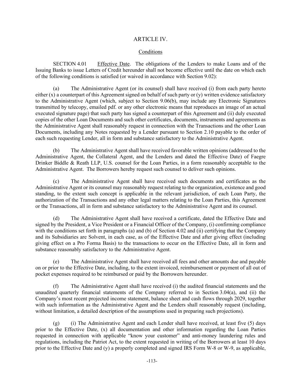 -113- ARTICLE IV. Conditions SECTION 4.01 Effective Date. The obligations of the Lenders to make Loans and of the Issuing Banks to issue Letters of Credit hereunder shall not become effective until the date on which each of the following conditions is satisfied (or waived in accordance with Section 9.02): (a) The Administrative Agent (or its counsel) shall have received (i) from each party hereto either (x) a counterpart of this Agreement signed on behalf of such party or (y) written evidence satisfactory to the Administrative Agent (which, subject to Section 9.06(b), may include any Electronic Signatures transmitted by telecopy, emailed pdf. or any other electronic means that reproduces an image of an actual executed signature page) that such party has signed a counterpart of this Agreement and (ii) duly executed copies of the other Loan Documents and such other certificates, documents, instruments and agreements as the Administrative Agent shall reasonably request in connection with the Transactions and the other Loan Documents, including any Notes requested by a Lender pursuant to Section 2.10 payable to the order of each such requesting Lender, all in form and substance satisfactory to the Administrative Agent. (b) The Administrative Agent shall have received favorable written opinions (addressed to the Administrative Agent, the Collateral Agent, and the Lenders and dated the Effective Date) of Faegre Drinker Biddle & Reath LLP, U.S. counsel for the Loan Parties, in a form reasonably acceptable to the Administrative Agent. The Borrowers hereby request such counsel to deliver such opinions. (c) The Administrative Agent shall have received such documents and certificates as the Administrative Agent or its counsel may reasonably request relating to the organization, existence and good standing, to the extent such concept is applicable in the relevant jurisdiction, of each Loan Party, the authorization of the Transactions and any other legal matters relating to the Loan Parties, this Agreement or the Transactions, all in form and substance satisfactory to the Administrative Agent and its counsel. (d) The Administrative Agent shall have received a certificate, dated the Effective Date and signed by the President, a Vice President or a Financial Officer of the Company, (i) confirming compliance with the conditions set forth in paragraphs (a) and (b) of Section 4.02 and (ii) certifying that the Company and its Subsidiaries are Solvent, in each case, as of the Effective Date and after giving effect (including giving effect on a Pro Forma Basis) to the transactions to occur on the Effective Date, all in form and substance reasonably satisfactory to the Administrative Agent. (e) The Administrative Agent shall have received all fees and other amounts due and payable on or prior to the Effective Date, including, to the extent invoiced, reimbursement or payment of all out of pocket expenses required to be reimbursed or paid by the Borrowers hereunder. (f) The Administrative Agent shall have received (i) the audited financial statements and the unaudited quarterly financial statements of the Company referred to in Section 3.04(a), and (ii) the Company’s most recent projected income statement, balance sheet and cash flows through 2029, together with such information as the Administrative Agent and the Lenders shall reasonably request (including, without limitation, a detailed description of the assumptions used in preparing such projections). (g) (i) The Administrative Agent and each Lender shall have received, at least five (5) days prior to the Effective Date, (x) all documentation and other information regarding the Loan Parties requested in connection with applicable “know your customer” and anti-money laundering rules and regulations, including the Patriot Act, to the extent requested in writing of the Borrowers at least 10 days prior to the Effective Date and (y) a properly completed and signed IRS Form W-8 or W-9, as applicable,