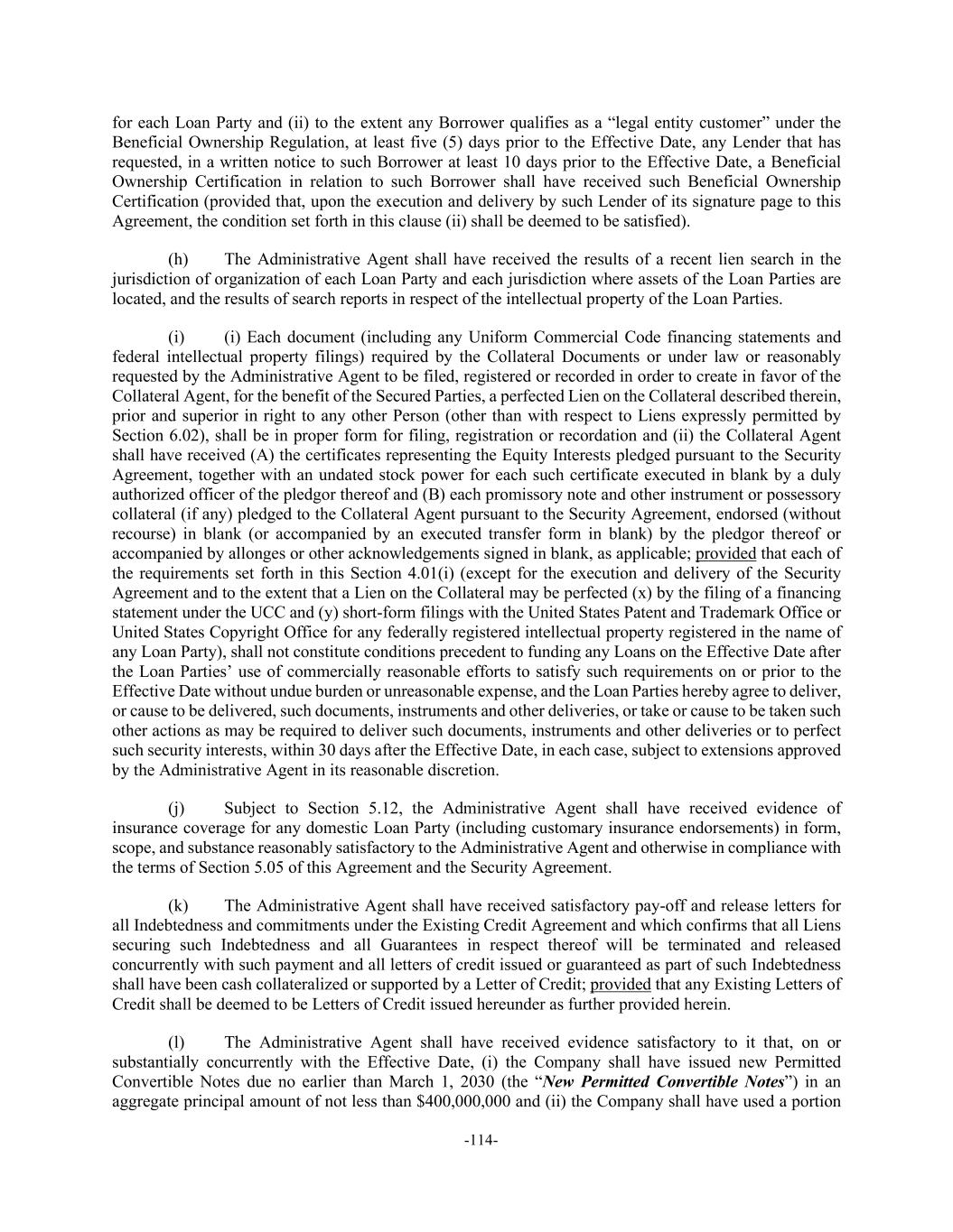 -114- for each Loan Party and (ii) to the extent any Borrower qualifies as a “legal entity customer” under the Beneficial Ownership Regulation, at least five (5) days prior to the Effective Date, any Lender that has requested, in a written notice to such Borrower at least 10 days prior to the Effective Date, a Beneficial Ownership Certification in relation to such Borrower shall have received such Beneficial Ownership Certification (provided that, upon the execution and delivery by such Lender of its signature page to this Agreement, the condition set forth in this clause (ii) shall be deemed to be satisfied). (h) The Administrative Agent shall have received the results of a recent lien search in the jurisdiction of organization of each Loan Party and each jurisdiction where assets of the Loan Parties are located, and the results of search reports in respect of the intellectual property of the Loan Parties. (i) (i) Each document (including any Uniform Commercial Code financing statements and federal intellectual property filings) required by the Collateral Documents or under law or reasonably requested by the Administrative Agent to be filed, registered or recorded in order to create in favor of the Collateral Agent, for the benefit of the Secured Parties, a perfected Lien on the Collateral described therein, prior and superior in right to any other Person (other than with respect to Liens expressly permitted by Section 6.02), shall be in proper form for filing, registration or recordation and (ii) the Collateral Agent shall have received (A) the certificates representing the Equity Interests pledged pursuant to the Security Agreement, together with an undated stock power for each such certificate executed in blank by a duly authorized officer of the pledgor thereof and (B) each promissory note and other instrument or possessory collateral (if any) pledged to the Collateral Agent pursuant to the Security Agreement, endorsed (without recourse) in blank (or accompanied by an executed transfer form in blank) by the pledgor thereof or accompanied by allonges or other acknowledgements signed in blank, as applicable; provided that each of the requirements set forth in this Section 4.01(i) (except for the execution and delivery of the Security Agreement and to the extent that a Lien on the Collateral may be perfected (x) by the filing of a financing statement under the UCC and (y) short-form filings with the United States Patent and Trademark Office or United States Copyright Office for any federally registered intellectual property registered in the name of any Loan Party), shall not constitute conditions precedent to funding any Loans on the Effective Date after the Loan Parties’ use of commercially reasonable efforts to satisfy such requirements on or prior to the Effective Date without undue burden or unreasonable expense, and the Loan Parties hereby agree to deliver, or cause to be delivered, such documents, instruments and other deliveries, or take or cause to be taken such other actions as may be required to deliver such documents, instruments and other deliveries or to perfect such security interests, within 30 days after the Effective Date, in each case, subject to extensions approved by the Administrative Agent in its reasonable discretion. (j) Subject to Section 5.12, the Administrative Agent shall have received evidence of insurance coverage for any domestic Loan Party (including customary insurance endorsements) in form, scope, and substance reasonably satisfactory to the Administrative Agent and otherwise in compliance with the terms of Section 5.05 of this Agreement and the Security Agreement. (k) The Administrative Agent shall have received satisfactory pay-off and release letters for all Indebtedness and commitments under the Existing Credit Agreement and which confirms that all Liens securing such Indebtedness and all Guarantees in respect thereof will be terminated and released concurrently with such payment and all letters of credit issued or guaranteed as part of such Indebtedness shall have been cash collateralized or supported by a Letter of Credit; provided that any Existing Letters of Credit shall be deemed to be Letters of Credit issued hereunder as further provided herein. (l) The Administrative Agent shall have received evidence satisfactory to it that, on or substantially concurrently with the Effective Date, (i) the Company shall have issued new Permitted Convertible Notes due no earlier than March 1, 2030 (the “New Permitted Convertible Notes”) in an aggregate principal amount of not less than $400,000,000 and (ii) the Company shall have used a portion