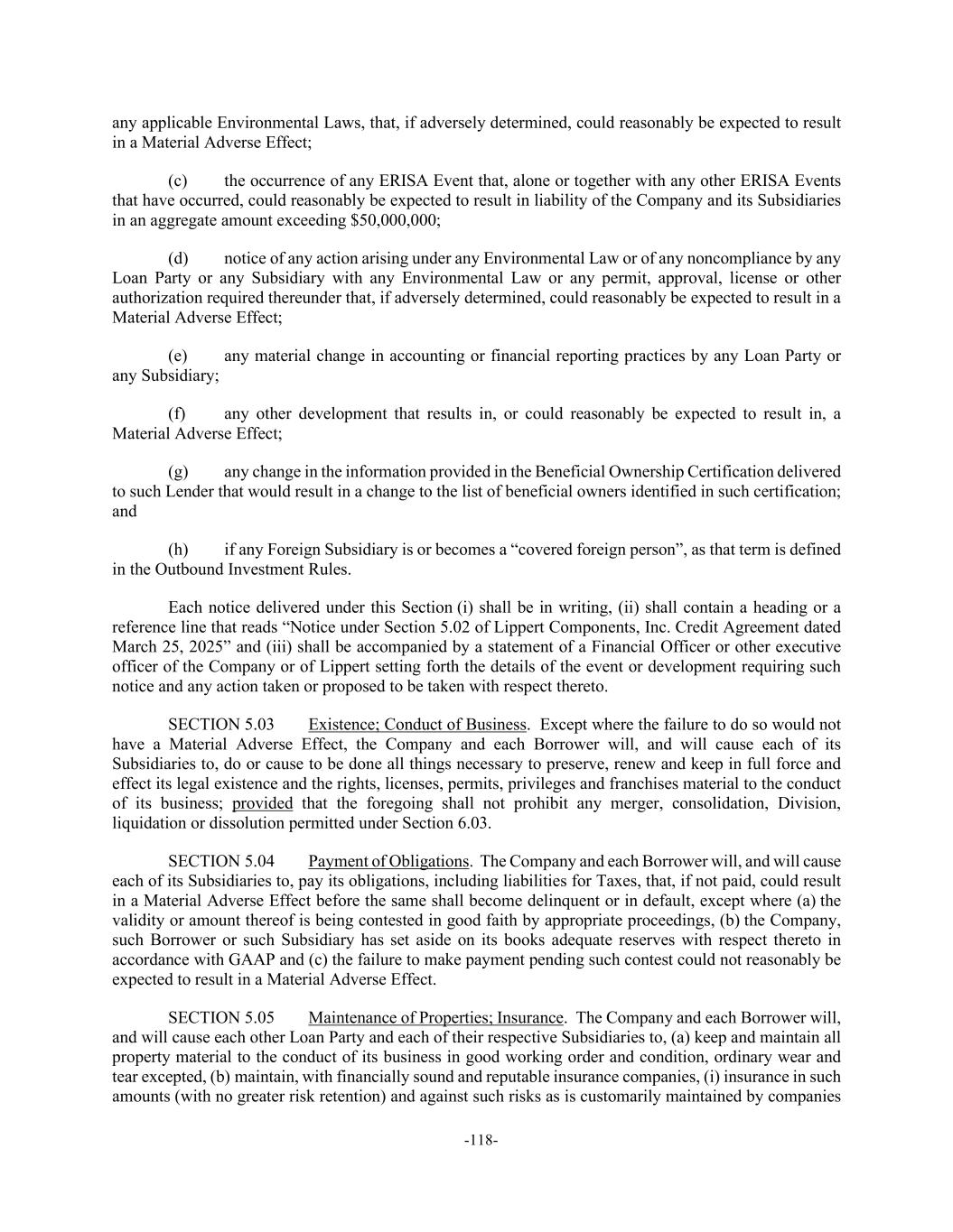 -118- any applicable Environmental Laws, that, if adversely determined, could reasonably be expected to result in a Material Adverse Effect; (c) the occurrence of any ERISA Event that, alone or together with any other ERISA Events that have occurred, could reasonably be expected to result in liability of the Company and its Subsidiaries in an aggregate amount exceeding $50,000,000; (d) notice of any action arising under any Environmental Law or of any noncompliance by any Loan Party or any Subsidiary with any Environmental Law or any permit, approval, license or other authorization required thereunder that, if adversely determined, could reasonably be expected to result in a Material Adverse Effect; (e) any material change in accounting or financial reporting practices by any Loan Party or any Subsidiary; (f) any other development that results in, or could reasonably be expected to result in, a Material Adverse Effect; (g) any change in the information provided in the Beneficial Ownership Certification delivered to such Lender that would result in a change to the list of beneficial owners identified in such certification; and (h) if any Foreign Subsidiary is or becomes a “covered foreign person”, as that term is defined in the Outbound Investment Rules. Each notice delivered under this Section (i) shall be in writing, (ii) shall contain a heading or a reference line that reads “Notice under Section 5.02 of Lippert Components, Inc. Credit Agreement dated March 25, 2025” and (iii) shall be accompanied by a statement of a Financial Officer or other executive officer of the Company or of Lippert setting forth the details of the event or development requiring such notice and any action taken or proposed to be taken with respect thereto. SECTION 5.03 Existence; Conduct of Business. Except where the failure to do so would not have a Material Adverse Effect, the Company and each Borrower will, and will cause each of its Subsidiaries to, do or cause to be done all things necessary to preserve, renew and keep in full force and effect its legal existence and the rights, licenses, permits, privileges and franchises material to the conduct of its business; provided that the foregoing shall not prohibit any merger, consolidation, Division, liquidation or dissolution permitted under Section 6.03. SECTION 5.04 Payment of Obligations. The Company and each Borrower will, and will cause each of its Subsidiaries to, pay its obligations, including liabilities for Taxes, that, if not paid, could result in a Material Adverse Effect before the same shall become delinquent or in default, except where (a) the validity or amount thereof is being contested in good faith by appropriate proceedings, (b) the Company, such Borrower or such Subsidiary has set aside on its books adequate reserves with respect thereto in accordance with GAAP and (c) the failure to make payment pending such contest could not reasonably be expected to result in a Material Adverse Effect. SECTION 5.05 Maintenance of Properties; Insurance. The Company and each Borrower will, and will cause each other Loan Party and each of their respective Subsidiaries to, (a) keep and maintain all property material to the conduct of its business in good working order and condition, ordinary wear and tear excepted, (b) maintain, with financially sound and reputable insurance companies, (i) insurance in such amounts (with no greater risk retention) and against such risks as is customarily maintained by companies