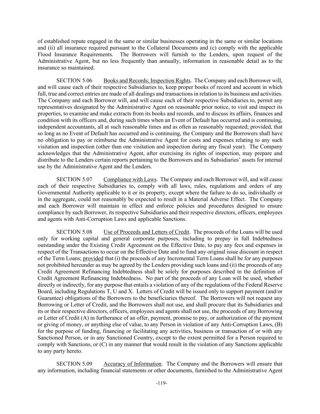 -119- of established repute engaged in the same or similar businesses operating in the same or similar locations and (ii) all insurance required pursuant to the Collateral Documents and (c) comply with the applicable Flood Insurance Requirements. The Borrowers will furnish to the Lenders, upon request of the Administrative Agent, but no less frequently than annually, information in reasonable detail as to the insurance so maintained. SECTION 5.06 Books and Records; Inspection Rights. The Company and each Borrower will, and will cause each of their respective Subsidiaries to, keep proper books of record and account in which full, true and correct entries are made of all dealings and transactions in relation to its business and activities. The Company and each Borrower will, and will cause each of their respective Subsidiaries to, permit any representatives designated by the Administrative Agent on reasonable prior notice, to visit and inspect its properties, to examine and make extracts from its books and records, and to discuss its affairs, finances and condition with its officers and, during such times when an Event of Default has occurred and is continuing, independent accountants, all at such reasonable times and as often as reasonably requested; provided, that so long as no Event of Default has occurred and is continuing, the Company and the Borrowers shall have no obligation to pay or reimburse the Administrative Agent for costs and expenses relating to any such visitation and inspection (other than one visitation and inspection during any fiscal year). The Company acknowledges that the Administrative Agent, after exercising its rights of inspection, may prepare and distribute to the Lenders certain reports pertaining to the Borrowers and its Subsidiaries’ assets for internal use by the Administrative Agent and the Lenders. SECTION 5.07 Compliance with Laws. The Company and each Borrower will, and will cause each of their respective Subsidiaries to, comply with all laws, rules, regulations and orders of any Governmental Authority applicable to it or its property, except where the failure to do so, individually or in the aggregate, could not reasonably be expected to result in a Material Adverse Effect. The Company and each Borrower will maintain in effect and enforce policies and procedures designed to ensure compliance by such Borrower, its respective Subsidiaries and their respective directors, officers, employees and agents with Anti-Corruption Laws and applicable Sanctions. SECTION 5.08 Use of Proceeds and Letters of Credit. The proceeds of the Loans will be used only for working capital and general corporate purposes, including to prepay in full Indebtedness outstanding under the Existing Credit Agreement on the Effective Date, to pay any fees and expenses in respect of the Transactions to occur on the Effective Date and to fund any original issue discount in respect of the Term Loans; provided that (i) the proceeds of any Incremental Term Loans shall be for any purposes not prohibited hereunder as may be agreed by the Lenders providing such loans and (ii) the proceeds of any Credit Agreement Refinancing Indebtedness shall be solely for purposes described in the definition of Credit Agreement Refinancing Indebtedness. No part of the proceeds of any Loan will be used, whether directly or indirectly, for any purpose that entails a violation of any of the regulations of the Federal Reserve Board, including Regulations T, U and X. Letters of Credit will be issued only to support payment (and/or Guarantee) obligations of the Borrowers to the beneficiaries thereof. The Borrowers will not request any Borrowing or Letter of Credit, and the Borrowers shall not use, and shall procure that its Subsidiaries and its or their respective directors, officers, employees and agents shall not use, the proceeds of any Borrowing or Letter of Credit (A) in furtherance of an offer, payment, promise to pay, or authorization of the payment or giving of money, or anything else of value, to any Person in violation of any Anti-Corruption Laws, (B) for the purpose of funding, financing or facilitating any activities, business or transaction of or with any Sanctioned Person, or in any Sanctioned Country, except to the extent permitted for a Person required to comply with Sanctions, or (C) in any manner that would result in the violation of any Sanctions applicable to any party hereto. SECTION 5.09 Accuracy of Information. The Company and the Borrowers will ensure that any information, including financial statements or other documents, furnished to the Administrative Agent