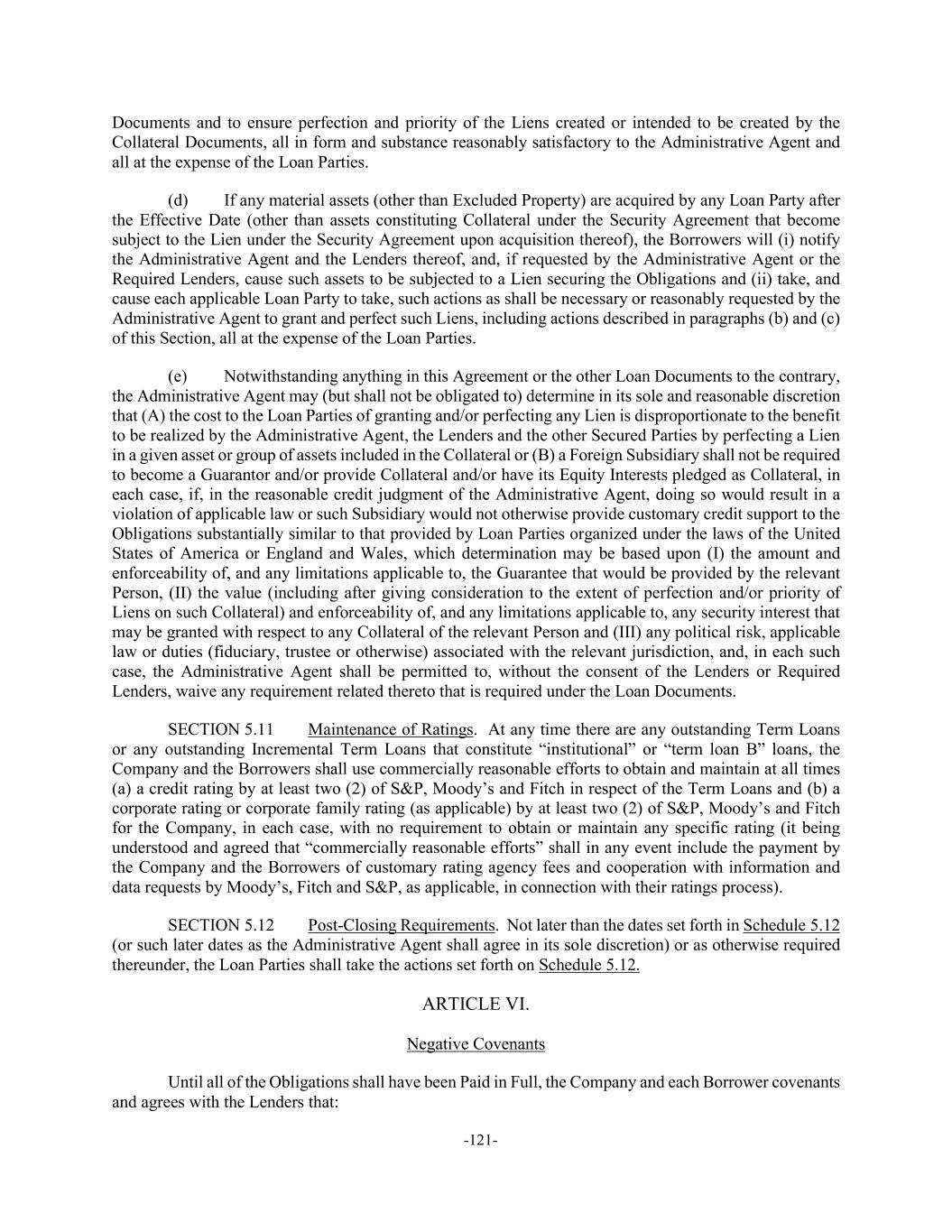 -121- Documents and to ensure perfection and priority of the Liens created or intended to be created by the Collateral Documents, all in form and substance reasonably satisfactory to the Administrative Agent and all at the expense of the Loan Parties. (d) If any material assets (other than Excluded Property) are acquired by any Loan Party after the Effective Date (other than assets constituting Collateral under the Security Agreement that become subject to the Lien under the Security Agreement upon acquisition thereof), the Borrowers will (i) notify the Administrative Agent and the Lenders thereof, and, if requested by the Administrative Agent or the Required Lenders, cause such assets to be subjected to a Lien securing the Obligations and (ii) take, and cause each applicable Loan Party to take, such actions as shall be necessary or reasonably requested by the Administrative Agent to grant and perfect such Liens, including actions described in paragraphs (b) and (c) of this Section, all at the expense of the Loan Parties. (e) Notwithstanding anything in this Agreement or the other Loan Documents to the contrary, the Administrative Agent may (but shall not be obligated to) determine in its sole and reasonable discretion that (A) the cost to the Loan Parties of granting and/or perfecting any Lien is disproportionate to the benefit to be realized by the Administrative Agent, the Lenders and the other Secured Parties by perfecting a Lien in a given asset or group of assets included in the Collateral or (B) a Foreign Subsidiary shall not be required to become a Guarantor and/or provide Collateral and/or have its Equity Interests pledged as Collateral, in each case, if, in the reasonable credit judgment of the Administrative Agent, doing so would result in a violation of applicable law or such Subsidiary would not otherwise provide customary credit support to the Obligations substantially similar to that provided by Loan Parties organized under the laws of the United States of America or England and Wales, which determination may be based upon (I) the amount and enforceability of, and any limitations applicable to, the Guarantee that would be provided by the relevant Person, (II) the value (including after giving consideration to the extent of perfection and/or priority of Liens on such Collateral) and enforceability of, and any limitations applicable to, any security interest that may be granted with respect to any Collateral of the relevant Person and (III) any political risk, applicable law or duties (fiduciary, trustee or otherwise) associated with the relevant jurisdiction, and, in each such case, the Administrative Agent shall be permitted to, without the consent of the Lenders or Required Lenders, waive any requirement related thereto that is required under the Loan Documents. SECTION 5.11 Maintenance of Ratings. At any time there are any outstanding Term Loans or any outstanding Incremental Term Loans that constitute “institutional” or “term loan B” loans, the Company and the Borrowers shall use commercially reasonable efforts to obtain and maintain at all times (a) a credit rating by at least two (2) of S&P, Moody’s and Fitch in respect of the Term Loans and (b) a corporate rating or corporate family rating (as applicable) by at least two (2) of S&P, Moody’s and Fitch for the Company, in each case, with no requirement to obtain or maintain any specific rating (it being understood and agreed that “commercially reasonable efforts” shall in any event include the payment by the Company and the Borrowers of customary rating agency fees and cooperation with information and data requests by Moody’s, Fitch and S&P, as applicable, in connection with their ratings process). SECTION 5.12 Post-Closing Requirements. Not later than the dates set forth in Schedule 5.12 (or such later dates as the Administrative Agent shall agree in its sole discretion) or as otherwise required thereunder, the Loan Parties shall take the actions set forth on Schedule 5.12. ARTICLE VI. Negative Covenants Until all of the Obligations shall have been Paid in Full, the Company and each Borrower covenants and agrees with the Lenders that: