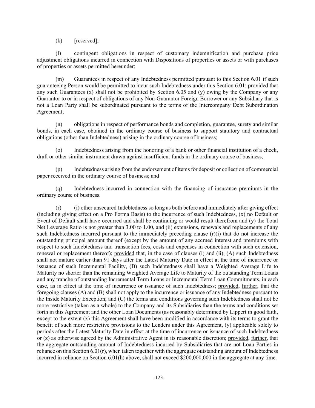 -123- (k) [reserved]; (l) contingent obligations in respect of customary indemnification and purchase price adjustment obligations incurred in connection with Dispositions of properties or assets or with purchases of properties or assets permitted hereunder; (m) Guarantees in respect of any Indebtedness permitted pursuant to this Section 6.01 if such guaranteeing Person would be permitted to incur such Indebtedness under this Section 6.01; provided that any such Guarantees (x) shall not be prohibited by Section 6.05 and (y) owing by the Company or any Guarantor to or in respect of obligations of any Non-Guarantor Foreign Borrower or any Subsidiary that is not a Loan Party shall be subordinated pursuant to the terms of the Intercompany Debt Subordination Agreement; (n) obligations in respect of performance bonds and completion, guarantee, surety and similar bonds, in each case, obtained in the ordinary course of business to support statutory and contractual obligations (other than Indebtedness) arising in the ordinary course of business; (o) Indebtedness arising from the honoring of a bank or other financial institution of a check, draft or other similar instrument drawn against insufficient funds in the ordinary course of business; (p) Indebtedness arising from the endorsement of items for deposit or collection of commercial paper received in the ordinary course of business; and (q) Indebtedness incurred in connection with the financing of insurance premiums in the ordinary course of business. (r) (i) other unsecured Indebtedness so long as both before and immediately after giving effect (including giving effect on a Pro Forma Basis) to the incurrence of such Indebtedness, (x) no Default or Event of Default shall have occurred and shall be continuing or would result therefrom and (y) the Total Net Leverage Ratio is not greater than 3.00 to 1.00, and (ii) extensions, renewals and replacements of any such Indebtedness incurred pursuant to the immediately preceding clause (r)(i) that do not increase the outstanding principal amount thereof (except by the amount of any accrued interest and premiums with respect to such Indebtedness and transaction fees, costs and expenses in connection with such extension, renewal or replacement thereof); provided that, in the case of clauses (i) and (ii), (A) such Indebtedness shall not mature earlier than 91 days after the Latest Maturity Date in effect at the time of incurrence or issuance of such Incremental Facility, (B) such Indebtedness shall have a Weighted Average Life to Maturity no shorter than the remaining Weighted Average Life to Maturity of the outstanding Term Loans and any tranche of outstanding Incremental Term Loans or Incremental Term Loan Commitments, in each case, as in effect at the time of incurrence or issuance of such Indebtedness; provided, further, that the foregoing clauses (A) and (B) shall not apply to the incurrence or issuance of any Indebtedness pursuant to the Inside Maturity Exception; and (C) the terms and conditions governing such Indebtedness shall not be more restrictive (taken as a whole) to the Company and its Subsidiaries than the terms and conditions set forth in this Agreement and the other Loan Documents (as reasonably determined by Lippert in good faith, except to the extent (x) this Agreement shall have been modified in accordance with its terms to grant the benefit of such more restrictive provisions to the Lenders under this Agreement, (y) applicable solely to periods after the Latest Maturity Date in effect at the time of incurrence or issuance of such Indebtedness or (z) as otherwise agreed by the Administrative Agent in its reasonable discretion; provided, further, that the aggregate outstanding amount of Indebtedness incurred by Subsidiaries that are not Loan Parties in reliance on this Section 6.01(r), when taken together with the aggregate outstanding amount of Indebtedness incurred in reliance on Section 6.01(h) above, shall not exceed $200,000,000 in the aggregate at any time.