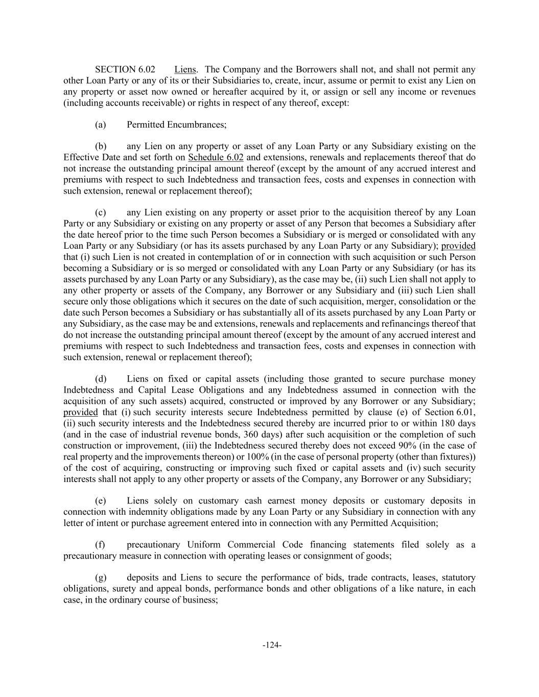 -124- SECTION 6.02 Liens. The Company and the Borrowers shall not, and shall not permit any other Loan Party or any of its or their Subsidiaries to, create, incur, assume or permit to exist any Lien on any property or asset now owned or hereafter acquired by it, or assign or sell any income or revenues (including accounts receivable) or rights in respect of any thereof, except: (a) Permitted Encumbrances; (b) any Lien on any property or asset of any Loan Party or any Subsidiary existing on the Effective Date and set forth on Schedule 6.02 and extensions, renewals and replacements thereof that do not increase the outstanding principal amount thereof (except by the amount of any accrued interest and premiums with respect to such Indebtedness and transaction fees, costs and expenses in connection with such extension, renewal or replacement thereof); (c) any Lien existing on any property or asset prior to the acquisition thereof by any Loan Party or any Subsidiary or existing on any property or asset of any Person that becomes a Subsidiary after the date hereof prior to the time such Person becomes a Subsidiary or is merged or consolidated with any Loan Party or any Subsidiary (or has its assets purchased by any Loan Party or any Subsidiary); provided that (i) such Lien is not created in contemplation of or in connection with such acquisition or such Person becoming a Subsidiary or is so merged or consolidated with any Loan Party or any Subsidiary (or has its assets purchased by any Loan Party or any Subsidiary), as the case may be, (ii) such Lien shall not apply to any other property or assets of the Company, any Borrower or any Subsidiary and (iii) such Lien shall secure only those obligations which it secures on the date of such acquisition, merger, consolidation or the date such Person becomes a Subsidiary or has substantially all of its assets purchased by any Loan Party or any Subsidiary, as the case may be and extensions, renewals and replacements and refinancings thereof that do not increase the outstanding principal amount thereof (except by the amount of any accrued interest and premiums with respect to such Indebtedness and transaction fees, costs and expenses in connection with such extension, renewal or replacement thereof); (d) Liens on fixed or capital assets (including those granted to secure purchase money Indebtedness and Capital Lease Obligations and any Indebtedness assumed in connection with the acquisition of any such assets) acquired, constructed or improved by any Borrower or any Subsidiary; provided that (i) such security interests secure Indebtedness permitted by clause (e) of Section 6.01, (ii) such security interests and the Indebtedness secured thereby are incurred prior to or within 180 days (and in the case of industrial revenue bonds, 360 days) after such acquisition or the completion of such construction or improvement, (iii) the Indebtedness secured thereby does not exceed 90% (in the case of real property and the improvements thereon) or 100% (in the case of personal property (other than fixtures)) of the cost of acquiring, constructing or improving such fixed or capital assets and (iv) such security interests shall not apply to any other property or assets of the Company, any Borrower or any Subsidiary; (e) Liens solely on customary cash earnest money deposits or customary deposits in connection with indemnity obligations made by any Loan Party or any Subsidiary in connection with any letter of intent or purchase agreement entered into in connection with any Permitted Acquisition; (f) precautionary Uniform Commercial Code financing statements filed solely as a precautionary measure in connection with operating leases or consignment of goods; (g) deposits and Liens to secure the performance of bids, trade contracts, leases, statutory obligations, surety and appeal bonds, performance bonds and other obligations of a like nature, in each case, in the ordinary course of business;