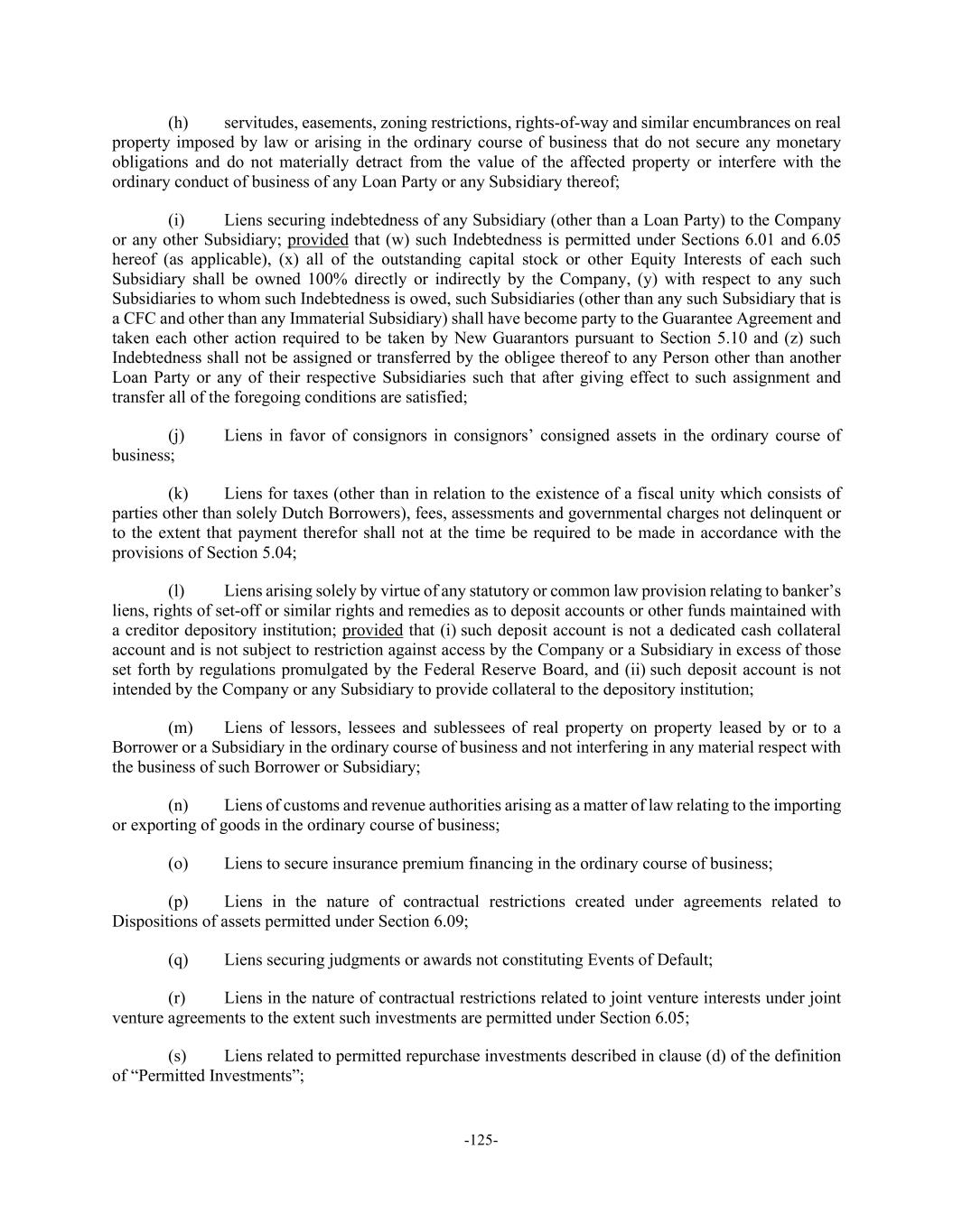 -125- (h) servitudes, easements, zoning restrictions, rights-of-way and similar encumbrances on real property imposed by law or arising in the ordinary course of business that do not secure any monetary obligations and do not materially detract from the value of the affected property or interfere with the ordinary conduct of business of any Loan Party or any Subsidiary thereof; (i) Liens securing indebtedness of any Subsidiary (other than a Loan Party) to the Company or any other Subsidiary; provided that (w) such Indebtedness is permitted under Sections 6.01 and 6.05 hereof (as applicable), (x) all of the outstanding capital stock or other Equity Interests of each such Subsidiary shall be owned 100% directly or indirectly by the Company, (y) with respect to any such Subsidiaries to whom such Indebtedness is owed, such Subsidiaries (other than any such Subsidiary that is a CFC and other than any Immaterial Subsidiary) shall have become party to the Guarantee Agreement and taken each other action required to be taken by New Guarantors pursuant to Section 5.10 and (z) such Indebtedness shall not be assigned or transferred by the obligee thereof to any Person other than another Loan Party or any of their respective Subsidiaries such that after giving effect to such assignment and transfer all of the foregoing conditions are satisfied; (j) Liens in favor of consignors in consignors’ consigned assets in the ordinary course of business; (k) Liens for taxes (other than in relation to the existence of a fiscal unity which consists of parties other than solely Dutch Borrowers), fees, assessments and governmental charges not delinquent or to the extent that payment therefor shall not at the time be required to be made in accordance with the provisions of Section 5.04; (l) Liens arising solely by virtue of any statutory or common law provision relating to banker’s liens, rights of set-off or similar rights and remedies as to deposit accounts or other funds maintained with a creditor depository institution; provided that (i) such deposit account is not a dedicated cash collateral account and is not subject to restriction against access by the Company or a Subsidiary in excess of those set forth by regulations promulgated by the Federal Reserve Board, and (ii) such deposit account is not intended by the Company or any Subsidiary to provide collateral to the depository institution; (m) Liens of lessors, lessees and sublessees of real property on property leased by or to a Borrower or a Subsidiary in the ordinary course of business and not interfering in any material respect with the business of such Borrower or Subsidiary; (n) Liens of customs and revenue authorities arising as a matter of law relating to the importing or exporting of goods in the ordinary course of business; (o) Liens to secure insurance premium financing in the ordinary course of business; (p) Liens in the nature of contractual restrictions created under agreements related to Dispositions of assets permitted under Section 6.09; (q) Liens securing judgments or awards not constituting Events of Default; (r) Liens in the nature of contractual restrictions related to joint venture interests under joint venture agreements to the extent such investments are permitted under Section 6.05; (s) Liens related to permitted repurchase investments described in clause (d) of the definition of “Permitted Investments”;