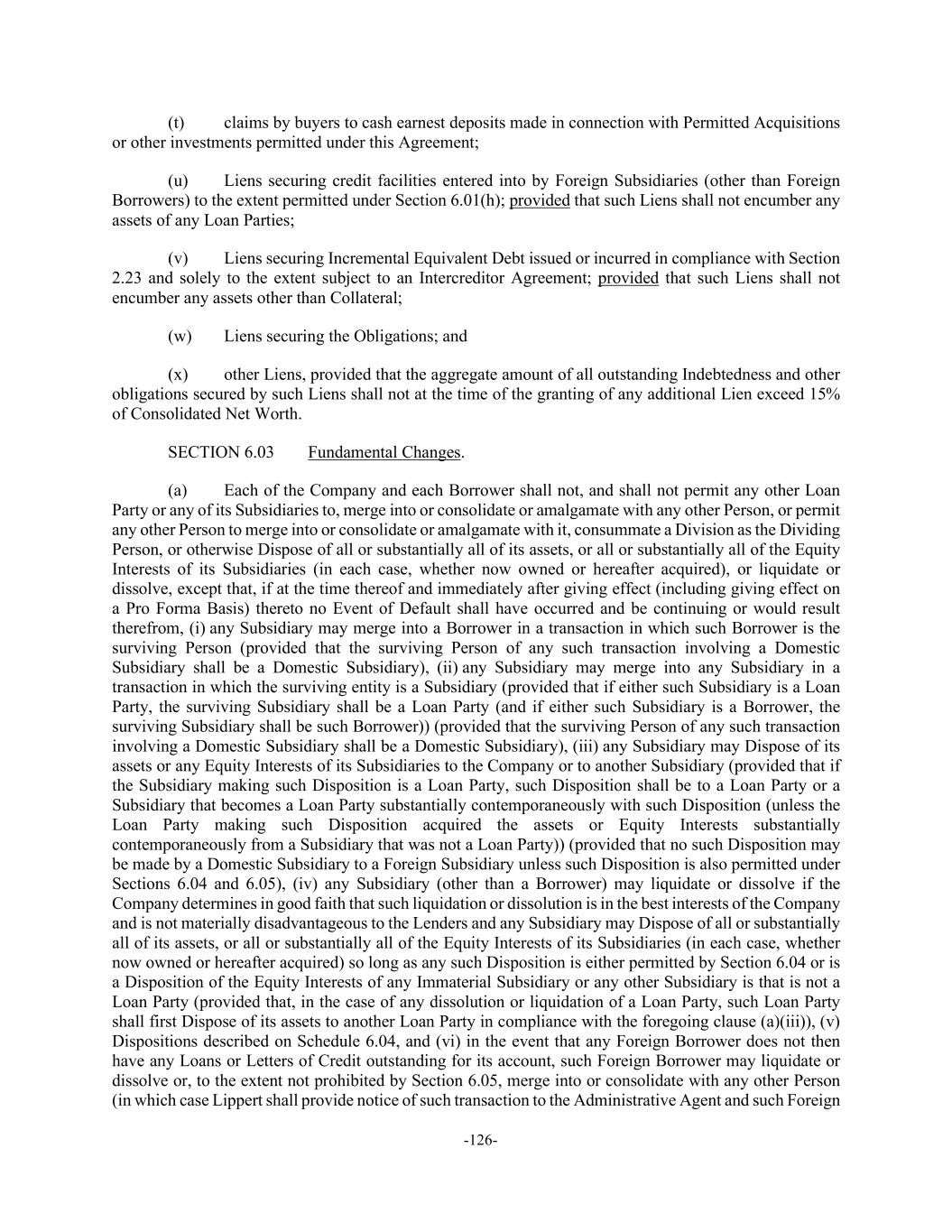 -126- (t) claims by buyers to cash earnest deposits made in connection with Permitted Acquisitions or other investments permitted under this Agreement; (u) Liens securing credit facilities entered into by Foreign Subsidiaries (other than Foreign Borrowers) to the extent permitted under Section 6.01(h); provided that such Liens shall not encumber any assets of any Loan Parties; (v) Liens securing Incremental Equivalent Debt issued or incurred in compliance with Section 2.23 and solely to the extent subject to an Intercreditor Agreement; provided that such Liens shall not encumber any assets other than Collateral; (w) Liens securing the Obligations; and (x) other Liens, provided that the aggregate amount of all outstanding Indebtedness and other obligations secured by such Liens shall not at the time of the granting of any additional Lien exceed 15% of Consolidated Net Worth. SECTION 6.03 Fundamental Changes. (a) Each of the Company and each Borrower shall not, and shall not permit any other Loan Party or any of its Subsidiaries to, merge into or consolidate or amalgamate with any other Person, or permit any other Person to merge into or consolidate or amalgamate with it, consummate a Division as the Dividing Person, or otherwise Dispose of all or substantially all of its assets, or all or substantially all of the Equity Interests of its Subsidiaries (in each case, whether now owned or hereafter acquired), or liquidate or dissolve, except that, if at the time thereof and immediately after giving effect (including giving effect on a Pro Forma Basis) thereto no Event of Default shall have occurred and be continuing or would result therefrom, (i) any Subsidiary may merge into a Borrower in a transaction in which such Borrower is the surviving Person (provided that the surviving Person of any such transaction involving a Domestic Subsidiary shall be a Domestic Subsidiary), (ii) any Subsidiary may merge into any Subsidiary in a transaction in which the surviving entity is a Subsidiary (provided that if either such Subsidiary is a Loan Party, the surviving Subsidiary shall be a Loan Party (and if either such Subsidiary is a Borrower, the surviving Subsidiary shall be such Borrower)) (provided that the surviving Person of any such transaction involving a Domestic Subsidiary shall be a Domestic Subsidiary), (iii) any Subsidiary may Dispose of its assets or any Equity Interests of its Subsidiaries to the Company or to another Subsidiary (provided that if the Subsidiary making such Disposition is a Loan Party, such Disposition shall be to a Loan Party or a Subsidiary that becomes a Loan Party substantially contemporaneously with such Disposition (unless the Loan Party making such Disposition acquired the assets or Equity Interests substantially contemporaneously from a Subsidiary that was not a Loan Party)) (provided that no such Disposition may be made by a Domestic Subsidiary to a Foreign Subsidiary unless such Disposition is also permitted under Sections 6.04 and 6.05), (iv) any Subsidiary (other than a Borrower) may liquidate or dissolve if the Company determines in good faith that such liquidation or dissolution is in the best interests of the Company and is not materially disadvantageous to the Lenders and any Subsidiary may Dispose of all or substantially all of its assets, or all or substantially all of the Equity Interests of its Subsidiaries (in each case, whether now owned or hereafter acquired) so long as any such Disposition is either permitted by Section 6.04 or is a Disposition of the Equity Interests of any Immaterial Subsidiary or any other Subsidiary is that is not a Loan Party (provided that, in the case of any dissolution or liquidation of a Loan Party, such Loan Party shall first Dispose of its assets to another Loan Party in compliance with the foregoing clause (a)(iii)), (v) Dispositions described on Schedule 6.04, and (vi) in the event that any Foreign Borrower does not then have any Loans or Letters of Credit outstanding for its account, such Foreign Borrower may liquidate or dissolve or, to the extent not prohibited by Section 6.05, merge into or consolidate with any other Person (in which case Lippert shall provide notice of such transaction to the Administrative Agent and such Foreign