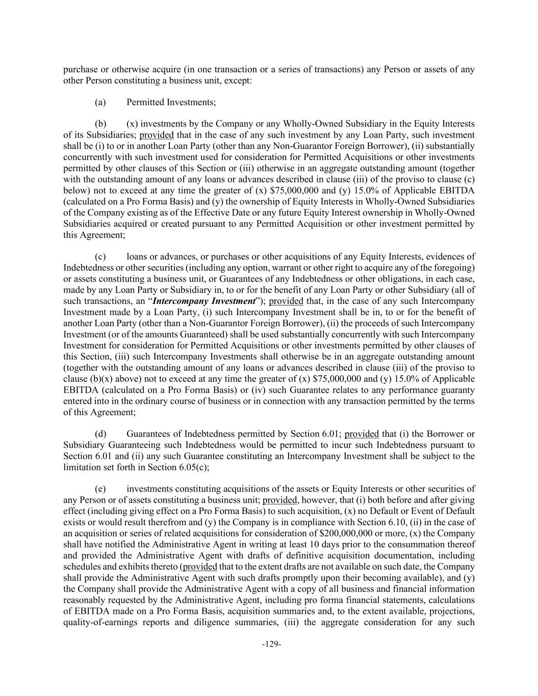 -129- purchase or otherwise acquire (in one transaction or a series of transactions) any Person or assets of any other Person constituting a business unit, except: (a) Permitted Investments; (b) (x) investments by the Company or any Wholly-Owned Subsidiary in the Equity Interests of its Subsidiaries; provided that in the case of any such investment by any Loan Party, such investment shall be (i) to or in another Loan Party (other than any Non-Guarantor Foreign Borrower), (ii) substantially concurrently with such investment used for consideration for Permitted Acquisitions or other investments permitted by other clauses of this Section or (iii) otherwise in an aggregate outstanding amount (together with the outstanding amount of any loans or advances described in clause (iii) of the proviso to clause (c) below) not to exceed at any time the greater of (x) $75,000,000 and (y) 15.0% of Applicable EBITDA (calculated on a Pro Forma Basis) and (y) the ownership of Equity Interests in Wholly-Owned Subsidiaries of the Company existing as of the Effective Date or any future Equity Interest ownership in Wholly-Owned Subsidiaries acquired or created pursuant to any Permitted Acquisition or other investment permitted by this Agreement; (c) loans or advances, or purchases or other acquisitions of any Equity Interests, evidences of Indebtedness or other securities (including any option, warrant or other right to acquire any of the foregoing) or assets constituting a business unit, or Guarantees of any Indebtedness or other obligations, in each case, made by any Loan Party or Subsidiary in, to or for the benefit of any Loan Party or other Subsidiary (all of such transactions, an “Intercompany Investment”); provided that, in the case of any such Intercompany Investment made by a Loan Party, (i) such Intercompany Investment shall be in, to or for the benefit of another Loan Party (other than a Non-Guarantor Foreign Borrower), (ii) the proceeds of such Intercompany Investment (or of the amounts Guaranteed) shall be used substantially concurrently with such Intercompany Investment for consideration for Permitted Acquisitions or other investments permitted by other clauses of this Section, (iii) such Intercompany Investments shall otherwise be in an aggregate outstanding amount (together with the outstanding amount of any loans or advances described in clause (iii) of the proviso to clause (b)(x) above) not to exceed at any time the greater of (x) $75,000,000 and (y) 15.0% of Applicable EBITDA (calculated on a Pro Forma Basis) or (iv) such Guarantee relates to any performance guaranty entered into in the ordinary course of business or in connection with any transaction permitted by the terms of this Agreement; (d) Guarantees of Indebtedness permitted by Section 6.01; provided that (i) the Borrower or Subsidiary Guaranteeing such Indebtedness would be permitted to incur such Indebtedness pursuant to Section 6.01 and (ii) any such Guarantee constituting an Intercompany Investment shall be subject to the limitation set forth in Section 6.05(c); (e) investments constituting acquisitions of the assets or Equity Interests or other securities of any Person or of assets constituting a business unit; provided, however, that (i) both before and after giving effect (including giving effect on a Pro Forma Basis) to such acquisition, (x) no Default or Event of Default exists or would result therefrom and (y) the Company is in compliance with Section 6.10, (ii) in the case of an acquisition or series of related acquisitions for consideration of $200,000,000 or more, (x) the Company shall have notified the Administrative Agent in writing at least 10 days prior to the consummation thereof and provided the Administrative Agent with drafts of definitive acquisition documentation, including schedules and exhibits thereto (provided that to the extent drafts are not available on such date, the Company shall provide the Administrative Agent with such drafts promptly upon their becoming available), and (y) the Company shall provide the Administrative Agent with a copy of all business and financial information reasonably requested by the Administrative Agent, including pro forma financial statements, calculations of EBITDA made on a Pro Forma Basis, acquisition summaries and, to the extent available, projections, quality-of-earnings reports and diligence summaries, (iii) the aggregate consideration for any such