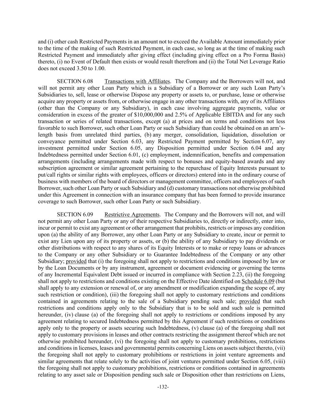 -132- and (i) other cash Restricted Payments in an amount not to exceed the Available Amount immediately prior to the time of the making of such Restricted Payment, in each case, so long as at the time of making such Restricted Payment and immediately after giving effect (including giving effect on a Pro Forma Basis) thereto, (i) no Event of Default then exists or would result therefrom and (ii) the Total Net Leverage Ratio does not exceed 3.50 to 1.00. SECTION 6.08 Transactions with Affiliates. The Company and the Borrowers will not, and will not permit any other Loan Party which is a Subsidiary of a Borrower or any such Loan Party’s Subsidiaries to, sell, lease or otherwise Dispose any property or assets to, or purchase, lease or otherwise acquire any property or assets from, or otherwise engage in any other transactions with, any of its Affiliates (other than the Company or any Subsidiary), in each case involving aggregate payments, value or consideration in excess of the greater of $10,000,000 and 2.5% of Applicable EBITDA and for any such transaction or series of related transactions, except (a) at prices and on terms and conditions not less favorable to such Borrower, such other Loan Party or such Subsidiary than could be obtained on an arm’s- length basis from unrelated third parties, (b) any merger, consolidation, liquidation, dissolution or conveyance permitted under Section 6.03, any Restricted Payment permitted by Section 6.07, any investment permitted under Section 6.05, any Disposition permitted under Section 6.04 and any Indebtedness permitted under Section 6.01, (c) employment, indemnification, benefits and compensation arrangements (including arrangements made with respect to bonuses and equity-based awards and any subscription agreement or similar agreement pertaining to the repurchase of Equity Interests pursuant to put/call rights or similar rights with employees, officers or directors) entered into in the ordinary course of business with members of the board of directors or management committee, officers and employees of such Borrower, such other Loan Party or such Subsidiary and (d) customary transactions not otherwise prohibited under this Agreement in connection with an insurance company that has been formed to provide insurance coverage to such Borrower, such other Loan Party or such Subsidiary. SECTION 6.09 Restrictive Agreements. The Company and the Borrowers will not, and will not permit any other Loan Party or any of their respective Subsidiaries to, directly or indirectly, enter into, incur or permit to exist any agreement or other arrangement that prohibits, restricts or imposes any condition upon (a) the ability of any Borrower, any other Loan Party or any Subsidiary to create, incur or permit to exist any Lien upon any of its property or assets, or (b) the ability of any Subsidiary to pay dividends or other distributions with respect to any shares of its Equity Interests or to make or repay loans or advances to the Company or any other Subsidiary or to Guarantee Indebtedness of the Company or any other Subsidiary; provided that (i) the foregoing shall not apply to restrictions and conditions imposed by law or by the Loan Documents or by any instrument, agreement or document evidencing or governing the terms of any Incremental Equivalent Debt issued or incurred in compliance with Section 2.23, (ii) the foregoing shall not apply to restrictions and conditions existing on the Effective Date identified on Schedule 6.09 (but shall apply to any extension or renewal of, or any amendment or modification expanding the scope of, any such restriction or condition), (iii) the foregoing shall not apply to customary restrictions and conditions contained in agreements relating to the sale of a Subsidiary pending such sale; provided that such restrictions and conditions apply only to the Subsidiary that is to be sold and such sale is permitted hereunder, (iv) clause (a) of the foregoing shall not apply to restrictions or conditions imposed by any agreement relating to secured Indebtedness permitted by this Agreement if such restrictions or conditions apply only to the property or assets securing such Indebtedness, (v) clause (a) of the foregoing shall not apply to customary provisions in leases and other contracts restricting the assignment thereof which are not otherwise prohibited hereunder, (vi) the foregoing shall not apply to customary prohibitions, restrictions and conditions in licenses, leases and governmental permits concerning Liens on assets subject thereto, (vii) the foregoing shall not apply to customary prohibitions or restrictions in joint venture agreements and similar agreements that relate solely to the activities of joint ventures permitted under Section 6.05, (viii) the foregoing shall not apply to customary prohibitions, restrictions or conditions contained in agreements relating to any asset sale or Disposition pending such sale or Disposition other than restrictions on Liens,