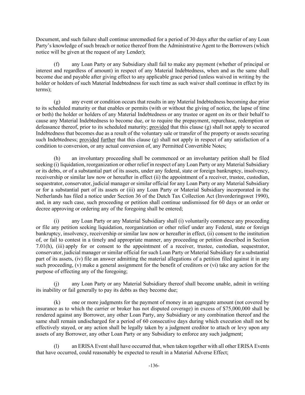 -136- Document, and such failure shall continue unremedied for a period of 30 days after the earlier of any Loan Party’s knowledge of such breach or notice thereof from the Administrative Agent to the Borrowers (which notice will be given at the request of any Lender); (f) any Loan Party or any Subsidiary shall fail to make any payment (whether of principal or interest and regardless of amount) in respect of any Material Indebtedness, when and as the same shall become due and payable after giving effect to any applicable grace period (unless waived in writing by the holder or holders of such Material Indebtedness for such time as such waiver shall continue in effect by its terms); (g) any event or condition occurs that results in any Material Indebtedness becoming due prior to its scheduled maturity or that enables or permits (with or without the giving of notice, the lapse of time or both) the holder or holders of any Material Indebtedness or any trustee or agent on its or their behalf to cause any Material Indebtedness to become due, or to require the prepayment, repurchase, redemption or defeasance thereof, prior to its scheduled maturity; provided that this clause (g) shall not apply to secured Indebtedness that becomes due as a result of the voluntary sale or transfer of the property or assets securing such Indebtedness; provided further that this clause (g) shall not apply in respect of any satisfaction of a condition to conversion, or any actual conversion of, any Permitted Convertible Notes; (h) an involuntary proceeding shall be commenced or an involuntary petition shall be filed seeking (i) liquidation, reorganization or other relief in respect of any Loan Party or any Material Subsidiary or its debts, or of a substantial part of its assets, under any federal, state or foreign bankruptcy, insolvency, receivership or similar law now or hereafter in effect (ii) the appointment of a receiver, trustee, custodian, sequestrator, conservator, judicial manager or similar official for any Loan Party or any Material Subsidiary or for a substantial part of its assets or (iii) any Loan Party or Material Subsidiary incorporated in the Netherlands has filed a notice under Section 36 of the Dutch Tax Collection Act (Invorderingswet 1990), and, in any such case, such proceeding or petition shall continue undismissed for 60 days or an order or decree approving or ordering any of the foregoing shall be entered; (i) any Loan Party or any Material Subsidiary shall (i) voluntarily commence any proceeding or file any petition seeking liquidation, reorganization or other relief under any Federal, state or foreign bankruptcy, insolvency, receivership or similar law now or hereafter in effect, (ii) consent to the institution of, or fail to contest in a timely and appropriate manner, any proceeding or petition described in Section 7.01(h), (iii) apply for or consent to the appointment of a receiver, trustee, custodian, sequestrator, conservator, judicial manager or similar official for such Loan Party or Material Subsidiary for a substantial part of its assets, (iv) file an answer admitting the material allegations of a petition filed against it in any such proceeding, (v) make a general assignment for the benefit of creditors or (vi) take any action for the purpose of effecting any of the foregoing; (j) any Loan Party or any Material Subsidiary thereof shall become unable, admit in writing its inability or fail generally to pay its debts as they become due; (k) one or more judgments for the payment of money in an aggregate amount (not covered by insurance as to which the carrier or broker has not disputed coverage) in excess of $75,000,000 shall be rendered against any Borrower, any other Loan Party, any Subsidiary or any combination thereof and the same shall remain undischarged for a period of 60 consecutive days during which execution shall not be effectively stayed, or any action shall be legally taken by a judgment creditor to attach or levy upon any assets of any Borrower, any other Loan Party or any Subsidiary to enforce any such judgment; (l) an ERISA Event shall have occurred that, when taken together with all other ERISA Events that have occurred, could reasonably be expected to result in a Material Adverse Effect;