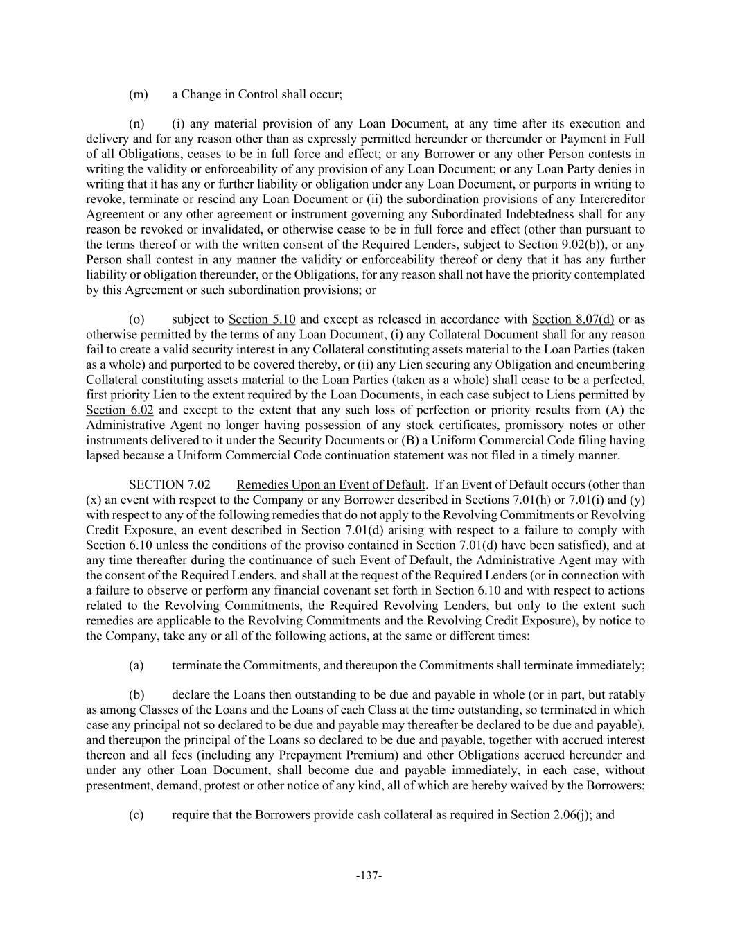 -137- (m) a Change in Control shall occur; (n) (i) any material provision of any Loan Document, at any time after its execution and delivery and for any reason other than as expressly permitted hereunder or thereunder or Payment in Full of all Obligations, ceases to be in full force and effect; or any Borrower or any other Person contests in writing the validity or enforceability of any provision of any Loan Document; or any Loan Party denies in writing that it has any or further liability or obligation under any Loan Document, or purports in writing to revoke, terminate or rescind any Loan Document or (ii) the subordination provisions of any Intercreditor Agreement or any other agreement or instrument governing any Subordinated Indebtedness shall for any reason be revoked or invalidated, or otherwise cease to be in full force and effect (other than pursuant to the terms thereof or with the written consent of the Required Lenders, subject to Section 9.02(b)), or any Person shall contest in any manner the validity or enforceability thereof or deny that it has any further liability or obligation thereunder, or the Obligations, for any reason shall not have the priority contemplated by this Agreement or such subordination provisions; or (o) subject to Section 5.10 and except as released in accordance with Section 8.07(d) or as otherwise permitted by the terms of any Loan Document, (i) any Collateral Document shall for any reason fail to create a valid security interest in any Collateral constituting assets material to the Loan Parties (taken as a whole) and purported to be covered thereby, or (ii) any Lien securing any Obligation and encumbering Collateral constituting assets material to the Loan Parties (taken as a whole) shall cease to be a perfected, first priority Lien to the extent required by the Loan Documents, in each case subject to Liens permitted by Section 6.02 and except to the extent that any such loss of perfection or priority results from (A) the Administrative Agent no longer having possession of any stock certificates, promissory notes or other instruments delivered to it under the Security Documents or (B) a Uniform Commercial Code filing having lapsed because a Uniform Commercial Code continuation statement was not filed in a timely manner. SECTION 7.02 Remedies Upon an Event of Default. If an Event of Default occurs (other than (x) an event with respect to the Company or any Borrower described in Sections 7.01(h) or 7.01(i) and (y) with respect to any of the following remedies that do not apply to the Revolving Commitments or Revolving Credit Exposure, an event described in Section 7.01(d) arising with respect to a failure to comply with Section 6.10 unless the conditions of the proviso contained in Section 7.01(d) have been satisfied), and at any time thereafter during the continuance of such Event of Default, the Administrative Agent may with the consent of the Required Lenders, and shall at the request of the Required Lenders (or in connection with a failure to observe or perform any financial covenant set forth in Section 6.10 and with respect to actions related to the Revolving Commitments, the Required Revolving Lenders, but only to the extent such remedies are applicable to the Revolving Commitments and the Revolving Credit Exposure), by notice to the Company, take any or all of the following actions, at the same or different times: (a) terminate the Commitments, and thereupon the Commitments shall terminate immediately; (b) declare the Loans then outstanding to be due and payable in whole (or in part, but ratably as among Classes of the Loans and the Loans of each Class at the time outstanding, so terminated in which case any principal not so declared to be due and payable may thereafter be declared to be due and payable), and thereupon the principal of the Loans so declared to be due and payable, together with accrued interest thereon and all fees (including any Prepayment Premium) and other Obligations accrued hereunder and under any other Loan Document, shall become due and payable immediately, in each case, without presentment, demand, protest or other notice of any kind, all of which are hereby waived by the Borrowers; (c) require that the Borrowers provide cash collateral as required in Section 2.06(j); and