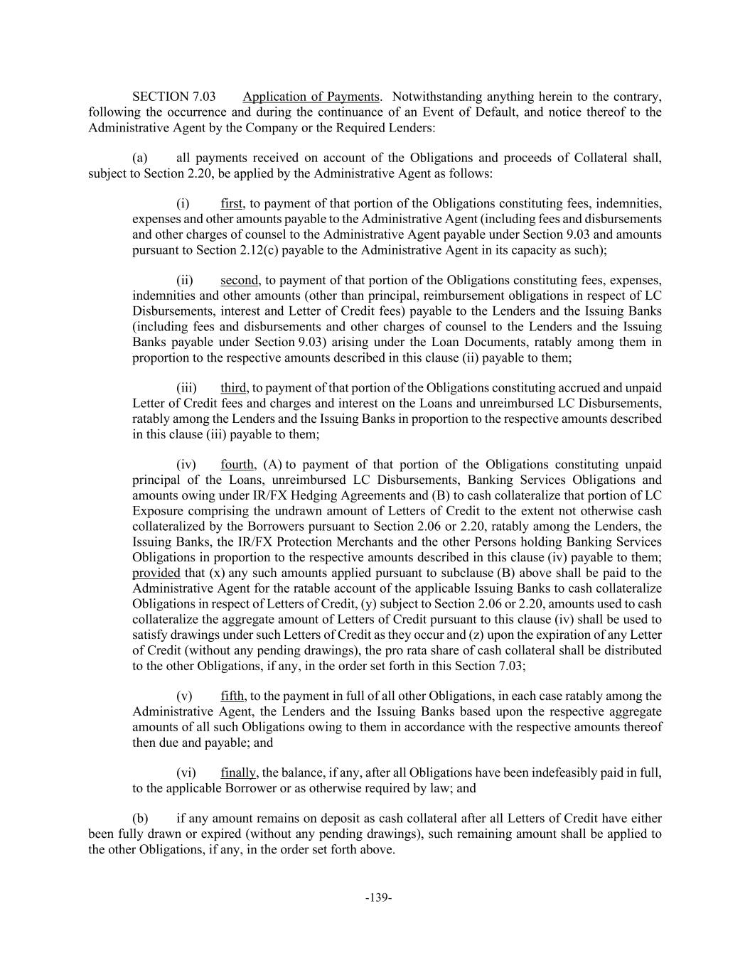 -139- SECTION 7.03 Application of Payments. Notwithstanding anything herein to the contrary, following the occurrence and during the continuance of an Event of Default, and notice thereof to the Administrative Agent by the Company or the Required Lenders: (a) all payments received on account of the Obligations and proceeds of Collateral shall, subject to Section 2.20, be applied by the Administrative Agent as follows: (i) first, to payment of that portion of the Obligations constituting fees, indemnities, expenses and other amounts payable to the Administrative Agent (including fees and disbursements and other charges of counsel to the Administrative Agent payable under Section 9.03 and amounts pursuant to Section 2.12(c) payable to the Administrative Agent in its capacity as such); (ii) second, to payment of that portion of the Obligations constituting fees, expenses, indemnities and other amounts (other than principal, reimbursement obligations in respect of LC Disbursements, interest and Letter of Credit fees) payable to the Lenders and the Issuing Banks (including fees and disbursements and other charges of counsel to the Lenders and the Issuing Banks payable under Section 9.03) arising under the Loan Documents, ratably among them in proportion to the respective amounts described in this clause (ii) payable to them; (iii) third, to payment of that portion of the Obligations constituting accrued and unpaid Letter of Credit fees and charges and interest on the Loans and unreimbursed LC Disbursements, ratably among the Lenders and the Issuing Banks in proportion to the respective amounts described in this clause (iii) payable to them; (iv) fourth, (A) to payment of that portion of the Obligations constituting unpaid principal of the Loans, unreimbursed LC Disbursements, Banking Services Obligations and amounts owing under IR/FX Hedging Agreements and (B) to cash collateralize that portion of LC Exposure comprising the undrawn amount of Letters of Credit to the extent not otherwise cash collateralized by the Borrowers pursuant to Section 2.06 or 2.20, ratably among the Lenders, the Issuing Banks, the IR/FX Protection Merchants and the other Persons holding Banking Services Obligations in proportion to the respective amounts described in this clause (iv) payable to them; provided that (x) any such amounts applied pursuant to subclause (B) above shall be paid to the Administrative Agent for the ratable account of the applicable Issuing Banks to cash collateralize Obligations in respect of Letters of Credit, (y) subject to Section 2.06 or 2.20, amounts used to cash collateralize the aggregate amount of Letters of Credit pursuant to this clause (iv) shall be used to satisfy drawings under such Letters of Credit as they occur and (z) upon the expiration of any Letter of Credit (without any pending drawings), the pro rata share of cash collateral shall be distributed to the other Obligations, if any, in the order set forth in this Section 7.03; (v) fifth, to the payment in full of all other Obligations, in each case ratably among the Administrative Agent, the Lenders and the Issuing Banks based upon the respective aggregate amounts of all such Obligations owing to them in accordance with the respective amounts thereof then due and payable; and (vi) finally, the balance, if any, after all Obligations have been indefeasibly paid in full, to the applicable Borrower or as otherwise required by law; and (b) if any amount remains on deposit as cash collateral after all Letters of Credit have either been fully drawn or expired (without any pending drawings), such remaining amount shall be applied to the other Obligations, if any, in the order set forth above.
