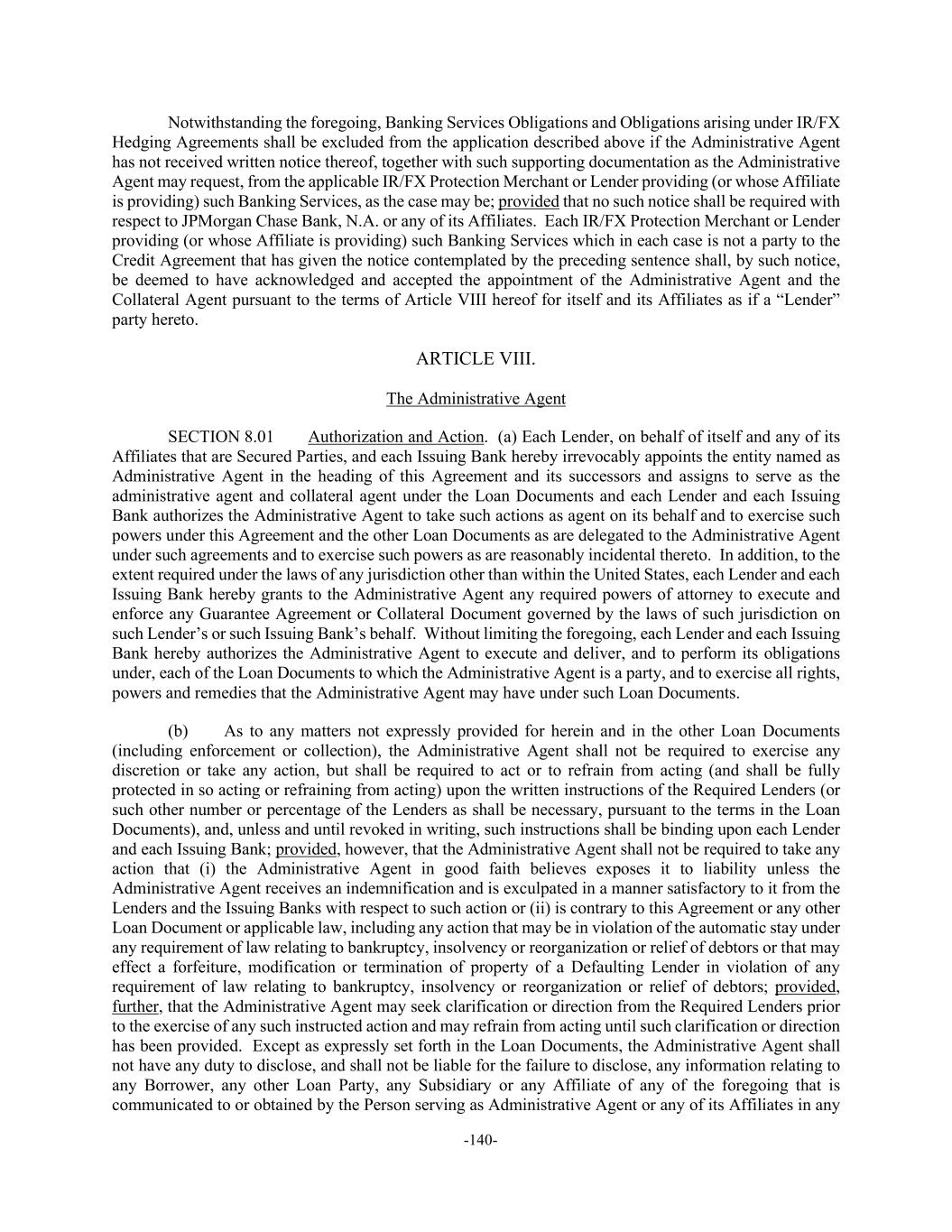 -140- Notwithstanding the foregoing, Banking Services Obligations and Obligations arising under IR/FX Hedging Agreements shall be excluded from the application described above if the Administrative Agent has not received written notice thereof, together with such supporting documentation as the Administrative Agent may request, from the applicable IR/FX Protection Merchant or Lender providing (or whose Affiliate is providing) such Banking Services, as the case may be; provided that no such notice shall be required with respect to JPMorgan Chase Bank, N.A. or any of its Affiliates. Each IR/FX Protection Merchant or Lender providing (or whose Affiliate is providing) such Banking Services which in each case is not a party to the Credit Agreement that has given the notice contemplated by the preceding sentence shall, by such notice, be deemed to have acknowledged and accepted the appointment of the Administrative Agent and the Collateral Agent pursuant to the terms of Article VIII hereof for itself and its Affiliates as if a “Lender” party hereto. ARTICLE VIII. The Administrative Agent SECTION 8.01 Authorization and Action. (a) Each Lender, on behalf of itself and any of its Affiliates that are Secured Parties, and each Issuing Bank hereby irrevocably appoints the entity named as Administrative Agent in the heading of this Agreement and its successors and assigns to serve as the administrative agent and collateral agent under the Loan Documents and each Lender and each Issuing Bank authorizes the Administrative Agent to take such actions as agent on its behalf and to exercise such powers under this Agreement and the other Loan Documents as are delegated to the Administrative Agent under such agreements and to exercise such powers as are reasonably incidental thereto. In addition, to the extent required under the laws of any jurisdiction other than within the United States, each Lender and each Issuing Bank hereby grants to the Administrative Agent any required powers of attorney to execute and enforce any Guarantee Agreement or Collateral Document governed by the laws of such jurisdiction on such Lender’s or such Issuing Bank’s behalf. Without limiting the foregoing, each Lender and each Issuing Bank hereby authorizes the Administrative Agent to execute and deliver, and to perform its obligations under, each of the Loan Documents to which the Administrative Agent is a party, and to exercise all rights, powers and remedies that the Administrative Agent may have under such Loan Documents. (b) As to any matters not expressly provided for herein and in the other Loan Documents (including enforcement or collection), the Administrative Agent shall not be required to exercise any discretion or take any action, but shall be required to act or to refrain from acting (and shall be fully protected in so acting or refraining from acting) upon the written instructions of the Required Lenders (or such other number or percentage of the Lenders as shall be necessary, pursuant to the terms in the Loan Documents), and, unless and until revoked in writing, such instructions shall be binding upon each Lender and each Issuing Bank; provided, however, that the Administrative Agent shall not be required to take any action that (i) the Administrative Agent in good faith believes exposes it to liability unless the Administrative Agent receives an indemnification and is exculpated in a manner satisfactory to it from the Lenders and the Issuing Banks with respect to such action or (ii) is contrary to this Agreement or any other Loan Document or applicable law, including any action that may be in violation of the automatic stay under any requirement of law relating to bankruptcy, insolvency or reorganization or relief of debtors or that may effect a forfeiture, modification or termination of property of a Defaulting Lender in violation of any requirement of law relating to bankruptcy, insolvency or reorganization or relief of debtors; provided, further, that the Administrative Agent may seek clarification or direction from the Required Lenders prior to the exercise of any such instructed action and may refrain from acting until such clarification or direction has been provided. Except as expressly set forth in the Loan Documents, the Administrative Agent shall not have any duty to disclose, and shall not be liable for the failure to disclose, any information relating to any Borrower, any other Loan Party, any Subsidiary or any Affiliate of any of the foregoing that is communicated to or obtained by the Person serving as Administrative Agent or any of its Affiliates in any
