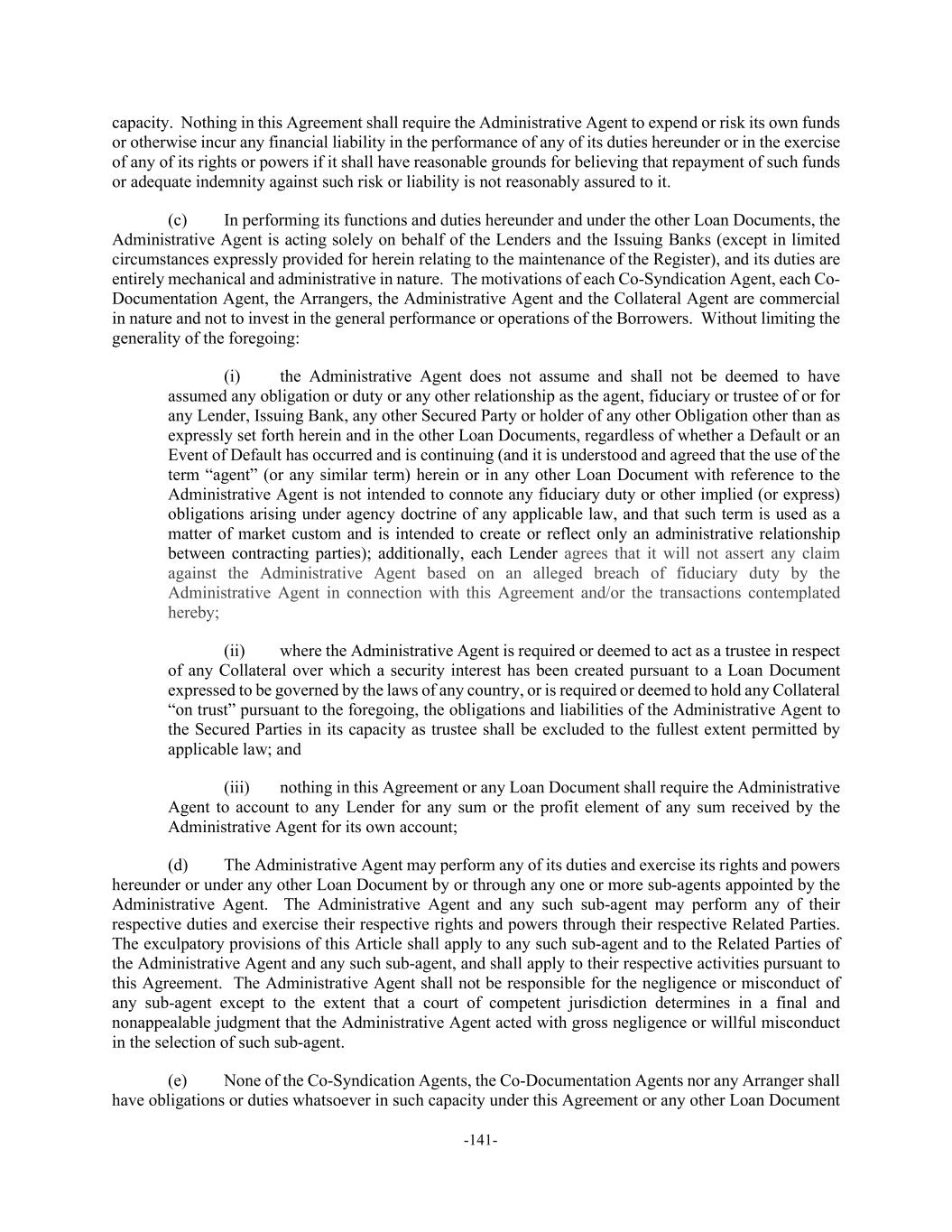 -141- capacity. Nothing in this Agreement shall require the Administrative Agent to expend or risk its own funds or otherwise incur any financial liability in the performance of any of its duties hereunder or in the exercise of any of its rights or powers if it shall have reasonable grounds for believing that repayment of such funds or adequate indemnity against such risk or liability is not reasonably assured to it. (c) In performing its functions and duties hereunder and under the other Loan Documents, the Administrative Agent is acting solely on behalf of the Lenders and the Issuing Banks (except in limited circumstances expressly provided for herein relating to the maintenance of the Register), and its duties are entirely mechanical and administrative in nature. The motivations of each Co-Syndication Agent, each Co- Documentation Agent, the Arrangers, the Administrative Agent and the Collateral Agent are commercial in nature and not to invest in the general performance or operations of the Borrowers. Without limiting the generality of the foregoing: (i) the Administrative Agent does not assume and shall not be deemed to have assumed any obligation or duty or any other relationship as the agent, fiduciary or trustee of or for any Lender, Issuing Bank, any other Secured Party or holder of any other Obligation other than as expressly set forth herein and in the other Loan Documents, regardless of whether a Default or an Event of Default has occurred and is continuing (and it is understood and agreed that the use of the term “agent” (or any similar term) herein or in any other Loan Document with reference to the Administrative Agent is not intended to connote any fiduciary duty or other implied (or express) obligations arising under agency doctrine of any applicable law, and that such term is used as a matter of market custom and is intended to create or reflect only an administrative relationship between contracting parties); additionally, each Lender agrees that it will not assert any claim against the Administrative Agent based on an alleged breach of fiduciary duty by the Administrative Agent in connection with this Agreement and/or the transactions contemplated hereby; (ii) where the Administrative Agent is required or deemed to act as a trustee in respect of any Collateral over which a security interest has been created pursuant to a Loan Document expressed to be governed by the laws of any country, or is required or deemed to hold any Collateral “on trust” pursuant to the foregoing, the obligations and liabilities of the Administrative Agent to the Secured Parties in its capacity as trustee shall be excluded to the fullest extent permitted by applicable law; and (iii) nothing in this Agreement or any Loan Document shall require the Administrative Agent to account to any Lender for any sum or the profit element of any sum received by the Administrative Agent for its own account; (d) The Administrative Agent may perform any of its duties and exercise its rights and powers hereunder or under any other Loan Document by or through any one or more sub-agents appointed by the Administrative Agent. The Administrative Agent and any such sub-agent may perform any of their respective duties and exercise their respective rights and powers through their respective Related Parties. The exculpatory provisions of this Article shall apply to any such sub-agent and to the Related Parties of the Administrative Agent and any such sub-agent, and shall apply to their respective activities pursuant to this Agreement. The Administrative Agent shall not be responsible for the negligence or misconduct of any sub-agent except to the extent that a court of competent jurisdiction determines in a final and nonappealable judgment that the Administrative Agent acted with gross negligence or willful misconduct in the selection of such sub-agent. (e) None of the Co-Syndication Agents, the Co-Documentation Agents nor any Arranger shall have obligations or duties whatsoever in such capacity under this Agreement or any other Loan Document