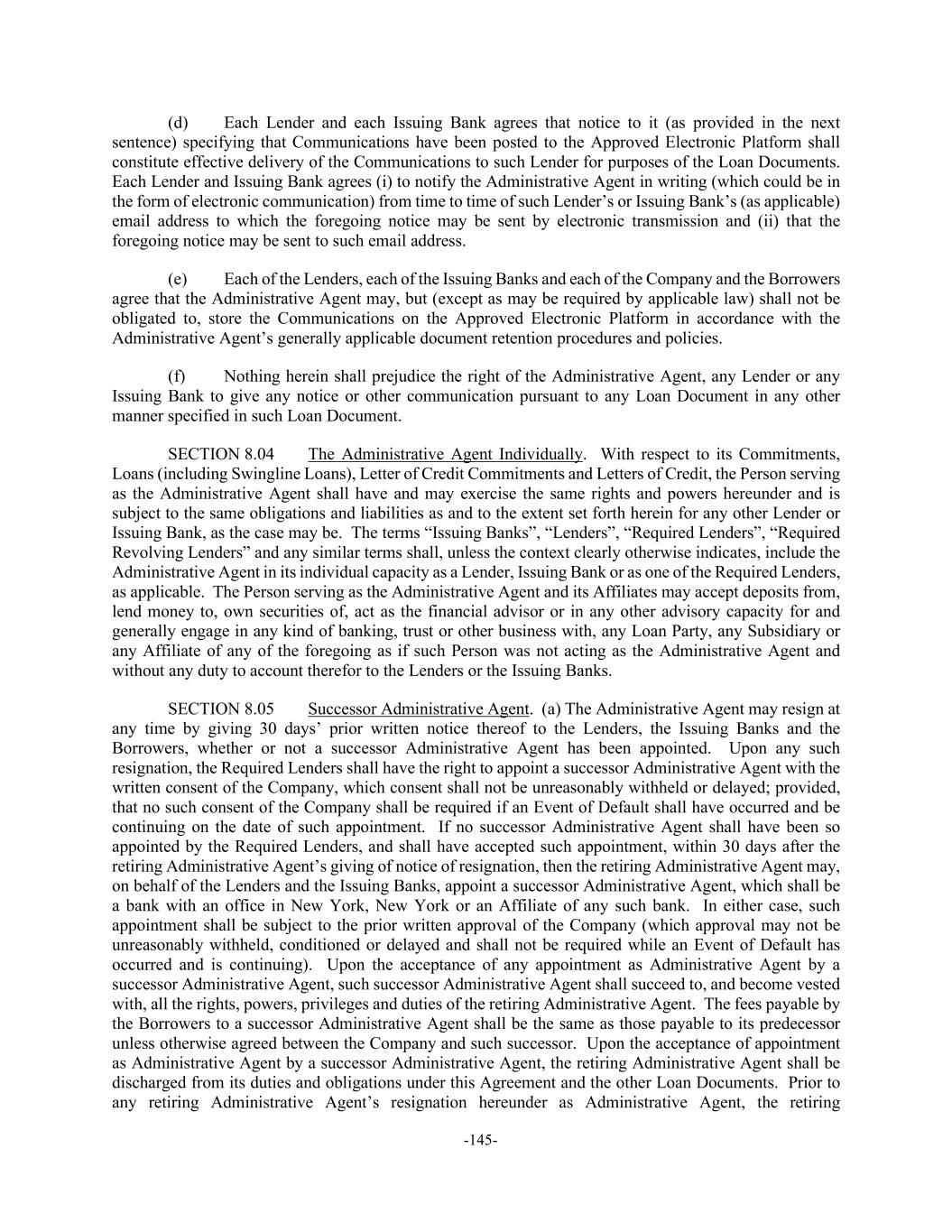 -145- (d) Each Lender and each Issuing Bank agrees that notice to it (as provided in the next sentence) specifying that Communications have been posted to the Approved Electronic Platform shall constitute effective delivery of the Communications to such Lender for purposes of the Loan Documents. Each Lender and Issuing Bank agrees (i) to notify the Administrative Agent in writing (which could be in the form of electronic communication) from time to time of such Lender’s or Issuing Bank’s (as applicable) email address to which the foregoing notice may be sent by electronic transmission and (ii) that the foregoing notice may be sent to such email address. (e) Each of the Lenders, each of the Issuing Banks and each of the Company and the Borrowers agree that the Administrative Agent may, but (except as may be required by applicable law) shall not be obligated to, store the Communications on the Approved Electronic Platform in accordance with the Administrative Agent’s generally applicable document retention procedures and policies. (f) Nothing herein shall prejudice the right of the Administrative Agent, any Lender or any Issuing Bank to give any notice or other communication pursuant to any Loan Document in any other manner specified in such Loan Document. SECTION 8.04 The Administrative Agent Individually. With respect to its Commitments, Loans (including Swingline Loans), Letter of Credit Commitments and Letters of Credit, the Person serving as the Administrative Agent shall have and may exercise the same rights and powers hereunder and is subject to the same obligations and liabilities as and to the extent set forth herein for any other Lender or Issuing Bank, as the case may be. The terms “Issuing Banks”, “Lenders”, “Required Lenders”, “Required Revolving Lenders” and any similar terms shall, unless the context clearly otherwise indicates, include the Administrative Agent in its individual capacity as a Lender, Issuing Bank or as one of the Required Lenders, as applicable. The Person serving as the Administrative Agent and its Affiliates may accept deposits from, lend money to, own securities of, act as the financial advisor or in any other advisory capacity for and generally engage in any kind of banking, trust or other business with, any Loan Party, any Subsidiary or any Affiliate of any of the foregoing as if such Person was not acting as the Administrative Agent and without any duty to account therefor to the Lenders or the Issuing Banks. SECTION 8.05 Successor Administrative Agent. (a) The Administrative Agent may resign at any time by giving 30 days’ prior written notice thereof to the Lenders, the Issuing Banks and the Borrowers, whether or not a successor Administrative Agent has been appointed. Upon any such resignation, the Required Lenders shall have the right to appoint a successor Administrative Agent with the written consent of the Company, which consent shall not be unreasonably withheld or delayed; provided, that no such consent of the Company shall be required if an Event of Default shall have occurred and be continuing on the date of such appointment. If no successor Administrative Agent shall have been so appointed by the Required Lenders, and shall have accepted such appointment, within 30 days after the retiring Administrative Agent’s giving of notice of resignation, then the retiring Administrative Agent may, on behalf of the Lenders and the Issuing Banks, appoint a successor Administrative Agent, which shall be a bank with an office in New York, New York or an Affiliate of any such bank. In either case, such appointment shall be subject to the prior written approval of the Company (which approval may not be unreasonably withheld, conditioned or delayed and shall not be required while an Event of Default has occurred and is continuing). Upon the acceptance of any appointment as Administrative Agent by a successor Administrative Agent, such successor Administrative Agent shall succeed to, and become vested with, all the rights, powers, privileges and duties of the retiring Administrative Agent. The fees payable by the Borrowers to a successor Administrative Agent shall be the same as those payable to its predecessor unless otherwise agreed between the Company and such successor. Upon the acceptance of appointment as Administrative Agent by a successor Administrative Agent, the retiring Administrative Agent shall be discharged from its duties and obligations under this Agreement and the other Loan Documents. Prior to any retiring Administrative Agent’s resignation hereunder as Administrative Agent, the retiring