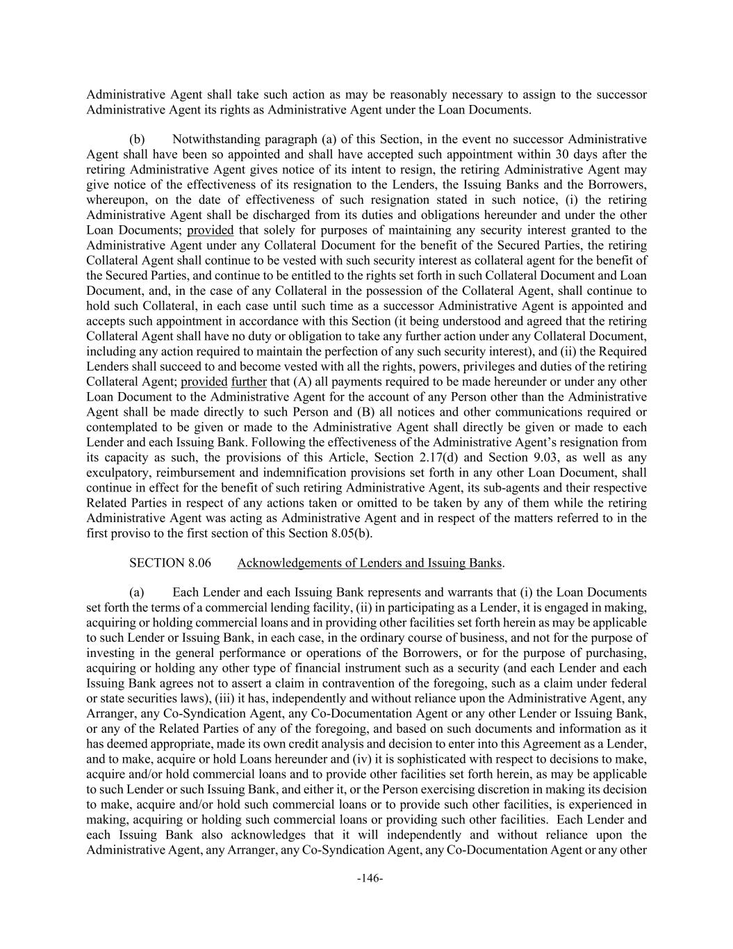 -146- Administrative Agent shall take such action as may be reasonably necessary to assign to the successor Administrative Agent its rights as Administrative Agent under the Loan Documents. (b) Notwithstanding paragraph (a) of this Section, in the event no successor Administrative Agent shall have been so appointed and shall have accepted such appointment within 30 days after the retiring Administrative Agent gives notice of its intent to resign, the retiring Administrative Agent may give notice of the effectiveness of its resignation to the Lenders, the Issuing Banks and the Borrowers, whereupon, on the date of effectiveness of such resignation stated in such notice, (i) the retiring Administrative Agent shall be discharged from its duties and obligations hereunder and under the other Loan Documents; provided that solely for purposes of maintaining any security interest granted to the Administrative Agent under any Collateral Document for the benefit of the Secured Parties, the retiring Collateral Agent shall continue to be vested with such security interest as collateral agent for the benefit of the Secured Parties, and continue to be entitled to the rights set forth in such Collateral Document and Loan Document, and, in the case of any Collateral in the possession of the Collateral Agent, shall continue to hold such Collateral, in each case until such time as a successor Administrative Agent is appointed and accepts such appointment in accordance with this Section (it being understood and agreed that the retiring Collateral Agent shall have no duty or obligation to take any further action under any Collateral Document, including any action required to maintain the perfection of any such security interest), and (ii) the Required Lenders shall succeed to and become vested with all the rights, powers, privileges and duties of the retiring Collateral Agent; provided further that (A) all payments required to be made hereunder or under any other Loan Document to the Administrative Agent for the account of any Person other than the Administrative Agent shall be made directly to such Person and (B) all notices and other communications required or contemplated to be given or made to the Administrative Agent shall directly be given or made to each Lender and each Issuing Bank. Following the effectiveness of the Administrative Agent’s resignation from its capacity as such, the provisions of this Article, Section 2.17(d) and Section 9.03, as well as any exculpatory, reimbursement and indemnification provisions set forth in any other Loan Document, shall continue in effect for the benefit of such retiring Administrative Agent, its sub-agents and their respective Related Parties in respect of any actions taken or omitted to be taken by any of them while the retiring Administrative Agent was acting as Administrative Agent and in respect of the matters referred to in the first proviso to the first section of this Section 8.05(b). SECTION 8.06 Acknowledgements of Lenders and Issuing Banks. (a) Each Lender and each Issuing Bank represents and warrants that (i) the Loan Documents set forth the terms of a commercial lending facility, (ii) in participating as a Lender, it is engaged in making, acquiring or holding commercial loans and in providing other facilities set forth herein as may be applicable to such Lender or Issuing Bank, in each case, in the ordinary course of business, and not for the purpose of investing in the general performance or operations of the Borrowers, or for the purpose of purchasing, acquiring or holding any other type of financial instrument such as a security (and each Lender and each Issuing Bank agrees not to assert a claim in contravention of the foregoing, such as a claim under federal or state securities laws), (iii) it has, independently and without reliance upon the Administrative Agent, any Arranger, any Co-Syndication Agent, any Co-Documentation Agent or any other Lender or Issuing Bank, or any of the Related Parties of any of the foregoing, and based on such documents and information as it has deemed appropriate, made its own credit analysis and decision to enter into this Agreement as a Lender, and to make, acquire or hold Loans hereunder and (iv) it is sophisticated with respect to decisions to make, acquire and/or hold commercial loans and to provide other facilities set forth herein, as may be applicable to such Lender or such Issuing Bank, and either it, or the Person exercising discretion in making its decision to make, acquire and/or hold such commercial loans or to provide such other facilities, is experienced in making, acquiring or holding such commercial loans or providing such other facilities. Each Lender and each Issuing Bank also acknowledges that it will independently and without reliance upon the Administrative Agent, any Arranger, any Co-Syndication Agent, any Co-Documentation Agent or any other