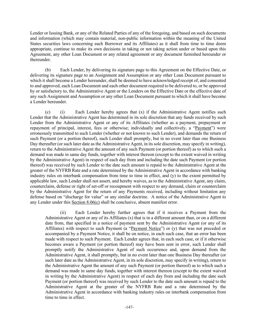 -147- Lender or Issuing Bank, or any of the Related Parties of any of the foregoing, and based on such documents and information (which may contain material, non-public information within the meaning of the United States securities laws concerning each Borrower and its Affiliates) as it shall from time to time deem appropriate, continue to make its own decisions in taking or not taking action under or based upon this Agreement, any other Loan Document or any related agreement or any document furnished hereunder or thereunder. (b) Each Lender, by delivering its signature page to this Agreement on the Effective Date, or delivering its signature page to an Assignment and Assumption or any other Loan Document pursuant to which it shall become a Lender hereunder, shall be deemed to have acknowledged receipt of, and consented to and approved, each Loan Document and each other document required to be delivered to, or be approved by or satisfactory to, the Administrative Agent or the Lenders on the Effective Date or the effective date of any such Assignment and Assumption or any other Loan Document pursuant to which it shall have become a Lender hereunder. (c) (i) Each Lender hereby agrees that (x) if the Administrative Agent notifies such Lender that the Administrative Agent has determined in its sole discretion that any funds received by such Lender from the Administrative Agent or any of its Affiliates (whether as a payment, prepayment or repayment of principal, interest, fees or otherwise; individually and collectively, a “Payment”) were erroneously transmitted to such Lender (whether or not known to such Lender), and demands the return of such Payment (or a portion thereof), such Lender shall promptly, but in no event later than one Business Day thereafter (or such later date as the Administrative Agent, in its sole discretion, may specify in writing), return to the Administrative Agent the amount of any such Payment (or portion thereof) as to which such a demand was made in same day funds, together with interest thereon (except to the extent waived in writing by the Administrative Agent) in respect of each day from and including the date such Payment (or portion thereof) was received by such Lender to the date such amount is repaid to the Administrative Agent at the greater of the NYFRB Rate and a rate determined by the Administrative Agent in accordance with banking industry rules on interbank compensation from time to time in effect, and (y) to the extent permitted by applicable law, such Lender shall not assert, and hereby waives, as to the Administrative Agent, any claim, counterclaim, defense or right of set-off or recoupment with respect to any demand, claim or counterclaim by the Administrative Agent for the return of any Payments received, including without limitation any defense based on “discharge for value” or any similar doctrine. A notice of the Administrative Agent to any Lender under this Section 8.06(c) shall be conclusive, absent manifest error. (ii) Each Lender hereby further agrees that if it receives a Payment from the Administrative Agent or any of its Affiliates (x) that is in a different amount than, or on a different date from, that specified in a notice of payment sent by the Administrative Agent (or any of its Affiliates) with respect to such Payment (a “Payment Notice”) or (y) that was not preceded or accompanied by a Payment Notice, it shall be on notice, in each such case, that an error has been made with respect to such Payment. Each Lender agrees that, in each such case, or if it otherwise becomes aware a Payment (or portion thereof) may have been sent in error, such Lender shall promptly notify the Administrative Agent of such occurrence and, upon demand from the Administrative Agent, it shall promptly, but in no event later than one Business Day thereafter (or such later date as the Administrative Agent, in its sole discretion, may specify in writing), return to the Administrative Agent the amount of any such Payment (or portion thereof) as to which such a demand was made in same day funds, together with interest thereon (except to the extent waived in writing by the Administrative Agent) in respect of each day from and including the date such Payment (or portion thereof) was received by such Lender to the date such amount is repaid to the Administrative Agent at the greater of the NYFRB Rate and a rate determined by the Administrative Agent in accordance with banking industry rules on interbank compensation from time to time in effect.