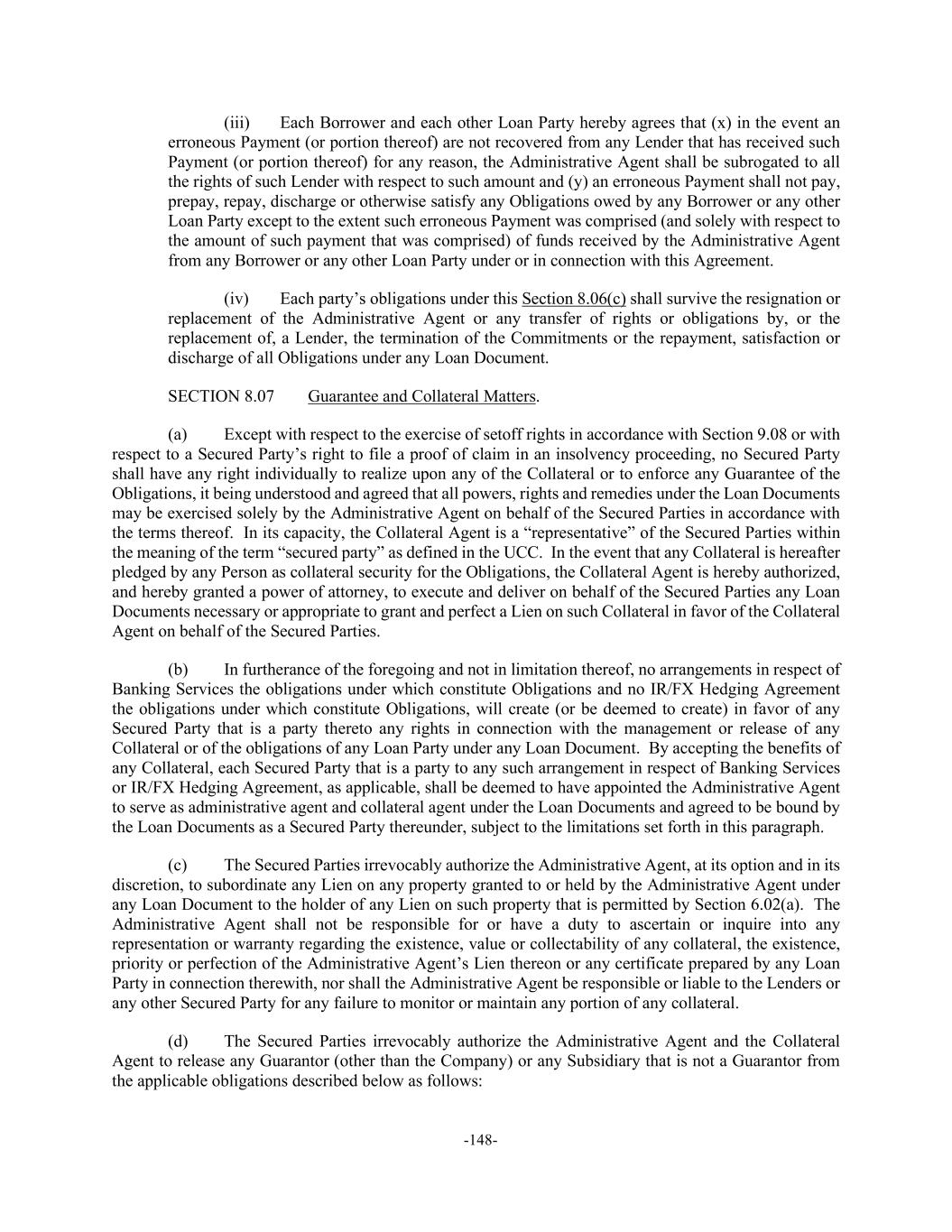 -148- (iii) Each Borrower and each other Loan Party hereby agrees that (x) in the event an erroneous Payment (or portion thereof) are not recovered from any Lender that has received such Payment (or portion thereof) for any reason, the Administrative Agent shall be subrogated to all the rights of such Lender with respect to such amount and (y) an erroneous Payment shall not pay, prepay, repay, discharge or otherwise satisfy any Obligations owed by any Borrower or any other Loan Party except to the extent such erroneous Payment was comprised (and solely with respect to the amount of such payment that was comprised) of funds received by the Administrative Agent from any Borrower or any other Loan Party under or in connection with this Agreement. (iv) Each party’s obligations under this Section 8.06(c) shall survive the resignation or replacement of the Administrative Agent or any transfer of rights or obligations by, or the replacement of, a Lender, the termination of the Commitments or the repayment, satisfaction or discharge of all Obligations under any Loan Document. SECTION 8.07 Guarantee and Collateral Matters. (a) Except with respect to the exercise of setoff rights in accordance with Section 9.08 or with respect to a Secured Party’s right to file a proof of claim in an insolvency proceeding, no Secured Party shall have any right individually to realize upon any of the Collateral or to enforce any Guarantee of the Obligations, it being understood and agreed that all powers, rights and remedies under the Loan Documents may be exercised solely by the Administrative Agent on behalf of the Secured Parties in accordance with the terms thereof. In its capacity, the Collateral Agent is a “representative” of the Secured Parties within the meaning of the term “secured party” as defined in the UCC. In the event that any Collateral is hereafter pledged by any Person as collateral security for the Obligations, the Collateral Agent is hereby authorized, and hereby granted a power of attorney, to execute and deliver on behalf of the Secured Parties any Loan Documents necessary or appropriate to grant and perfect a Lien on such Collateral in favor of the Collateral Agent on behalf of the Secured Parties. (b) In furtherance of the foregoing and not in limitation thereof, no arrangements in respect of Banking Services the obligations under which constitute Obligations and no IR/FX Hedging Agreement the obligations under which constitute Obligations, will create (or be deemed to create) in favor of any Secured Party that is a party thereto any rights in connection with the management or release of any Collateral or of the obligations of any Loan Party under any Loan Document. By accepting the benefits of any Collateral, each Secured Party that is a party to any such arrangement in respect of Banking Services or IR/FX Hedging Agreement, as applicable, shall be deemed to have appointed the Administrative Agent to serve as administrative agent and collateral agent under the Loan Documents and agreed to be bound by the Loan Documents as a Secured Party thereunder, subject to the limitations set forth in this paragraph. (c) The Secured Parties irrevocably authorize the Administrative Agent, at its option and in its discretion, to subordinate any Lien on any property granted to or held by the Administrative Agent under any Loan Document to the holder of any Lien on such property that is permitted by Section 6.02(a). The Administrative Agent shall not be responsible for or have a duty to ascertain or inquire into any representation or warranty regarding the existence, value or collectability of any collateral, the existence, priority or perfection of the Administrative Agent’s Lien thereon or any certificate prepared by any Loan Party in connection therewith, nor shall the Administrative Agent be responsible or liable to the Lenders or any other Secured Party for any failure to monitor or maintain any portion of any collateral. (d) The Secured Parties irrevocably authorize the Administrative Agent and the Collateral Agent to release any Guarantor (other than the Company) or any Subsidiary that is not a Guarantor from the applicable obligations described below as follows: