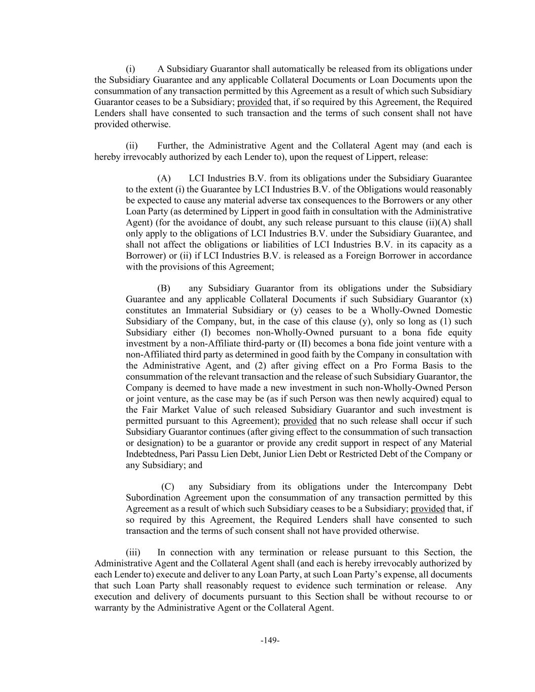 -149- (i) A Subsidiary Guarantor shall automatically be released from its obligations under the Subsidiary Guarantee and any applicable Collateral Documents or Loan Documents upon the consummation of any transaction permitted by this Agreement as a result of which such Subsidiary Guarantor ceases to be a Subsidiary; provided that, if so required by this Agreement, the Required Lenders shall have consented to such transaction and the terms of such consent shall not have provided otherwise. (ii) Further, the Administrative Agent and the Collateral Agent may (and each is hereby irrevocably authorized by each Lender to), upon the request of Lippert, release: (A) LCI Industries B.V. from its obligations under the Subsidiary Guarantee to the extent (i) the Guarantee by LCI Industries B.V. of the Obligations would reasonably be expected to cause any material adverse tax consequences to the Borrowers or any other Loan Party (as determined by Lippert in good faith in consultation with the Administrative Agent) (for the avoidance of doubt, any such release pursuant to this clause (ii)(A) shall only apply to the obligations of LCI Industries B.V. under the Subsidiary Guarantee, and shall not affect the obligations or liabilities of LCI Industries B.V. in its capacity as a Borrower) or (ii) if LCI Industries B.V. is released as a Foreign Borrower in accordance with the provisions of this Agreement; (B) any Subsidiary Guarantor from its obligations under the Subsidiary Guarantee and any applicable Collateral Documents if such Subsidiary Guarantor (x) constitutes an Immaterial Subsidiary or (y) ceases to be a Wholly-Owned Domestic Subsidiary of the Company, but, in the case of this clause (y), only so long as (1) such Subsidiary either (I) becomes non-Wholly-Owned pursuant to a bona fide equity investment by a non-Affiliate third-party or (II) becomes a bona fide joint venture with a non-Affiliated third party as determined in good faith by the Company in consultation with the Administrative Agent, and (2) after giving effect on a Pro Forma Basis to the consummation of the relevant transaction and the release of such Subsidiary Guarantor, the Company is deemed to have made a new investment in such non-Wholly-Owned Person or joint venture, as the case may be (as if such Person was then newly acquired) equal to the Fair Market Value of such released Subsidiary Guarantor and such investment is permitted pursuant to this Agreement); provided that no such release shall occur if such Subsidiary Guarantor continues (after giving effect to the consummation of such transaction or designation) to be a guarantor or provide any credit support in respect of any Material Indebtedness, Pari Passu Lien Debt, Junior Lien Debt or Restricted Debt of the Company or any Subsidiary; and (C) any Subsidiary from its obligations under the Intercompany Debt Subordination Agreement upon the consummation of any transaction permitted by this Agreement as a result of which such Subsidiary ceases to be a Subsidiary; provided that, if so required by this Agreement, the Required Lenders shall have consented to such transaction and the terms of such consent shall not have provided otherwise. (iii) In connection with any termination or release pursuant to this Section, the Administrative Agent and the Collateral Agent shall (and each is hereby irrevocably authorized by each Lender to) execute and deliver to any Loan Party, at such Loan Party’s expense, all documents that such Loan Party shall reasonably request to evidence such termination or release. Any execution and delivery of documents pursuant to this Section shall be without recourse to or warranty by the Administrative Agent or the Collateral Agent.