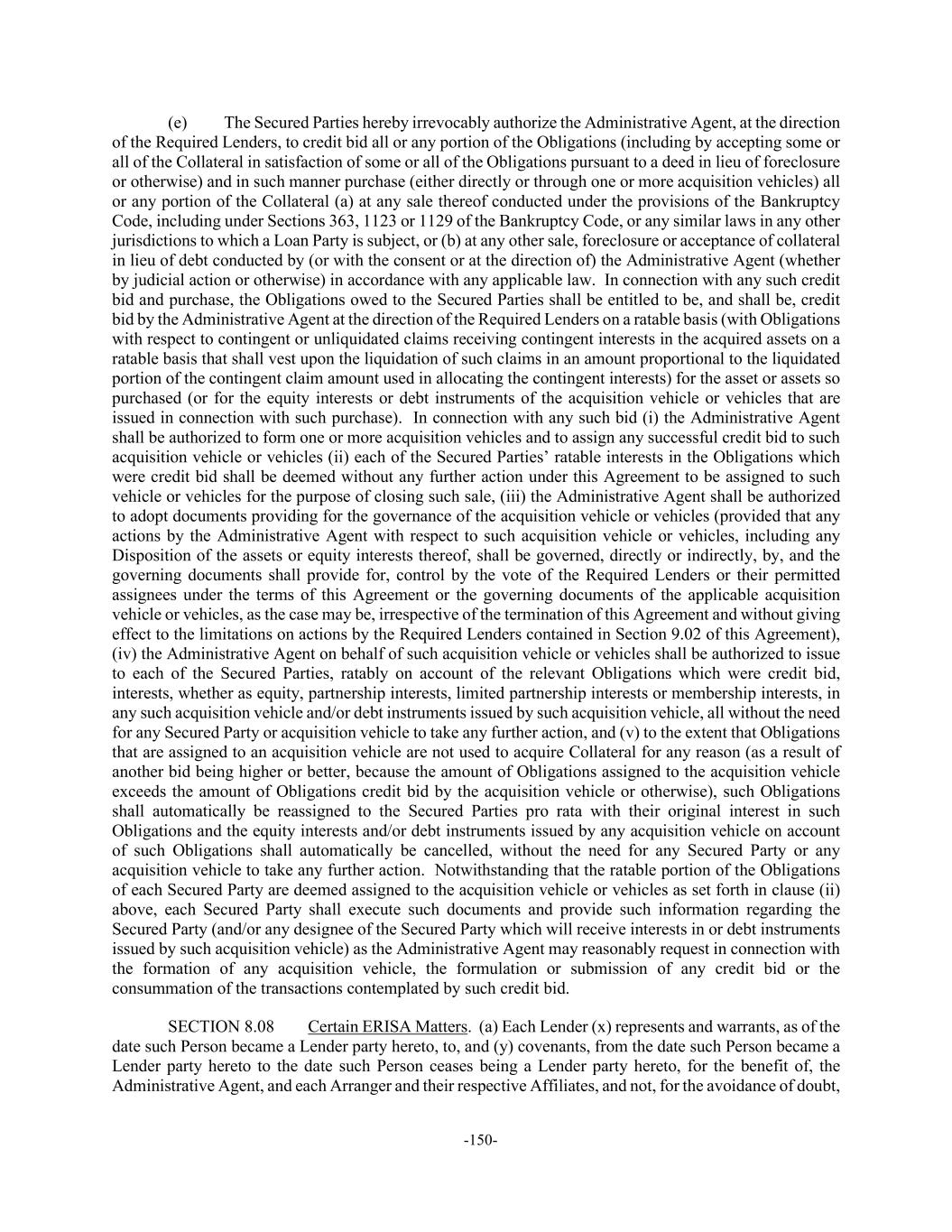 -150- (e) The Secured Parties hereby irrevocably authorize the Administrative Agent, at the direction of the Required Lenders, to credit bid all or any portion of the Obligations (including by accepting some or all of the Collateral in satisfaction of some or all of the Obligations pursuant to a deed in lieu of foreclosure or otherwise) and in such manner purchase (either directly or through one or more acquisition vehicles) all or any portion of the Collateral (a) at any sale thereof conducted under the provisions of the Bankruptcy Code, including under Sections 363, 1123 or 1129 of the Bankruptcy Code, or any similar laws in any other jurisdictions to which a Loan Party is subject, or (b) at any other sale, foreclosure or acceptance of collateral in lieu of debt conducted by (or with the consent or at the direction of) the Administrative Agent (whether by judicial action or otherwise) in accordance with any applicable law. In connection with any such credit bid and purchase, the Obligations owed to the Secured Parties shall be entitled to be, and shall be, credit bid by the Administrative Agent at the direction of the Required Lenders on a ratable basis (with Obligations with respect to contingent or unliquidated claims receiving contingent interests in the acquired assets on a ratable basis that shall vest upon the liquidation of such claims in an amount proportional to the liquidated portion of the contingent claim amount used in allocating the contingent interests) for the asset or assets so purchased (or for the equity interests or debt instruments of the acquisition vehicle or vehicles that are issued in connection with such purchase). In connection with any such bid (i) the Administrative Agent shall be authorized to form one or more acquisition vehicles and to assign any successful credit bid to such acquisition vehicle or vehicles (ii) each of the Secured Parties’ ratable interests in the Obligations which were credit bid shall be deemed without any further action under this Agreement to be assigned to such vehicle or vehicles for the purpose of closing such sale, (iii) the Administrative Agent shall be authorized to adopt documents providing for the governance of the acquisition vehicle or vehicles (provided that any actions by the Administrative Agent with respect to such acquisition vehicle or vehicles, including any Disposition of the assets or equity interests thereof, shall be governed, directly or indirectly, by, and the governing documents shall provide for, control by the vote of the Required Lenders or their permitted assignees under the terms of this Agreement or the governing documents of the applicable acquisition vehicle or vehicles, as the case may be, irrespective of the termination of this Agreement and without giving effect to the limitations on actions by the Required Lenders contained in Section 9.02 of this Agreement), (iv) the Administrative Agent on behalf of such acquisition vehicle or vehicles shall be authorized to issue to each of the Secured Parties, ratably on account of the relevant Obligations which were credit bid, interests, whether as equity, partnership interests, limited partnership interests or membership interests, in any such acquisition vehicle and/or debt instruments issued by such acquisition vehicle, all without the need for any Secured Party or acquisition vehicle to take any further action, and (v) to the extent that Obligations that are assigned to an acquisition vehicle are not used to acquire Collateral for any reason (as a result of another bid being higher or better, because the amount of Obligations assigned to the acquisition vehicle exceeds the amount of Obligations credit bid by the acquisition vehicle or otherwise), such Obligations shall automatically be reassigned to the Secured Parties pro rata with their original interest in such Obligations and the equity interests and/or debt instruments issued by any acquisition vehicle on account of such Obligations shall automatically be cancelled, without the need for any Secured Party or any acquisition vehicle to take any further action. Notwithstanding that the ratable portion of the Obligations of each Secured Party are deemed assigned to the acquisition vehicle or vehicles as set forth in clause (ii) above, each Secured Party shall execute such documents and provide such information regarding the Secured Party (and/or any designee of the Secured Party which will receive interests in or debt instruments issued by such acquisition vehicle) as the Administrative Agent may reasonably request in connection with the formation of any acquisition vehicle, the formulation or submission of any credit bid or the consummation of the transactions contemplated by such credit bid. SECTION 8.08 Certain ERISA Matters. (a) Each Lender (x) represents and warrants, as of the date such Person became a Lender party hereto, to, and (y) covenants, from the date such Person became a Lender party hereto to the date such Person ceases being a Lender party hereto, for the benefit of, the Administrative Agent, and each Arranger and their respective Affiliates, and not, for the avoidance of doubt,