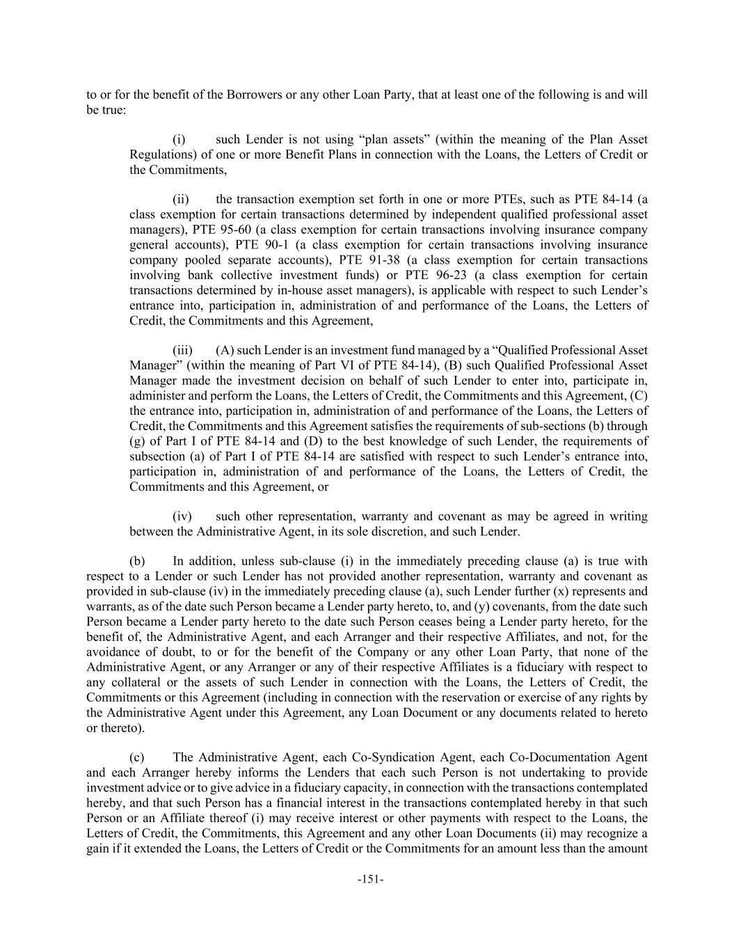 -151- to or for the benefit of the Borrowers or any other Loan Party, that at least one of the following is and will be true: (i) such Lender is not using “plan assets” (within the meaning of the Plan Asset Regulations) of one or more Benefit Plans in connection with the Loans, the Letters of Credit or the Commitments, (ii) the transaction exemption set forth in one or more PTEs, such as PTE 84-14 (a class exemption for certain transactions determined by independent qualified professional asset managers), PTE 95-60 (a class exemption for certain transactions involving insurance company general accounts), PTE 90-1 (a class exemption for certain transactions involving insurance company pooled separate accounts), PTE 91-38 (a class exemption for certain transactions involving bank collective investment funds) or PTE 96-23 (a class exemption for certain transactions determined by in-house asset managers), is applicable with respect to such Lender’s entrance into, participation in, administration of and performance of the Loans, the Letters of Credit, the Commitments and this Agreement, (iii) (A) such Lender is an investment fund managed by a “Qualified Professional Asset Manager” (within the meaning of Part VI of PTE 84-14), (B) such Qualified Professional Asset Manager made the investment decision on behalf of such Lender to enter into, participate in, administer and perform the Loans, the Letters of Credit, the Commitments and this Agreement, (C) the entrance into, participation in, administration of and performance of the Loans, the Letters of Credit, the Commitments and this Agreement satisfies the requirements of sub-sections (b) through (g) of Part I of PTE 84-14 and (D) to the best knowledge of such Lender, the requirements of subsection (a) of Part I of PTE 84-14 are satisfied with respect to such Lender’s entrance into, participation in, administration of and performance of the Loans, the Letters of Credit, the Commitments and this Agreement, or (iv) such other representation, warranty and covenant as may be agreed in writing between the Administrative Agent, in its sole discretion, and such Lender. (b) In addition, unless sub-clause (i) in the immediately preceding clause (a) is true with respect to a Lender or such Lender has not provided another representation, warranty and covenant as provided in sub-clause (iv) in the immediately preceding clause (a), such Lender further (x) represents and warrants, as of the date such Person became a Lender party hereto, to, and (y) covenants, from the date such Person became a Lender party hereto to the date such Person ceases being a Lender party hereto, for the benefit of, the Administrative Agent, and each Arranger and their respective Affiliates, and not, for the avoidance of doubt, to or for the benefit of the Company or any other Loan Party, that none of the Administrative Agent, or any Arranger or any of their respective Affiliates is a fiduciary with respect to any collateral or the assets of such Lender in connection with the Loans, the Letters of Credit, the Commitments or this Agreement (including in connection with the reservation or exercise of any rights by the Administrative Agent under this Agreement, any Loan Document or any documents related to hereto or thereto). (c) The Administrative Agent, each Co-Syndication Agent, each Co-Documentation Agent and each Arranger hereby informs the Lenders that each such Person is not undertaking to provide investment advice or to give advice in a fiduciary capacity, in connection with the transactions contemplated hereby, and that such Person has a financial interest in the transactions contemplated hereby in that such Person or an Affiliate thereof (i) may receive interest or other payments with respect to the Loans, the Letters of Credit, the Commitments, this Agreement and any other Loan Documents (ii) may recognize a gain if it extended the Loans, the Letters of Credit or the Commitments for an amount less than the amount