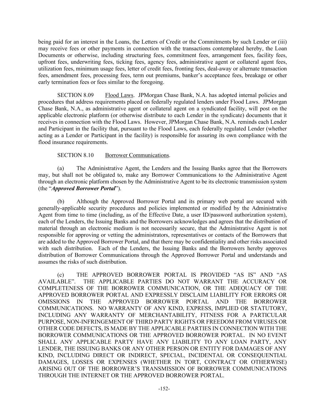 -152- being paid for an interest in the Loans, the Letters of Credit or the Commitments by such Lender or (iii) may receive fees or other payments in connection with the transactions contemplated hereby, the Loan Documents or otherwise, including structuring fees, commitment fees, arrangement fees, facility fees, upfront fees, underwriting fees, ticking fees, agency fees, administrative agent or collateral agent fees, utilization fees, minimum usage fees, letter of credit fees, fronting fees, deal-away or alternate transaction fees, amendment fees, processing fees, term out premiums, banker’s acceptance fees, breakage or other early termination fees or fees similar to the foregoing. SECTION 8.09 Flood Laws. JPMorgan Chase Bank, N.A. has adopted internal policies and procedures that address requirements placed on federally regulated lenders under Flood Laws. JPMorgan Chase Bank, N.A., as administrative agent or collateral agent on a syndicated facility, will post on the applicable electronic platform (or otherwise distribute to each Lender in the syndicate) documents that it receives in connection with the Flood Laws. However, JPMorgan Chase Bank, N.A. reminds each Lender and Participant in the facility that, pursuant to the Flood Laws, each federally regulated Lender (whether acting as a Lender or Participant in the facility) is responsible for assuring its own compliance with the flood insurance requirements. SECTION 8.10 Borrower Communications. (a) The Administrative Agent, the Lenders and the Issuing Banks agree that the Borrowers may, but shall not be obligated to, make any Borrower Communications to the Administrative Agent through an electronic platform chosen by the Administrative Agent to be its electronic transmission system (the “Approved Borrower Portal”). (b) Although the Approved Borrower Portal and its primary web portal are secured with generally-applicable security procedures and policies implemented or modified by the Administrative Agent from time to time (including, as of the Effective Date, a user ID/password authorization system), each of the Lenders, the Issuing Banks and the Borrowers acknowledges and agrees that the distribution of material through an electronic medium is not necessarily secure, that the Administrative Agent is not responsible for approving or vetting the administrators, representatives or contacts of the Borrowers that are added to the Approved Borrower Portal, and that there may be confidentiality and other risks associated with such distribution. Each of the Lenders, the Issuing Banks and the Borrowers hereby approves distribution of Borrower Communications through the Approved Borrower Portal and understands and assumes the risks of such distribution. (c) THE APPROVED BORROWER PORTAL IS PROVIDED “AS IS” AND “AS AVAILABLE”. THE APPLICABLE PARTIES DO NOT WARRANT THE ACCURACY OR COMPLETENESS OF THE BORROWER COMMUNICATION, OR THE ADEQUACY OF THE APPROVED BORROWER PORTAL AND EXPRESSLY DISCLAIM LIABILITY FOR ERRORS OR OMISSIONS IN THE APPROVED BORROWER PORTAL AND THE BORROWER COMMUNICATIONS. NO WARRANTY OF ANY KIND, EXPRESS, IMPLIED OR STATUTORY, INCLUDING ANY WARRANTY OF MERCHANTABILITY, FITNESS FOR A PARTICULAR PURPOSE, NON-INFRINGEMENT OF THIRD PARTY RIGHTS OR FREEDOM FROM VIRUSES OR OTHER CODE DEFECTS, IS MADE BY THE APPLICABLE PARTIES IN CONNECTION WITH THE BORROWER COMMUNICATIONS OR THE APPROVED BORROWER PORTAL. IN NO EVENT SHALL ANY APPLICABLE PARTY HAVE ANY LIABILITY TO ANY LOAN PARTY, ANY LENDER, THE ISSUING BANKS OR ANY OTHER PERSON OR ENTITY FOR DAMAGES OF ANY KIND, INCLUDING DIRECT OR INDIRECT, SPECIAL, INCIDENTAL OR CONSEQUENTIAL DAMAGES, LOSSES OR EXPENSES (WHETHER IN TORT, CONTRACT OR OTHERWISE) ARISING OUT OF THE BORROWER’S TRANSMISSION OF BORROWER COMMUNICATIONS THROUGH THE INTERNET OR THE APPROVED BORROWER PORTAL.