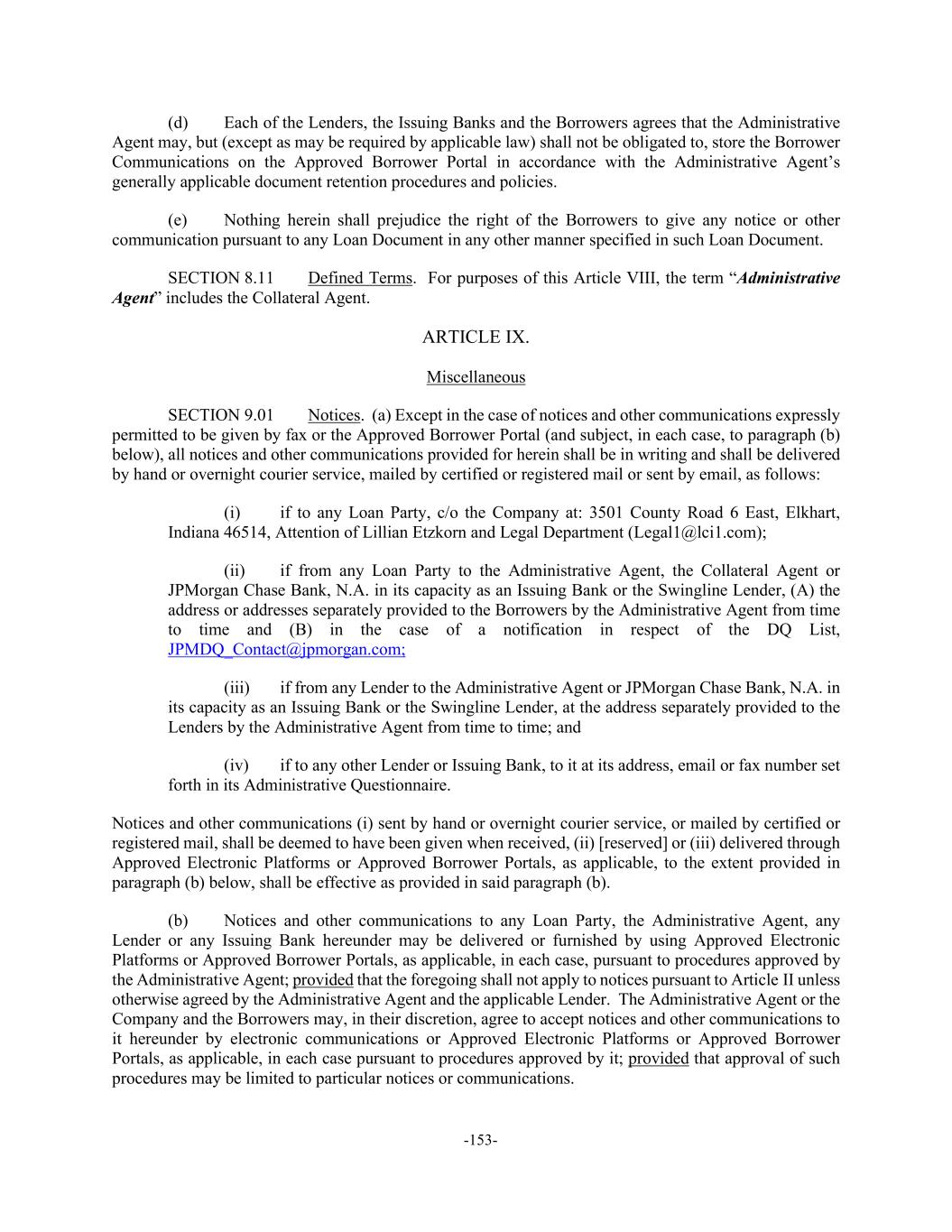 -153- (d) Each of the Lenders, the Issuing Banks and the Borrowers agrees that the Administrative Agent may, but (except as may be required by applicable law) shall not be obligated to, store the Borrower Communications on the Approved Borrower Portal in accordance with the Administrative Agent’s generally applicable document retention procedures and policies. (e) Nothing herein shall prejudice the right of the Borrowers to give any notice or other communication pursuant to any Loan Document in any other manner specified in such Loan Document. SECTION 8.11 Defined Terms. For purposes of this Article VIII, the term “Administrative Agent” includes the Collateral Agent. ARTICLE IX. Miscellaneous SECTION 9.01 Notices. (a) Except in the case of notices and other communications expressly permitted to be given by fax or the Approved Borrower Portal (and subject, in each case, to paragraph (b) below), all notices and other communications provided for herein shall be in writing and shall be delivered by hand or overnight courier service, mailed by certified or registered mail or sent by email, as follows: (i) if to any Loan Party, c/o the Company at: 3501 County Road 6 East, Elkhart, Indiana 46514, Attention of Lillian Etzkorn and Legal Department (Legal1@lci1.com); (ii) if from any Loan Party to the Administrative Agent, the Collateral Agent or JPMorgan Chase Bank, N.A. in its capacity as an Issuing Bank or the Swingline Lender, (A) the address or addresses separately provided to the Borrowers by the Administrative Agent from time to time and (B) in the case of a notification in respect of the DQ List, JPMDQ_Contact@jpmorgan.com; (iii) if from any Lender to the Administrative Agent or JPMorgan Chase Bank, N.A. in its capacity as an Issuing Bank or the Swingline Lender, at the address separately provided to the Lenders by the Administrative Agent from time to time; and (iv) if to any other Lender or Issuing Bank, to it at its address, email or fax number set forth in its Administrative Questionnaire. Notices and other communications (i) sent by hand or overnight courier service, or mailed by certified or registered mail, shall be deemed to have been given when received, (ii) [reserved] or (iii) delivered through Approved Electronic Platforms or Approved Borrower Portals, as applicable, to the extent provided in paragraph (b) below, shall be effective as provided in said paragraph (b). (b) Notices and other communications to any Loan Party, the Administrative Agent, any Lender or any Issuing Bank hereunder may be delivered or furnished by using Approved Electronic Platforms or Approved Borrower Portals, as applicable, in each case, pursuant to procedures approved by the Administrative Agent; provided that the foregoing shall not apply to notices pursuant to Article II unless otherwise agreed by the Administrative Agent and the applicable Lender. The Administrative Agent or the Company and the Borrowers may, in their discretion, agree to accept notices and other communications to it hereunder by electronic communications or Approved Electronic Platforms or Approved Borrower Portals, as applicable, in each case pursuant to procedures approved by it; provided that approval of such procedures may be limited to particular notices or communications.