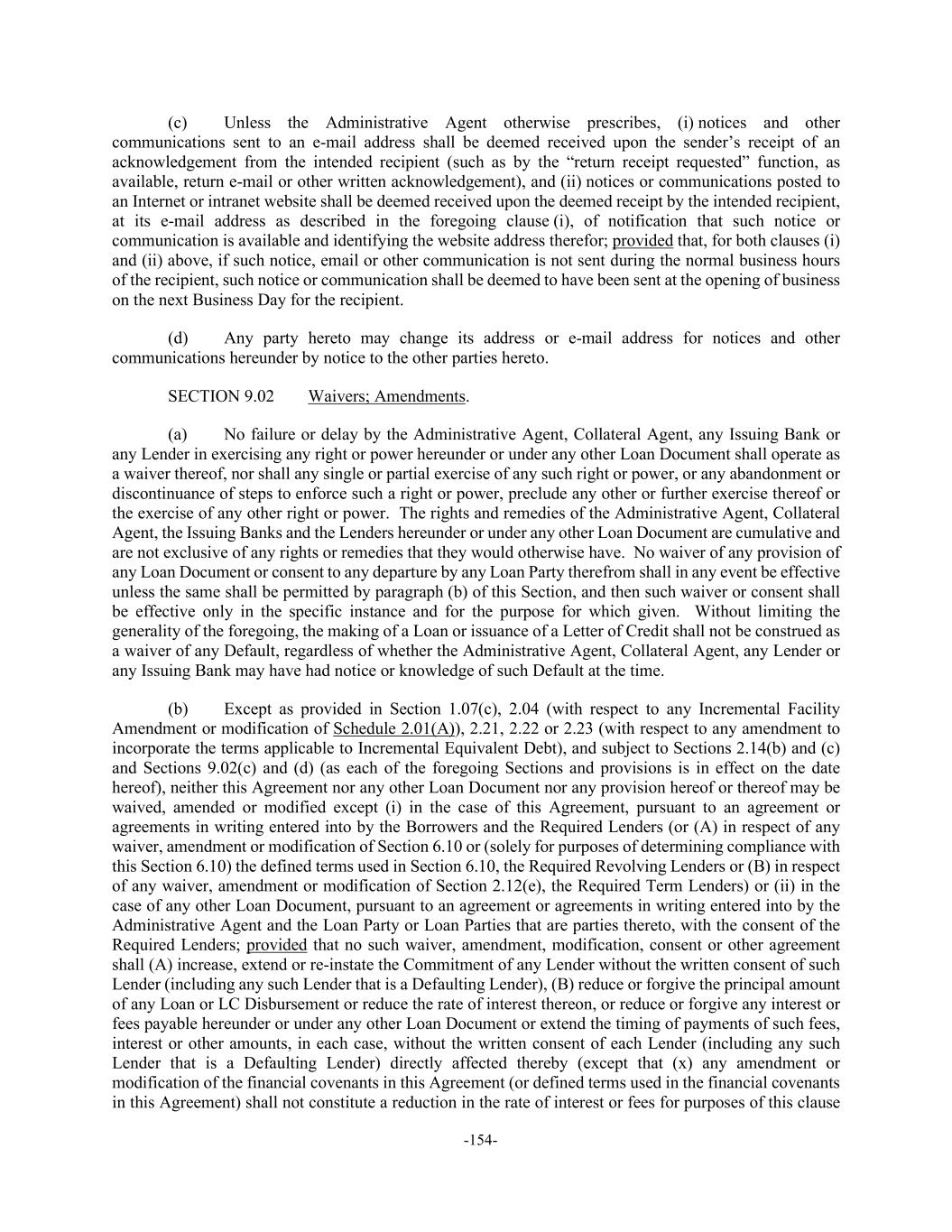 -154- (c) Unless the Administrative Agent otherwise prescribes, (i) notices and other communications sent to an e-mail address shall be deemed received upon the sender’s receipt of an acknowledgement from the intended recipient (such as by the “return receipt requested” function, as available, return e-mail or other written acknowledgement), and (ii) notices or communications posted to an Internet or intranet website shall be deemed received upon the deemed receipt by the intended recipient, at its e-mail address as described in the foregoing clause (i), of notification that such notice or communication is available and identifying the website address therefor; provided that, for both clauses (i) and (ii) above, if such notice, email or other communication is not sent during the normal business hours of the recipient, such notice or communication shall be deemed to have been sent at the opening of business on the next Business Day for the recipient. (d) Any party hereto may change its address or e-mail address for notices and other communications hereunder by notice to the other parties hereto. SECTION 9.02 Waivers; Amendments. (a) No failure or delay by the Administrative Agent, Collateral Agent, any Issuing Bank or any Lender in exercising any right or power hereunder or under any other Loan Document shall operate as a waiver thereof, nor shall any single or partial exercise of any such right or power, or any abandonment or discontinuance of steps to enforce such a right or power, preclude any other or further exercise thereof or the exercise of any other right or power. The rights and remedies of the Administrative Agent, Collateral Agent, the Issuing Banks and the Lenders hereunder or under any other Loan Document are cumulative and are not exclusive of any rights or remedies that they would otherwise have. No waiver of any provision of any Loan Document or consent to any departure by any Loan Party therefrom shall in any event be effective unless the same shall be permitted by paragraph (b) of this Section, and then such waiver or consent shall be effective only in the specific instance and for the purpose for which given. Without limiting the generality of the foregoing, the making of a Loan or issuance of a Letter of Credit shall not be construed as a waiver of any Default, regardless of whether the Administrative Agent, Collateral Agent, any Lender or any Issuing Bank may have had notice or knowledge of such Default at the time. (b) Except as provided in Section 1.07(c), 2.04 (with respect to any Incremental Facility Amendment or modification of Schedule 2.01(A)), 2.21, 2.22 or 2.23 (with respect to any amendment to incorporate the terms applicable to Incremental Equivalent Debt), and subject to Sections 2.14(b) and (c) and Sections 9.02(c) and (d) (as each of the foregoing Sections and provisions is in effect on the date hereof), neither this Agreement nor any other Loan Document nor any provision hereof or thereof may be waived, amended or modified except (i) in the case of this Agreement, pursuant to an agreement or agreements in writing entered into by the Borrowers and the Required Lenders (or (A) in respect of any waiver, amendment or modification of Section 6.10 or (solely for purposes of determining compliance with this Section 6.10) the defined terms used in Section 6.10, the Required Revolving Lenders or (B) in respect of any waiver, amendment or modification of Section 2.12(e), the Required Term Lenders) or (ii) in the case of any other Loan Document, pursuant to an agreement or agreements in writing entered into by the Administrative Agent and the Loan Party or Loan Parties that are parties thereto, with the consent of the Required Lenders; provided that no such waiver, amendment, modification, consent or other agreement shall (A) increase, extend or re-instate the Commitment of any Lender without the written consent of such Lender (including any such Lender that is a Defaulting Lender), (B) reduce or forgive the principal amount of any Loan or LC Disbursement or reduce the rate of interest thereon, or reduce or forgive any interest or fees payable hereunder or under any other Loan Document or extend the timing of payments of such fees, interest or other amounts, in each case, without the written consent of each Lender (including any such Lender that is a Defaulting Lender) directly affected thereby (except that (x) any amendment or modification of the financial covenants in this Agreement (or defined terms used in the financial covenants in this Agreement) shall not constitute a reduction in the rate of interest or fees for purposes of this clause