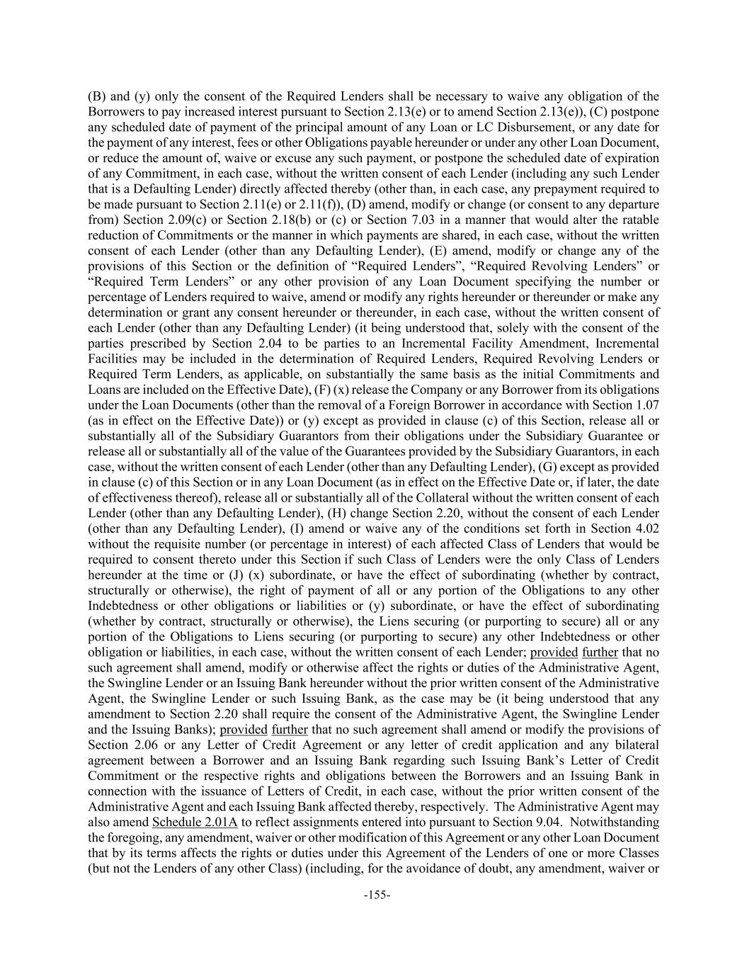 -155- (B) and (y) only the consent of the Required Lenders shall be necessary to waive any obligation of the Borrowers to pay increased interest pursuant to Section 2.13(e) or to amend Section 2.13(e)), (C) postpone any scheduled date of payment of the principal amount of any Loan or LC Disbursement, or any date for the payment of any interest, fees or other Obligations payable hereunder or under any other Loan Document, or reduce the amount of, waive or excuse any such payment, or postpone the scheduled date of expiration of any Commitment, in each case, without the written consent of each Lender (including any such Lender that is a Defaulting Lender) directly affected thereby (other than, in each case, any prepayment required to be made pursuant to Section 2.11(e) or 2.11(f)), (D) amend, modify or change (or consent to any departure from) Section 2.09(c) or Section 2.18(b) or (c) or Section 7.03 in a manner that would alter the ratable reduction of Commitments or the manner in which payments are shared, in each case, without the written consent of each Lender (other than any Defaulting Lender), (E) amend, modify or change any of the provisions of this Section or the definition of “Required Lenders”, “Required Revolving Lenders” or “Required Term Lenders” or any other provision of any Loan Document specifying the number or percentage of Lenders required to waive, amend or modify any rights hereunder or thereunder or make any determination or grant any consent hereunder or thereunder, in each case, without the written consent of each Lender (other than any Defaulting Lender) (it being understood that, solely with the consent of the parties prescribed by Section 2.04 to be parties to an Incremental Facility Amendment, Incremental Facilities may be included in the determination of Required Lenders, Required Revolving Lenders or Required Term Lenders, as applicable, on substantially the same basis as the initial Commitments and Loans are included on the Effective Date), (F) (x) release the Company or any Borrower from its obligations under the Loan Documents (other than the removal of a Foreign Borrower in accordance with Section 1.07 (as in effect on the Effective Date)) or (y) except as provided in clause (c) of this Section, release all or substantially all of the Subsidiary Guarantors from their obligations under the Subsidiary Guarantee or release all or substantially all of the value of the Guarantees provided by the Subsidiary Guarantors, in each case, without the written consent of each Lender (other than any Defaulting Lender), (G) except as provided in clause (c) of this Section or in any Loan Document (as in effect on the Effective Date or, if later, the date of effectiveness thereof), release all or substantially all of the Collateral without the written consent of each Lender (other than any Defaulting Lender), (H) change Section 2.20, without the consent of each Lender (other than any Defaulting Lender), (I) amend or waive any of the conditions set forth in Section 4.02 without the requisite number (or percentage in interest) of each affected Class of Lenders that would be required to consent thereto under this Section if such Class of Lenders were the only Class of Lenders hereunder at the time or (J) (x) subordinate, or have the effect of subordinating (whether by contract, structurally or otherwise), the right of payment of all or any portion of the Obligations to any other Indebtedness or other obligations or liabilities or (y) subordinate, or have the effect of subordinating (whether by contract, structurally or otherwise), the Liens securing (or purporting to secure) all or any portion of the Obligations to Liens securing (or purporting to secure) any other Indebtedness or other obligation or liabilities, in each case, without the written consent of each Lender; provided further that no such agreement shall amend, modify or otherwise affect the rights or duties of the Administrative Agent, the Swingline Lender or an Issuing Bank hereunder without the prior written consent of the Administrative Agent, the Swingline Lender or such Issuing Bank, as the case may be (it being understood that any amendment to Section 2.20 shall require the consent of the Administrative Agent, the Swingline Lender and the Issuing Banks); provided further that no such agreement shall amend or modify the provisions of Section 2.06 or any Letter of Credit Agreement or any letter of credit application and any bilateral agreement between a Borrower and an Issuing Bank regarding such Issuing Bank’s Letter of Credit Commitment or the respective rights and obligations between the Borrowers and an Issuing Bank in connection with the issuance of Letters of Credit, in each case, without the prior written consent of the Administrative Agent and each Issuing Bank affected thereby, respectively. The Administrative Agent may also amend Schedule 2.01A to reflect assignments entered into pursuant to Section 9.04. Notwithstanding the foregoing, any amendment, waiver or other modification of this Agreement or any other Loan Document that by its terms affects the rights or duties under this Agreement of the Lenders of one or more Classes (but not the Lenders of any other Class) (including, for the avoidance of doubt, any amendment, waiver or