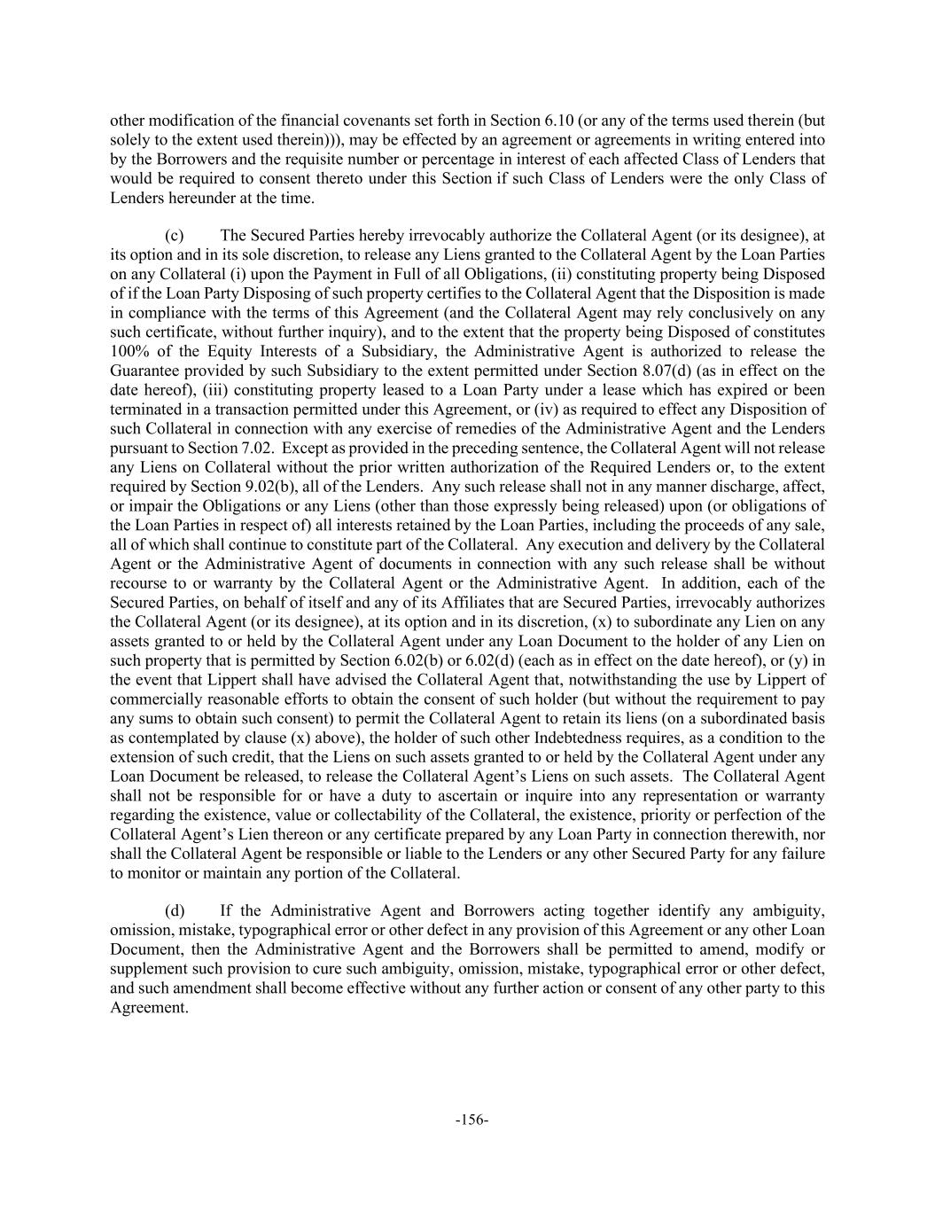-156- other modification of the financial covenants set forth in Section 6.10 (or any of the terms used therein (but solely to the extent used therein))), may be effected by an agreement or agreements in writing entered into by the Borrowers and the requisite number or percentage in interest of each affected Class of Lenders that would be required to consent thereto under this Section if such Class of Lenders were the only Class of Lenders hereunder at the time. (c) The Secured Parties hereby irrevocably authorize the Collateral Agent (or its designee), at its option and in its sole discretion, to release any Liens granted to the Collateral Agent by the Loan Parties on any Collateral (i) upon the Payment in Full of all Obligations, (ii) constituting property being Disposed of if the Loan Party Disposing of such property certifies to the Collateral Agent that the Disposition is made in compliance with the terms of this Agreement (and the Collateral Agent may rely conclusively on any such certificate, without further inquiry), and to the extent that the property being Disposed of constitutes 100% of the Equity Interests of a Subsidiary, the Administrative Agent is authorized to release the Guarantee provided by such Subsidiary to the extent permitted under Section 8.07(d) (as in effect on the date hereof), (iii) constituting property leased to a Loan Party under a lease which has expired or been terminated in a transaction permitted under this Agreement, or (iv) as required to effect any Disposition of such Collateral in connection with any exercise of remedies of the Administrative Agent and the Lenders pursuant to Section 7.02. Except as provided in the preceding sentence, the Collateral Agent will not release any Liens on Collateral without the prior written authorization of the Required Lenders or, to the extent required by Section 9.02(b), all of the Lenders. Any such release shall not in any manner discharge, affect, or impair the Obligations or any Liens (other than those expressly being released) upon (or obligations of the Loan Parties in respect of) all interests retained by the Loan Parties, including the proceeds of any sale, all of which shall continue to constitute part of the Collateral. Any execution and delivery by the Collateral Agent or the Administrative Agent of documents in connection with any such release shall be without recourse to or warranty by the Collateral Agent or the Administrative Agent. In addition, each of the Secured Parties, on behalf of itself and any of its Affiliates that are Secured Parties, irrevocably authorizes the Collateral Agent (or its designee), at its option and in its discretion, (x) to subordinate any Lien on any assets granted to or held by the Collateral Agent under any Loan Document to the holder of any Lien on such property that is permitted by Section 6.02(b) or 6.02(d) (each as in effect on the date hereof), or (y) in the event that Lippert shall have advised the Collateral Agent that, notwithstanding the use by Lippert of commercially reasonable efforts to obtain the consent of such holder (but without the requirement to pay any sums to obtain such consent) to permit the Collateral Agent to retain its liens (on a subordinated basis as contemplated by clause (x) above), the holder of such other Indebtedness requires, as a condition to the extension of such credit, that the Liens on such assets granted to or held by the Collateral Agent under any Loan Document be released, to release the Collateral Agent’s Liens on such assets. The Collateral Agent shall not be responsible for or have a duty to ascertain or inquire into any representation or warranty regarding the existence, value or collectability of the Collateral, the existence, priority or perfection of the Collateral Agent’s Lien thereon or any certificate prepared by any Loan Party in connection therewith, nor shall the Collateral Agent be responsible or liable to the Lenders or any other Secured Party for any failure to monitor or maintain any portion of the Collateral. (d) If the Administrative Agent and Borrowers acting together identify any ambiguity, omission, mistake, typographical error or other defect in any provision of this Agreement or any other Loan Document, then the Administrative Agent and the Borrowers shall be permitted to amend, modify or supplement such provision to cure such ambiguity, omission, mistake, typographical error or other defect, and such amendment shall become effective without any further action or consent of any other party to this Agreement.