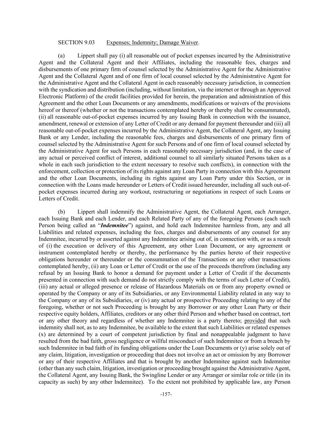 -157- SECTION 9.03 Expenses; Indemnity; Damage Waiver. (a) Lippert shall pay (i) all reasonable out of pocket expenses incurred by the Administrative Agent and the Collateral Agent and their Affiliates, including the reasonable fees, charges and disbursements of one primary firm of counsel selected by the Administrative Agent for the Administrative Agent and the Collateral Agent and of one firm of local counsel selected by the Administrative Agent for the Administrative Agent and the Collateral Agent in each reasonably necessary jurisdiction, in connection with the syndication and distribution (including, without limitation, via the internet or through an Approved Electronic Platform) of the credit facilities provided for herein, the preparation and administration of this Agreement and the other Loan Documents or any amendments, modifications or waivers of the provisions hereof or thereof (whether or not the transactions contemplated hereby or thereby shall be consummated), (ii) all reasonable out-of-pocket expenses incurred by any Issuing Bank in connection with the issuance, amendment, renewal or extension of any Letter of Credit or any demand for payment thereunder and (iii) all reasonable out-of-pocket expenses incurred by the Administrative Agent, the Collateral Agent, any Issuing Bank or any Lender, including the reasonable fees, charges and disbursements of one primary firm of counsel selected by the Administrative Agent for such Persons and of one firm of local counsel selected by the Administrative Agent for such Persons in each reasonably necessary jurisdiction (and, in the case of any actual or perceived conflict of interest, additional counsel to all similarly situated Persons taken as a whole in each such jurisdiction to the extent necessary to resolve such conflicts), in connection with the enforcement, collection or protection of its rights against any Loan Party in connection with this Agreement and the other Loan Documents, including its rights against any Loan Party under this Section, or in connection with the Loans made hereunder or Letters of Credit issued hereunder, including all such out-of- pocket expenses incurred during any workout, restructuring or negotiations in respect of such Loans or Letters of Credit. (b) Lippert shall indemnify the Administrative Agent, the Collateral Agent, each Arranger, each Issuing Bank and each Lender, and each Related Party of any of the foregoing Persons (each such Person being called an “Indemnitee”) against, and hold each Indemnitee harmless from, any and all Liabilities and related expenses, including the fees, charges and disbursements of any counsel for any Indemnitee, incurred by or asserted against any Indemnitee arising out of, in connection with, or as a result of (i) the execution or delivery of this Agreement, any other Loan Document, or any agreement or instrument contemplated hereby or thereby, the performance by the parties hereto of their respective obligations hereunder or thereunder or the consummation of the Transactions or any other transactions contemplated hereby, (ii) any Loan or Letter of Credit or the use of the proceeds therefrom (including any refusal by an Issuing Bank to honor a demand for payment under a Letter of Credit if the documents presented in connection with such demand do not strictly comply with the terms of such Letter of Credit), (iii) any actual or alleged presence or release of Hazardous Materials on or from any property owned or operated by the Company or any of its Subsidiaries, or any Environmental Liability related in any way to the Company or any of its Subsidiaries, or (iv) any actual or prospective Proceeding relating to any of the foregoing, whether or not such Proceeding is brought by any Borrower or any other Loan Party or their respective equity holders, Affiliates, creditors or any other third Person and whether based on contract, tort or any other theory and regardless of whether any Indemnitee is a party thereto; provided that such indemnity shall not, as to any Indemnitee, be available to the extent that such Liabilities or related expenses (x) are determined by a court of competent jurisdiction by final and nonappealable judgment to have resulted from the bad faith, gross negligence or willful misconduct of such Indemnitee or from a breach by such Indemnitee in bad faith of its funding obligations under the Loan Documents or (y) arise solely out of any claim, litigation, investigation or proceeding that does not involve an act or omission by any Borrower or any of their respective Affiliates and that is brought by another Indemnitee against such Indemnitee (other than any such claim, litigation, investigation or proceeding brought against the Administrative Agent, the Collateral Agent, any Issuing Bank, the Swingline Lender or any Arranger or similar role or title (in its capacity as such) by any other Indemnitee). To the extent not prohibited by applicable law, any Person