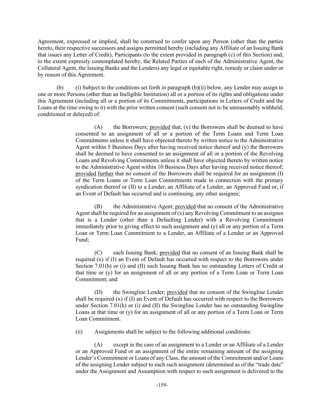 -159- Agreement, expressed or implied, shall be construed to confer upon any Person (other than the parties hereto, their respective successors and assigns permitted hereby (including any Affiliate of an Issuing Bank that issues any Letter of Credit), Participants (to the extent provided in paragraph (c) of this Section) and, to the extent expressly contemplated hereby, the Related Parties of each of the Administrative Agent, the Collateral Agent, the Issuing Banks and the Lenders) any legal or equitable right, remedy or claim under or by reason of this Agreement. (b) (i) Subject to the conditions set forth in paragraph (b)(ii) below, any Lender may assign to one or more Persons (other than an Ineligible Institution) all or a portion of its rights and obligations under this Agreement (including all or a portion of its Commitments, participations in Letters of Credit and the Loans at the time owing to it) with the prior written consent (such consent not to be unreasonably withheld, conditioned or delayed) of: (A) the Borrowers; provided that, (x) the Borrowers shall be deemed to have consented to an assignment of all or a portion of the Term Loans and Term Loan Commitments unless it shall have objected thereto by written notice to the Administrative Agent within 5 Business Days after having received notice thereof and (y) the Borrowers shall be deemed to have consented to an assignment of all or a portion of the Revolving Loans and Revolving Commitments unless it shall have objected thereto by written notice to the Administrative Agent within 10 Business Days after having received notice thereof; provided further that no consent of the Borrowers shall be required for an assignment (I) of the Term Loans or Term Loan Commitments made in connection with the primary syndication thereof or (II) to a Lender, an Affiliate of a Lender, an Approved Fund or, if an Event of Default has occurred and is continuing, any other assignee; (B) the Administrative Agent; provided that no consent of the Administrative Agent shall be required for an assignment of (x) any Revolving Commitment to an assignee that is a Lender (other than a Defaulting Lender) with a Revolving Commitment immediately prior to giving effect to such assignment and (y) all or any portion of a Term Loan or Term Loan Commitment to a Lender, an Affiliate of a Lender or an Approved Fund; (C) each Issuing Bank; provided that no consent of an Issuing Bank shall be required (x) if (I) an Event of Default has occurred with respect to the Borrowers under Section 7.01(h) or (i) and (II) such Issuing Bank has no outstanding Letters of Credit at that time or (y) for an assignment of all or any portion of a Term Loan or Term Loan Commitment; and (D) the Swingline Lender; provided that no consent of the Swingline Lender shall be required (x) if (I) an Event of Default has occurred with respect to the Borrowers under Section 7.01(h) or (i) and (II) the Swingline Lender has no outstanding Swingline Loans at that time or (y) for an assignment of all or any portion of a Term Loan or Term Loan Commitment. (ii) Assignments shall be subject to the following additional conditions: (A) except in the case of an assignment to a Lender or an Affiliate of a Lender or an Approved Fund or an assignment of the entire remaining amount of the assigning Lender’s Commitment or Loans of any Class, the amount of the Commitment and/or Loans of the assigning Lender subject to each such assignment (determined as of the “trade date” under the Assignment and Assumption with respect to such assignment is delivered to the