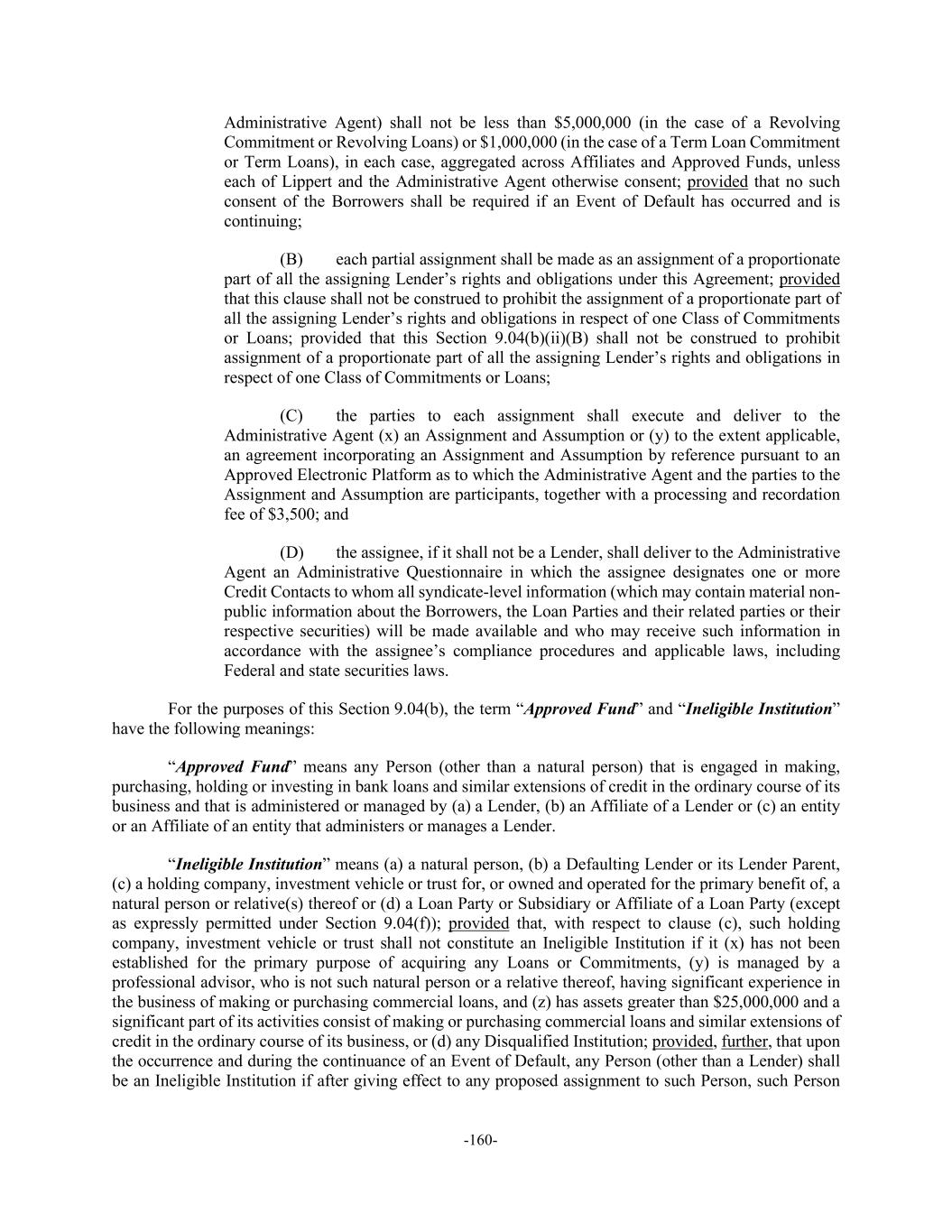 -160- Administrative Agent) shall not be less than $5,000,000 (in the case of a Revolving Commitment or Revolving Loans) or $1,000,000 (in the case of a Term Loan Commitment or Term Loans), in each case, aggregated across Affiliates and Approved Funds, unless each of Lippert and the Administrative Agent otherwise consent; provided that no such consent of the Borrowers shall be required if an Event of Default has occurred and is continuing; (B) each partial assignment shall be made as an assignment of a proportionate part of all the assigning Lender’s rights and obligations under this Agreement; provided that this clause shall not be construed to prohibit the assignment of a proportionate part of all the assigning Lender’s rights and obligations in respect of one Class of Commitments or Loans; provided that this Section 9.04(b)(ii)(B) shall not be construed to prohibit assignment of a proportionate part of all the assigning Lender’s rights and obligations in respect of one Class of Commitments or Loans; (C) the parties to each assignment shall execute and deliver to the Administrative Agent (x) an Assignment and Assumption or (y) to the extent applicable, an agreement incorporating an Assignment and Assumption by reference pursuant to an Approved Electronic Platform as to which the Administrative Agent and the parties to the Assignment and Assumption are participants, together with a processing and recordation fee of $3,500; and (D) the assignee, if it shall not be a Lender, shall deliver to the Administrative Agent an Administrative Questionnaire in which the assignee designates one or more Credit Contacts to whom all syndicate-level information (which may contain material non- public information about the Borrowers, the Loan Parties and their related parties or their respective securities) will be made available and who may receive such information in accordance with the assignee’s compliance procedures and applicable laws, including Federal and state securities laws. For the purposes of this Section 9.04(b), the term “Approved Fund” and “Ineligible Institution” have the following meanings: “Approved Fund” means any Person (other than a natural person) that is engaged in making, purchasing, holding or investing in bank loans and similar extensions of credit in the ordinary course of its business and that is administered or managed by (a) a Lender, (b) an Affiliate of a Lender or (c) an entity or an Affiliate of an entity that administers or manages a Lender. “Ineligible Institution” means (a) a natural person, (b) a Defaulting Lender or its Lender Parent, (c) a holding company, investment vehicle or trust for, or owned and operated for the primary benefit of, a natural person or relative(s) thereof or (d) a Loan Party or Subsidiary or Affiliate of a Loan Party (except as expressly permitted under Section 9.04(f)); provided that, with respect to clause (c), such holding company, investment vehicle or trust shall not constitute an Ineligible Institution if it (x) has not been established for the primary purpose of acquiring any Loans or Commitments, (y) is managed by a professional advisor, who is not such natural person or a relative thereof, having significant experience in the business of making or purchasing commercial loans, and (z) has assets greater than $25,000,000 and a significant part of its activities consist of making or purchasing commercial loans and similar extensions of credit in the ordinary course of its business, or (d) any Disqualified Institution; provided, further, that upon the occurrence and during the continuance of an Event of Default, any Person (other than a Lender) shall be an Ineligible Institution if after giving effect to any proposed assignment to such Person, such Person
