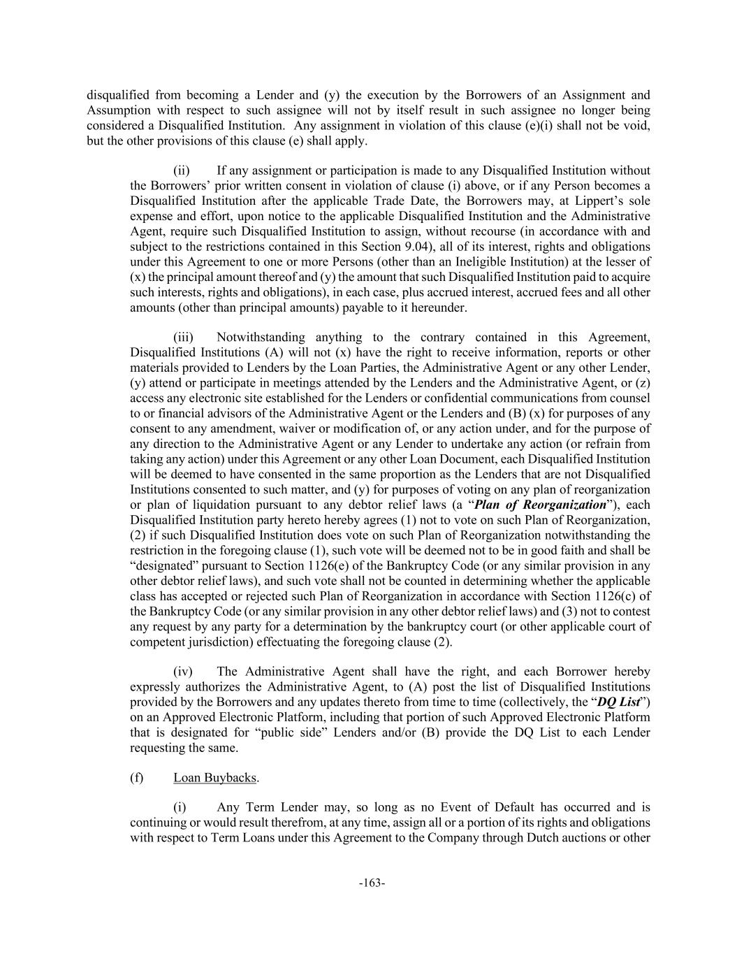 -163- disqualified from becoming a Lender and (y) the execution by the Borrowers of an Assignment and Assumption with respect to such assignee will not by itself result in such assignee no longer being considered a Disqualified Institution. Any assignment in violation of this clause (e)(i) shall not be void, but the other provisions of this clause (e) shall apply. (ii) If any assignment or participation is made to any Disqualified Institution without the Borrowers’ prior written consent in violation of clause (i) above, or if any Person becomes a Disqualified Institution after the applicable Trade Date, the Borrowers may, at Lippert’s sole expense and effort, upon notice to the applicable Disqualified Institution and the Administrative Agent, require such Disqualified Institution to assign, without recourse (in accordance with and subject to the restrictions contained in this Section 9.04), all of its interest, rights and obligations under this Agreement to one or more Persons (other than an Ineligible Institution) at the lesser of (x) the principal amount thereof and (y) the amount that such Disqualified Institution paid to acquire such interests, rights and obligations), in each case, plus accrued interest, accrued fees and all other amounts (other than principal amounts) payable to it hereunder. (iii) Notwithstanding anything to the contrary contained in this Agreement, Disqualified Institutions (A) will not (x) have the right to receive information, reports or other materials provided to Lenders by the Loan Parties, the Administrative Agent or any other Lender, (y) attend or participate in meetings attended by the Lenders and the Administrative Agent, or (z) access any electronic site established for the Lenders or confidential communications from counsel to or financial advisors of the Administrative Agent or the Lenders and (B) (x) for purposes of any consent to any amendment, waiver or modification of, or any action under, and for the purpose of any direction to the Administrative Agent or any Lender to undertake any action (or refrain from taking any action) under this Agreement or any other Loan Document, each Disqualified Institution will be deemed to have consented in the same proportion as the Lenders that are not Disqualified Institutions consented to such matter, and (y) for purposes of voting on any plan of reorganization or plan of liquidation pursuant to any debtor relief laws (a “Plan of Reorganization”), each Disqualified Institution party hereto hereby agrees (1) not to vote on such Plan of Reorganization, (2) if such Disqualified Institution does vote on such Plan of Reorganization notwithstanding the restriction in the foregoing clause (1), such vote will be deemed not to be in good faith and shall be “designated” pursuant to Section 1126(e) of the Bankruptcy Code (or any similar provision in any other debtor relief laws), and such vote shall not be counted in determining whether the applicable class has accepted or rejected such Plan of Reorganization in accordance with Section 1126(c) of the Bankruptcy Code (or any similar provision in any other debtor relief laws) and (3) not to contest any request by any party for a determination by the bankruptcy court (or other applicable court of competent jurisdiction) effectuating the foregoing clause (2). (iv) The Administrative Agent shall have the right, and each Borrower hereby expressly authorizes the Administrative Agent, to (A) post the list of Disqualified Institutions provided by the Borrowers and any updates thereto from time to time (collectively, the “DQ List”) on an Approved Electronic Platform, including that portion of such Approved Electronic Platform that is designated for “public side” Lenders and/or (B) provide the DQ List to each Lender requesting the same. (f) Loan Buybacks. (i) Any Term Lender may, so long as no Event of Default has occurred and is continuing or would result therefrom, at any time, assign all or a portion of its rights and obligations with respect to Term Loans under this Agreement to the Company through Dutch auctions or other