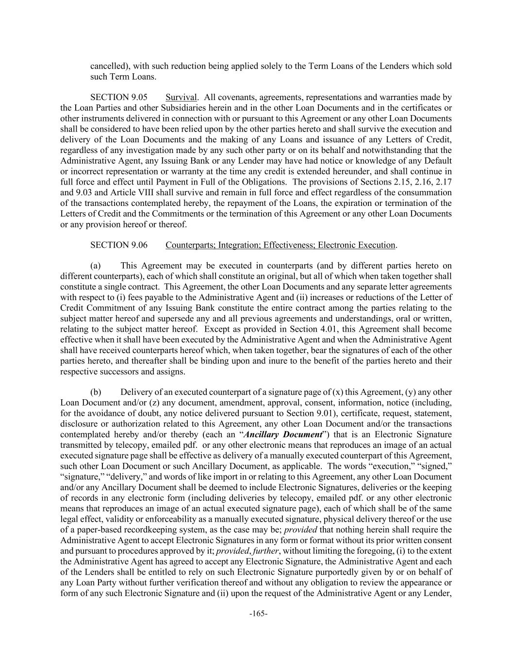 -165- cancelled), with such reduction being applied solely to the Term Loans of the Lenders which sold such Term Loans. SECTION 9.05 Survival. All covenants, agreements, representations and warranties made by the Loan Parties and other Subsidiaries herein and in the other Loan Documents and in the certificates or other instruments delivered in connection with or pursuant to this Agreement or any other Loan Documents shall be considered to have been relied upon by the other parties hereto and shall survive the execution and delivery of the Loan Documents and the making of any Loans and issuance of any Letters of Credit, regardless of any investigation made by any such other party or on its behalf and notwithstanding that the Administrative Agent, any Issuing Bank or any Lender may have had notice or knowledge of any Default or incorrect representation or warranty at the time any credit is extended hereunder, and shall continue in full force and effect until Payment in Full of the Obligations. The provisions of Sections 2.15, 2.16, 2.17 and 9.03 and Article VIII shall survive and remain in full force and effect regardless of the consummation of the transactions contemplated hereby, the repayment of the Loans, the expiration or termination of the Letters of Credit and the Commitments or the termination of this Agreement or any other Loan Documents or any provision hereof or thereof. SECTION 9.06 Counterparts; Integration; Effectiveness; Electronic Execution. (a) This Agreement may be executed in counterparts (and by different parties hereto on different counterparts), each of which shall constitute an original, but all of which when taken together shall constitute a single contract. This Agreement, the other Loan Documents and any separate letter agreements with respect to (i) fees payable to the Administrative Agent and (ii) increases or reductions of the Letter of Credit Commitment of any Issuing Bank constitute the entire contract among the parties relating to the subject matter hereof and supersede any and all previous agreements and understandings, oral or written, relating to the subject matter hereof. Except as provided in Section 4.01, this Agreement shall become effective when it shall have been executed by the Administrative Agent and when the Administrative Agent shall have received counterparts hereof which, when taken together, bear the signatures of each of the other parties hereto, and thereafter shall be binding upon and inure to the benefit of the parties hereto and their respective successors and assigns. (b) Delivery of an executed counterpart of a signature page of (x) this Agreement, (y) any other Loan Document and/or (z) any document, amendment, approval, consent, information, notice (including, for the avoidance of doubt, any notice delivered pursuant to Section 9.01), certificate, request, statement, disclosure or authorization related to this Agreement, any other Loan Document and/or the transactions contemplated hereby and/or thereby (each an “Ancillary Document”) that is an Electronic Signature transmitted by telecopy, emailed pdf. or any other electronic means that reproduces an image of an actual executed signature page shall be effective as delivery of a manually executed counterpart of this Agreement, such other Loan Document or such Ancillary Document, as applicable. The words “execution,” “signed,” “signature,” “delivery,” and words of like import in or relating to this Agreement, any other Loan Document and/or any Ancillary Document shall be deemed to include Electronic Signatures, deliveries or the keeping of records in any electronic form (including deliveries by telecopy, emailed pdf. or any other electronic means that reproduces an image of an actual executed signature page), each of which shall be of the same legal effect, validity or enforceability as a manually executed signature, physical delivery thereof or the use of a paper-based recordkeeping system, as the case may be; provided that nothing herein shall require the Administrative Agent to accept Electronic Signatures in any form or format without its prior written consent and pursuant to procedures approved by it; provided, further, without limiting the foregoing, (i) to the extent the Administrative Agent has agreed to accept any Electronic Signature, the Administrative Agent and each of the Lenders shall be entitled to rely on such Electronic Signature purportedly given by or on behalf of any Loan Party without further verification thereof and without any obligation to review the appearance or form of any such Electronic Signature and (ii) upon the request of the Administrative Agent or any Lender,