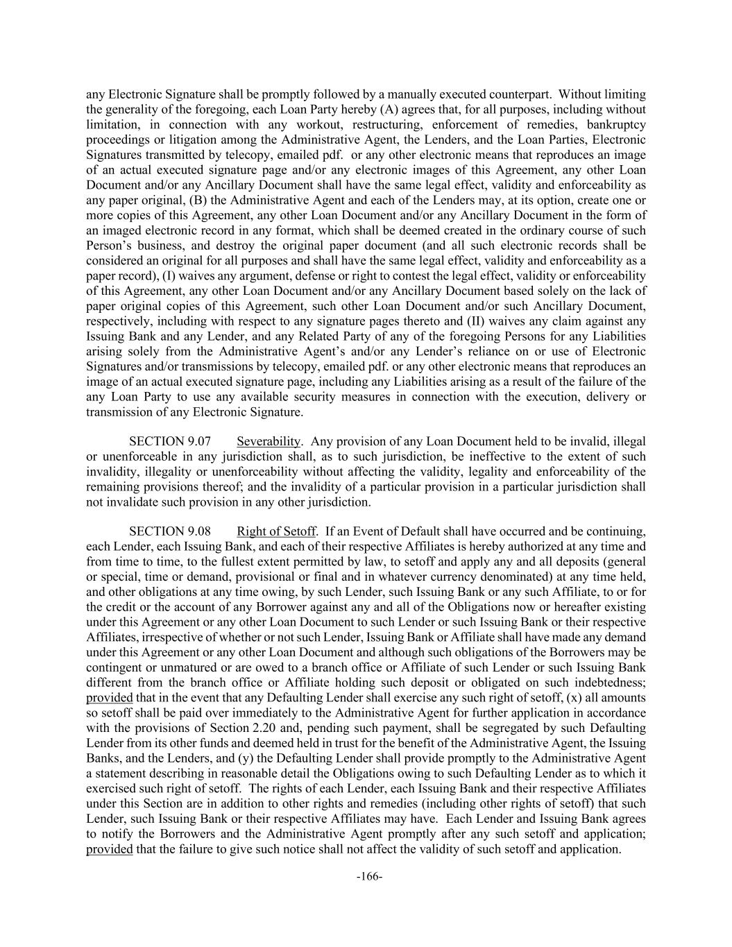 -166- any Electronic Signature shall be promptly followed by a manually executed counterpart. Without limiting the generality of the foregoing, each Loan Party hereby (A) agrees that, for all purposes, including without limitation, in connection with any workout, restructuring, enforcement of remedies, bankruptcy proceedings or litigation among the Administrative Agent, the Lenders, and the Loan Parties, Electronic Signatures transmitted by telecopy, emailed pdf. or any other electronic means that reproduces an image of an actual executed signature page and/or any electronic images of this Agreement, any other Loan Document and/or any Ancillary Document shall have the same legal effect, validity and enforceability as any paper original, (B) the Administrative Agent and each of the Lenders may, at its option, create one or more copies of this Agreement, any other Loan Document and/or any Ancillary Document in the form of an imaged electronic record in any format, which shall be deemed created in the ordinary course of such Person’s business, and destroy the original paper document (and all such electronic records shall be considered an original for all purposes and shall have the same legal effect, validity and enforceability as a paper record), (I) waives any argument, defense or right to contest the legal effect, validity or enforceability of this Agreement, any other Loan Document and/or any Ancillary Document based solely on the lack of paper original copies of this Agreement, such other Loan Document and/or such Ancillary Document, respectively, including with respect to any signature pages thereto and (II) waives any claim against any Issuing Bank and any Lender, and any Related Party of any of the foregoing Persons for any Liabilities arising solely from the Administrative Agent’s and/or any Lender’s reliance on or use of Electronic Signatures and/or transmissions by telecopy, emailed pdf. or any other electronic means that reproduces an image of an actual executed signature page, including any Liabilities arising as a result of the failure of the any Loan Party to use any available security measures in connection with the execution, delivery or transmission of any Electronic Signature. SECTION 9.07 Severability. Any provision of any Loan Document held to be invalid, illegal or unenforceable in any jurisdiction shall, as to such jurisdiction, be ineffective to the extent of such invalidity, illegality or unenforceability without affecting the validity, legality and enforceability of the remaining provisions thereof; and the invalidity of a particular provision in a particular jurisdiction shall not invalidate such provision in any other jurisdiction. SECTION 9.08 Right of Setoff. If an Event of Default shall have occurred and be continuing, each Lender, each Issuing Bank, and each of their respective Affiliates is hereby authorized at any time and from time to time, to the fullest extent permitted by law, to setoff and apply any and all deposits (general or special, time or demand, provisional or final and in whatever currency denominated) at any time held, and other obligations at any time owing, by such Lender, such Issuing Bank or any such Affiliate, to or for the credit or the account of any Borrower against any and all of the Obligations now or hereafter existing under this Agreement or any other Loan Document to such Lender or such Issuing Bank or their respective Affiliates, irrespective of whether or not such Lender, Issuing Bank or Affiliate shall have made any demand under this Agreement or any other Loan Document and although such obligations of the Borrowers may be contingent or unmatured or are owed to a branch office or Affiliate of such Lender or such Issuing Bank different from the branch office or Affiliate holding such deposit or obligated on such indebtedness; provided that in the event that any Defaulting Lender shall exercise any such right of setoff, (x) all amounts so setoff shall be paid over immediately to the Administrative Agent for further application in accordance with the provisions of Section 2.20 and, pending such payment, shall be segregated by such Defaulting Lender from its other funds and deemed held in trust for the benefit of the Administrative Agent, the Issuing Banks, and the Lenders, and (y) the Defaulting Lender shall provide promptly to the Administrative Agent a statement describing in reasonable detail the Obligations owing to such Defaulting Lender as to which it exercised such right of setoff. The rights of each Lender, each Issuing Bank and their respective Affiliates under this Section are in addition to other rights and remedies (including other rights of setoff) that such Lender, such Issuing Bank or their respective Affiliates may have. Each Lender and Issuing Bank agrees to notify the Borrowers and the Administrative Agent promptly after any such setoff and application; provided that the failure to give such notice shall not affect the validity of such setoff and application.