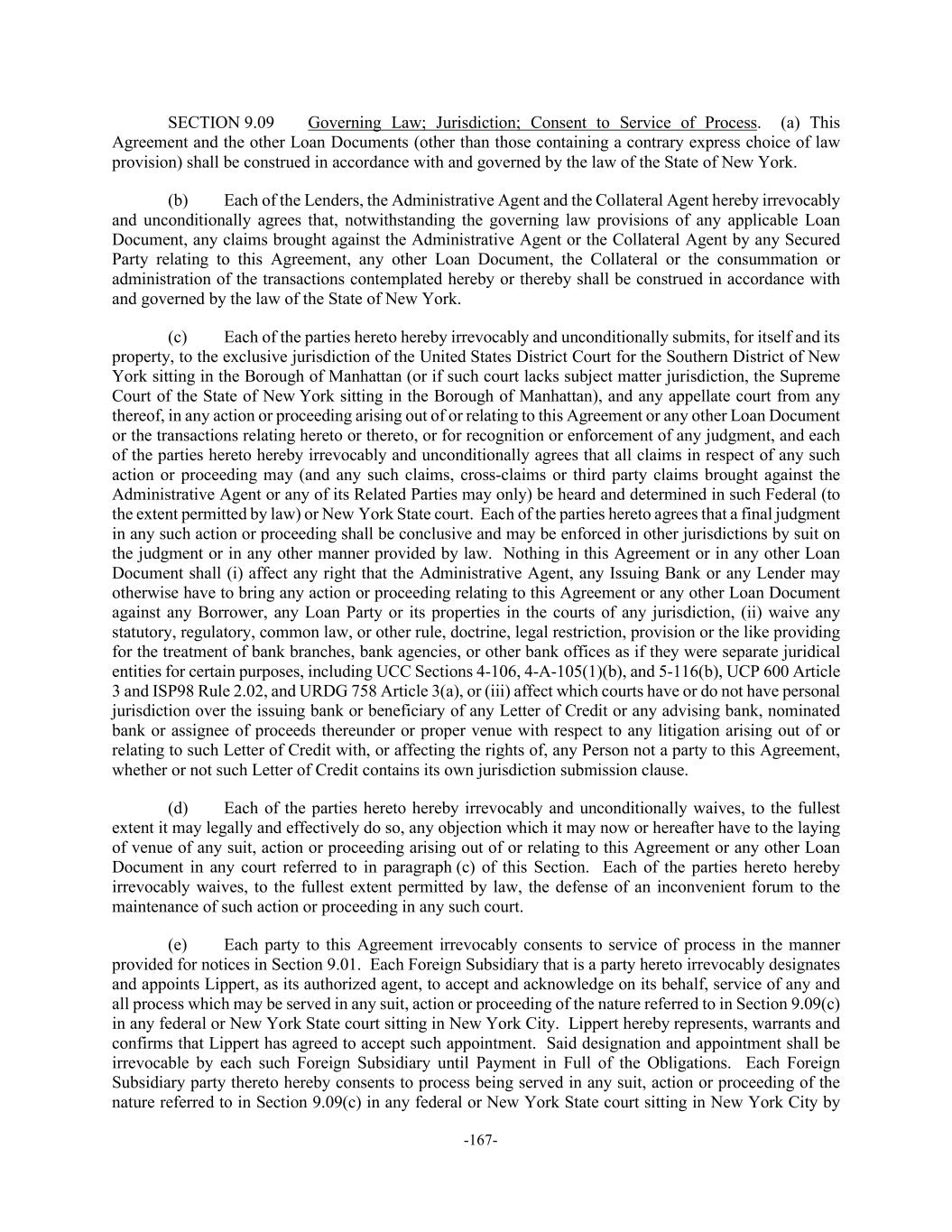 -167- SECTION 9.09 Governing Law; Jurisdiction; Consent to Service of Process. (a) This Agreement and the other Loan Documents (other than those containing a contrary express choice of law provision) shall be construed in accordance with and governed by the law of the State of New York. (b) Each of the Lenders, the Administrative Agent and the Collateral Agent hereby irrevocably and unconditionally agrees that, notwithstanding the governing law provisions of any applicable Loan Document, any claims brought against the Administrative Agent or the Collateral Agent by any Secured Party relating to this Agreement, any other Loan Document, the Collateral or the consummation or administration of the transactions contemplated hereby or thereby shall be construed in accordance with and governed by the law of the State of New York. (c) Each of the parties hereto hereby irrevocably and unconditionally submits, for itself and its property, to the exclusive jurisdiction of the United States District Court for the Southern District of New York sitting in the Borough of Manhattan (or if such court lacks subject matter jurisdiction, the Supreme Court of the State of New York sitting in the Borough of Manhattan), and any appellate court from any thereof, in any action or proceeding arising out of or relating to this Agreement or any other Loan Document or the transactions relating hereto or thereto, or for recognition or enforcement of any judgment, and each of the parties hereto hereby irrevocably and unconditionally agrees that all claims in respect of any such action or proceeding may (and any such claims, cross-claims or third party claims brought against the Administrative Agent or any of its Related Parties may only) be heard and determined in such Federal (to the extent permitted by law) or New York State court. Each of the parties hereto agrees that a final judgment in any such action or proceeding shall be conclusive and may be enforced in other jurisdictions by suit on the judgment or in any other manner provided by law. Nothing in this Agreement or in any other Loan Document shall (i) affect any right that the Administrative Agent, any Issuing Bank or any Lender may otherwise have to bring any action or proceeding relating to this Agreement or any other Loan Document against any Borrower, any Loan Party or its properties in the courts of any jurisdiction, (ii) waive any statutory, regulatory, common law, or other rule, doctrine, legal restriction, provision or the like providing for the treatment of bank branches, bank agencies, or other bank offices as if they were separate juridical entities for certain purposes, including UCC Sections 4-106, 4-A-105(1)(b), and 5-116(b), UCP 600 Article 3 and ISP98 Rule 2.02, and URDG 758 Article 3(a), or (iii) affect which courts have or do not have personal jurisdiction over the issuing bank or beneficiary of any Letter of Credit or any advising bank, nominated bank or assignee of proceeds thereunder or proper venue with respect to any litigation arising out of or relating to such Letter of Credit with, or affecting the rights of, any Person not a party to this Agreement, whether or not such Letter of Credit contains its own jurisdiction submission clause. (d) Each of the parties hereto hereby irrevocably and unconditionally waives, to the fullest extent it may legally and effectively do so, any objection which it may now or hereafter have to the laying of venue of any suit, action or proceeding arising out of or relating to this Agreement or any other Loan Document in any court referred to in paragraph (c) of this Section. Each of the parties hereto hereby irrevocably waives, to the fullest extent permitted by law, the defense of an inconvenient forum to the maintenance of such action or proceeding in any such court. (e) Each party to this Agreement irrevocably consents to service of process in the manner provided for notices in Section 9.01. Each Foreign Subsidiary that is a party hereto irrevocably designates and appoints Lippert, as its authorized agent, to accept and acknowledge on its behalf, service of any and all process which may be served in any suit, action or proceeding of the nature referred to in Section 9.09(c) in any federal or New York State court sitting in New York City. Lippert hereby represents, warrants and confirms that Lippert has agreed to accept such appointment. Said designation and appointment shall be irrevocable by each such Foreign Subsidiary until Payment in Full of the Obligations. Each Foreign Subsidiary party thereto hereby consents to process being served in any suit, action or proceeding of the nature referred to in Section 9.09(c) in any federal or New York State court sitting in New York City by