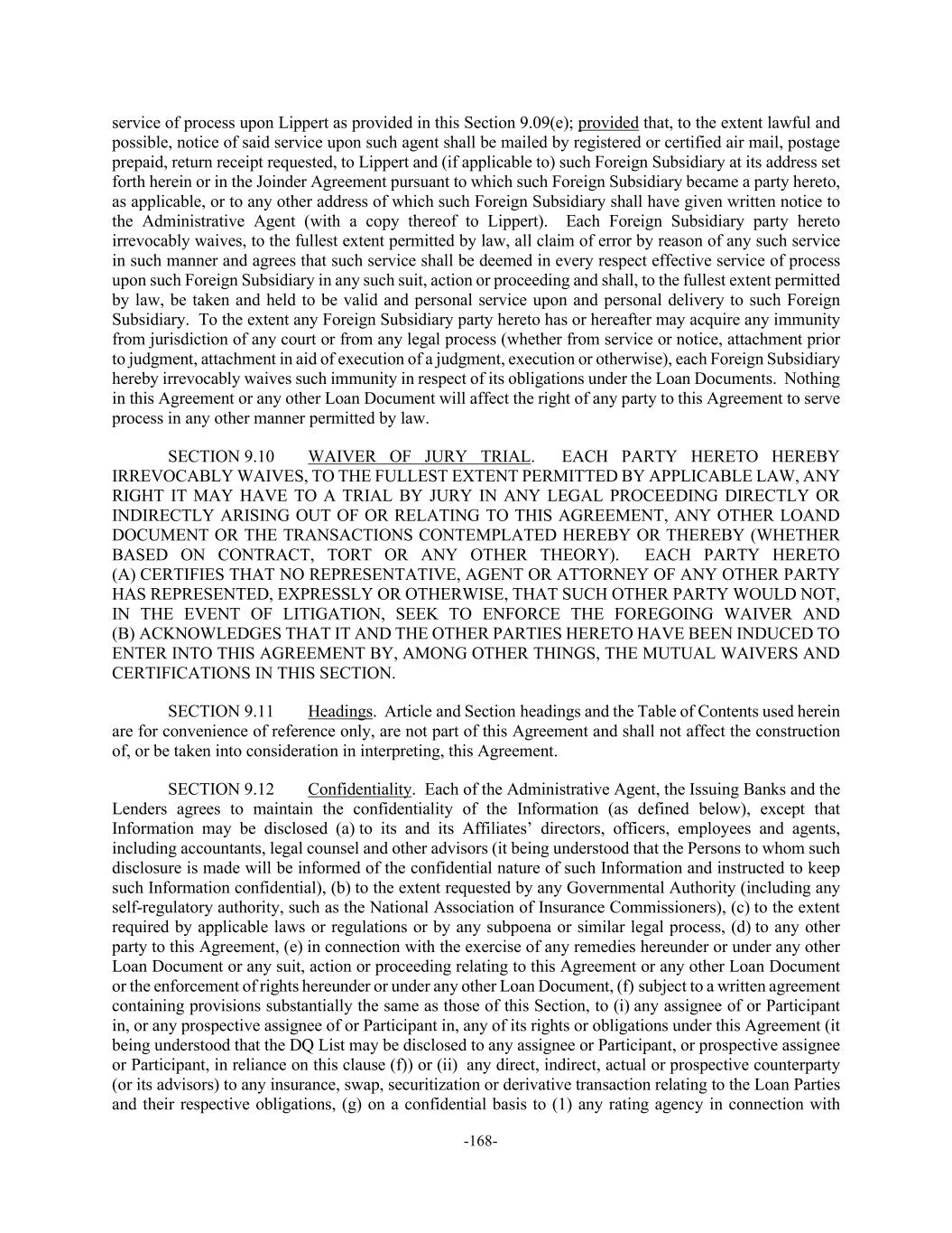 -168- service of process upon Lippert as provided in this Section 9.09(e); provided that, to the extent lawful and possible, notice of said service upon such agent shall be mailed by registered or certified air mail, postage prepaid, return receipt requested, to Lippert and (if applicable to) such Foreign Subsidiary at its address set forth herein or in the Joinder Agreement pursuant to which such Foreign Subsidiary became a party hereto, as applicable, or to any other address of which such Foreign Subsidiary shall have given written notice to the Administrative Agent (with a copy thereof to Lippert). Each Foreign Subsidiary party hereto irrevocably waives, to the fullest extent permitted by law, all claim of error by reason of any such service in such manner and agrees that such service shall be deemed in every respect effective service of process upon such Foreign Subsidiary in any such suit, action or proceeding and shall, to the fullest extent permitted by law, be taken and held to be valid and personal service upon and personal delivery to such Foreign Subsidiary. To the extent any Foreign Subsidiary party hereto has or hereafter may acquire any immunity from jurisdiction of any court or from any legal process (whether from service or notice, attachment prior to judgment, attachment in aid of execution of a judgment, execution or otherwise), each Foreign Subsidiary hereby irrevocably waives such immunity in respect of its obligations under the Loan Documents. Nothing in this Agreement or any other Loan Document will affect the right of any party to this Agreement to serve process in any other manner permitted by law. SECTION 9.10 WAIVER OF JURY TRIAL. EACH PARTY HERETO HEREBY IRREVOCABLY WAIVES, TO THE FULLEST EXTENT PERMITTED BY APPLICABLE LAW, ANY RIGHT IT MAY HAVE TO A TRIAL BY JURY IN ANY LEGAL PROCEEDING DIRECTLY OR INDIRECTLY ARISING OUT OF OR RELATING TO THIS AGREEMENT, ANY OTHER LOAND DOCUMENT OR THE TRANSACTIONS CONTEMPLATED HEREBY OR THEREBY (WHETHER BASED ON CONTRACT, TORT OR ANY OTHER THEORY). EACH PARTY HERETO (A) CERTIFIES THAT NO REPRESENTATIVE, AGENT OR ATTORNEY OF ANY OTHER PARTY HAS REPRESENTED, EXPRESSLY OR OTHERWISE, THAT SUCH OTHER PARTY WOULD NOT, IN THE EVENT OF LITIGATION, SEEK TO ENFORCE THE FOREGOING WAIVER AND (B) ACKNOWLEDGES THAT IT AND THE OTHER PARTIES HERETO HAVE BEEN INDUCED TO ENTER INTO THIS AGREEMENT BY, AMONG OTHER THINGS, THE MUTUAL WAIVERS AND CERTIFICATIONS IN THIS SECTION. SECTION 9.11 Headings. Article and Section headings and the Table of Contents used herein are for convenience of reference only, are not part of this Agreement and shall not affect the construction of, or be taken into consideration in interpreting, this Agreement. SECTION 9.12 Confidentiality. Each of the Administrative Agent, the Issuing Banks and the Lenders agrees to maintain the confidentiality of the Information (as defined below), except that Information may be disclosed (a) to its and its Affiliates’ directors, officers, employees and agents, including accountants, legal counsel and other advisors (it being understood that the Persons to whom such disclosure is made will be informed of the confidential nature of such Information and instructed to keep such Information confidential), (b) to the extent requested by any Governmental Authority (including any self-regulatory authority, such as the National Association of Insurance Commissioners), (c) to the extent required by applicable laws or regulations or by any subpoena or similar legal process, (d) to any other party to this Agreement, (e) in connection with the exercise of any remedies hereunder or under any other Loan Document or any suit, action or proceeding relating to this Agreement or any other Loan Document or the enforcement of rights hereunder or under any other Loan Document, (f) subject to a written agreement containing provisions substantially the same as those of this Section, to (i) any assignee of or Participant in, or any prospective assignee of or Participant in, any of its rights or obligations under this Agreement (it being understood that the DQ List may be disclosed to any assignee or Participant, or prospective assignee or Participant, in reliance on this clause (f)) or (ii) any direct, indirect, actual or prospective counterparty (or its advisors) to any insurance, swap, securitization or derivative transaction relating to the Loan Parties and their respective obligations, (g) on a confidential basis to (1) any rating agency in connection with