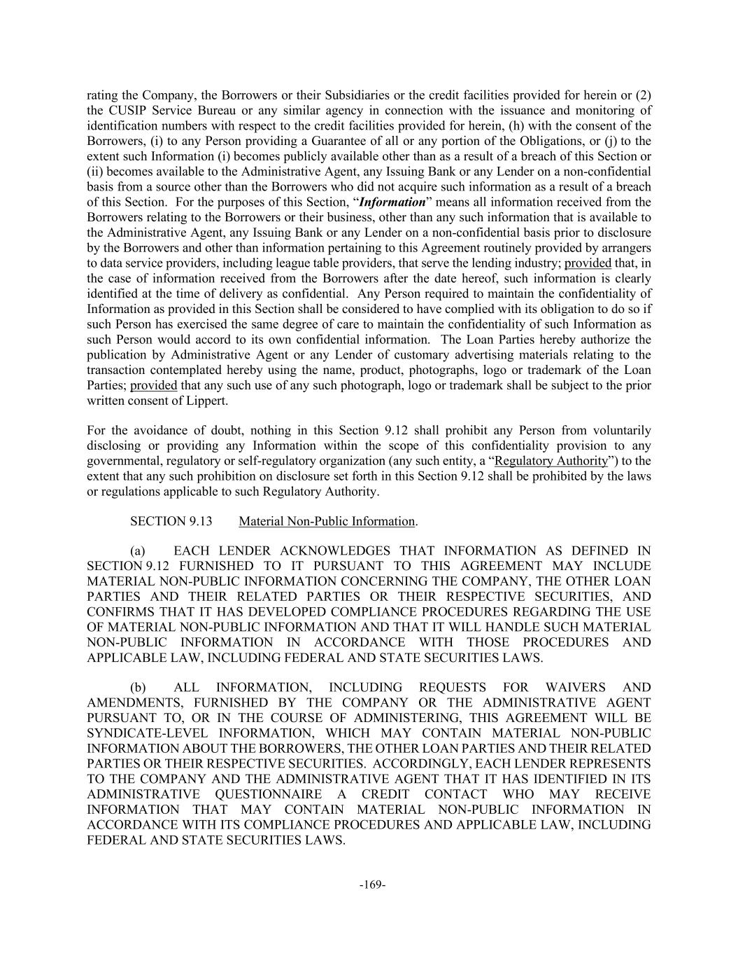 -169- rating the Company, the Borrowers or their Subsidiaries or the credit facilities provided for herein or (2) the CUSIP Service Bureau or any similar agency in connection with the issuance and monitoring of identification numbers with respect to the credit facilities provided for herein, (h) with the consent of the Borrowers, (i) to any Person providing a Guarantee of all or any portion of the Obligations, or (j) to the extent such Information (i) becomes publicly available other than as a result of a breach of this Section or (ii) becomes available to the Administrative Agent, any Issuing Bank or any Lender on a non-confidential basis from a source other than the Borrowers who did not acquire such information as a result of a breach of this Section. For the purposes of this Section, “Information” means all information received from the Borrowers relating to the Borrowers or their business, other than any such information that is available to the Administrative Agent, any Issuing Bank or any Lender on a non-confidential basis prior to disclosure by the Borrowers and other than information pertaining to this Agreement routinely provided by arrangers to data service providers, including league table providers, that serve the lending industry; provided that, in the case of information received from the Borrowers after the date hereof, such information is clearly identified at the time of delivery as confidential. Any Person required to maintain the confidentiality of Information as provided in this Section shall be considered to have complied with its obligation to do so if such Person has exercised the same degree of care to maintain the confidentiality of such Information as such Person would accord to its own confidential information. The Loan Parties hereby authorize the publication by Administrative Agent or any Lender of customary advertising materials relating to the transaction contemplated hereby using the name, product, photographs, logo or trademark of the Loan Parties; provided that any such use of any such photograph, logo or trademark shall be subject to the prior written consent of Lippert. For the avoidance of doubt, nothing in this Section 9.12 shall prohibit any Person from voluntarily disclosing or providing any Information within the scope of this confidentiality provision to any governmental, regulatory or self-regulatory organization (any such entity, a “Regulatory Authority”) to the extent that any such prohibition on disclosure set forth in this Section 9.12 shall be prohibited by the laws or regulations applicable to such Regulatory Authority. SECTION 9.13 Material Non-Public Information. (a) EACH LENDER ACKNOWLEDGES THAT INFORMATION AS DEFINED IN SECTION 9.12 FURNISHED TO IT PURSUANT TO THIS AGREEMENT MAY INCLUDE MATERIAL NON-PUBLIC INFORMATION CONCERNING THE COMPANY, THE OTHER LOAN PARTIES AND THEIR RELATED PARTIES OR THEIR RESPECTIVE SECURITIES, AND CONFIRMS THAT IT HAS DEVELOPED COMPLIANCE PROCEDURES REGARDING THE USE OF MATERIAL NON-PUBLIC INFORMATION AND THAT IT WILL HANDLE SUCH MATERIAL NON-PUBLIC INFORMATION IN ACCORDANCE WITH THOSE PROCEDURES AND APPLICABLE LAW, INCLUDING FEDERAL AND STATE SECURITIES LAWS. (b) ALL INFORMATION, INCLUDING REQUESTS FOR WAIVERS AND AMENDMENTS, FURNISHED BY THE COMPANY OR THE ADMINISTRATIVE AGENT PURSUANT TO, OR IN THE COURSE OF ADMINISTERING, THIS AGREEMENT WILL BE SYNDICATE-LEVEL INFORMATION, WHICH MAY CONTAIN MATERIAL NON-PUBLIC INFORMATION ABOUT THE BORROWERS, THE OTHER LOAN PARTIES AND THEIR RELATED PARTIES OR THEIR RESPECTIVE SECURITIES. ACCORDINGLY, EACH LENDER REPRESENTS TO THE COMPANY AND THE ADMINISTRATIVE AGENT THAT IT HAS IDENTIFIED IN ITS ADMINISTRATIVE QUESTIONNAIRE A CREDIT CONTACT WHO MAY RECEIVE INFORMATION THAT MAY CONTAIN MATERIAL NON-PUBLIC INFORMATION IN ACCORDANCE WITH ITS COMPLIANCE PROCEDURES AND APPLICABLE LAW, INCLUDING FEDERAL AND STATE SECURITIES LAWS.