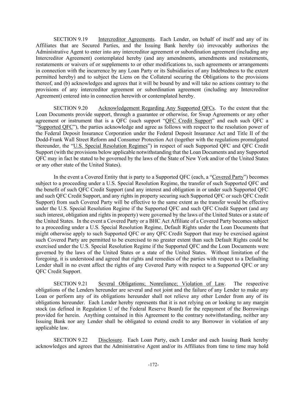 -172- SECTION 9.19 Intercreditor Agreements. Each Lender, on behalf of itself and any of its Affiliates that are Secured Parties, and the Issuing Bank hereby (a) irrevocably authorizes the Administrative Agent to enter into any intercreditor agreement or subordination agreement (including any Intercreditor Agreement) contemplated hereby (and any amendments, amendments and restatements, restatements or waivers of or supplements to or other modifications to, such agreements or arrangements in connection with the incurrence by any Loan Party or its Subsidiaries of any Indebtedness to the extent permitted hereby) and to subject the Liens on the Collateral securing the Obligations to the provisions thereof, and (b) acknowledges and agrees that it will be bound by and will take no actions contrary to the provisions of any intercreditor agreement or subordination agreement (including any Intercreditor Agreement) entered into in connection herewith or contemplated hereby. SECTION 9.20 Acknowledgement Regarding Any Supported QFCs. To the extent that the Loan Documents provide support, through a guarantee or otherwise, for Swap Agreements or any other agreement or instrument that is a QFC (such support “QFC Credit Support” and each such QFC a “Supported QFC”), the parties acknowledge and agree as follows with respect to the resolution power of the Federal Deposit Insurance Corporation under the Federal Deposit Insurance Act and Title II of the Dodd-Frank Wall Street Reform and Consumer Protection Act (together with the regulations promulgated thereunder, the “U.S. Special Resolution Regimes”) in respect of such Supported QFC and QFC Credit Support (with the provisions below applicable notwithstanding that the Loan Documents and any Supported QFC may in fact be stated to be governed by the laws of the State of New York and/or of the United States or any other state of the United States). In the event a Covered Entity that is party to a Supported QFC (each, a “Covered Party”) becomes subject to a proceeding under a U.S. Special Resolution Regime, the transfer of such Supported QFC and the benefit of such QFC Credit Support (and any interest and obligation in or under such Supported QFC and such QFC Credit Support, and any rights in property securing such Supported QFC or such QFC Credit Support) from such Covered Party will be effective to the same extent as the transfer would be effective under the U.S. Special Resolution Regime if the Supported QFC and such QFC Credit Support (and any such interest, obligation and rights in property) were governed by the laws of the United States or a state of the United States. In the event a Covered Party or a BHC Act Affiliate of a Covered Party becomes subject to a proceeding under a U.S. Special Resolution Regime, Default Rights under the Loan Documents that might otherwise apply to such Supported QFC or any QFC Credit Support that may be exercised against such Covered Party are permitted to be exercised to no greater extent than such Default Rights could be exercised under the U.S. Special Resolution Regime if the Supported QFC and the Loan Documents were governed by the laws of the United States or a state of the United States. Without limitation of the foregoing, it is understood and agreed that rights and remedies of the parties with respect to a Defaulting Lender shall in no event affect the rights of any Covered Party with respect to a Supported QFC or any QFC Credit Support. SECTION 9.21 Several Obligations; Nonreliance; Violation of Law. The respective obligations of the Lenders hereunder are several and not joint and the failure of any Lender to make any Loan or perform any of its obligations hereunder shall not relieve any other Lender from any of its obligations hereunder. Each Lender hereby represents that it is not relying on or looking to any margin stock (as defined in Regulation U of the Federal Reserve Board) for the repayment of the Borrowings provided for herein. Anything contained in this Agreement to the contrary notwithstanding, neither any Issuing Bank nor any Lender shall be obligated to extend credit to any Borrower in violation of any applicable law. SECTION 9.22 Disclosure. Each Loan Party, each Lender and each Issuing Bank hereby acknowledges and agrees that the Administrative Agent and/or its Affiliates from time to time may hold