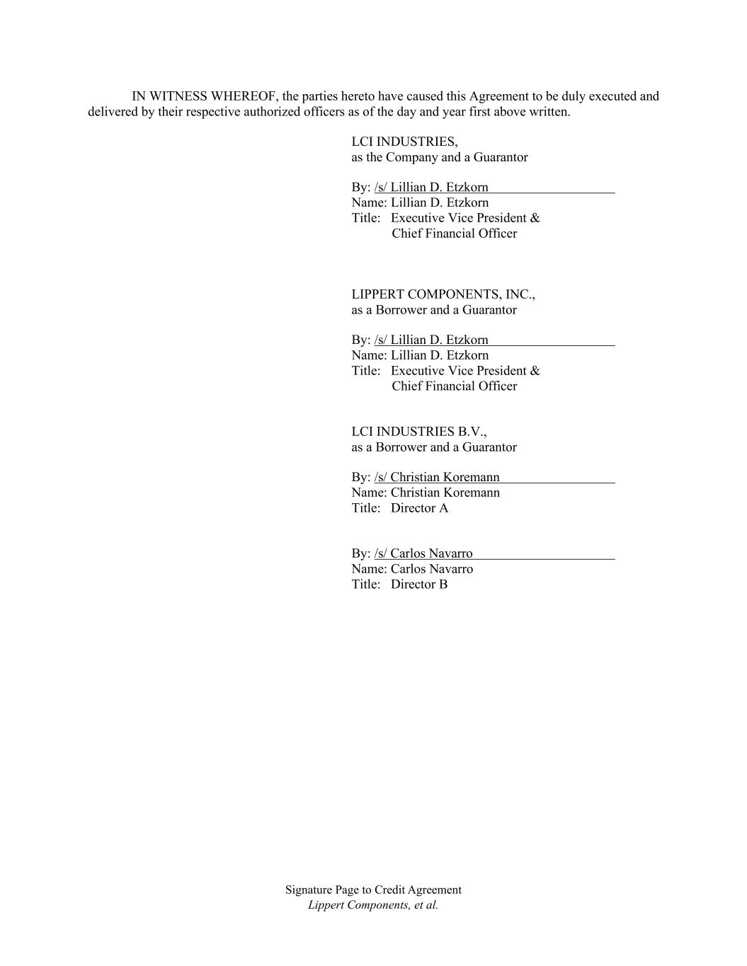 Signature Page to Credit Agreement Lippert Components, et al. IN WITNESS WHEREOF, the parties hereto have caused this Agreement to be duly executed and delivered by their respective authorized officers as of the day and year first above written. LCI INDUSTRIES, as the Company and a Guarantor By: /s/ Lillian D. Etzkorn Name: Lillian D. Etzkorn Title: Executive Vice President & Chief Financial Officer LIPPERT COMPONENTS, INC., as a Borrower and a Guarantor By: /s/ Lillian D. Etzkorn Name: Lillian D. Etzkorn Title: Executive Vice President & Chief Financial Officer LCI INDUSTRIES B.V., as a Borrower and a Guarantor By: /s/ Christian Koremann Name: Christian Koremann Title: Director A By: /s/ Carlos Navarro Name: Carlos Navarro Title: Director B